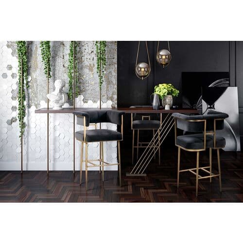 Comfort and style come together in this barstool. Plush velvet upholstery and generous padding create a seat you'll want to stay in. The golden frame, channeled back and arms, and sculptural silhouette are designed to catch the eye.