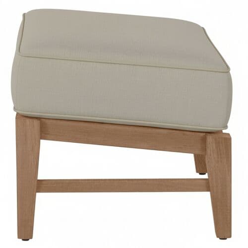This adaptable outdoor ottoman improves your exterior living area. Made from marine-grade teak, it boasts a subtly slanted, slatted surface with a natural finish highlighting its grain beauty. The foam-and-fiber cushion is encased in Sunbrella fabric, which is simple to maintain, solution-dyed, and resistant to color fading, mold, and soil.