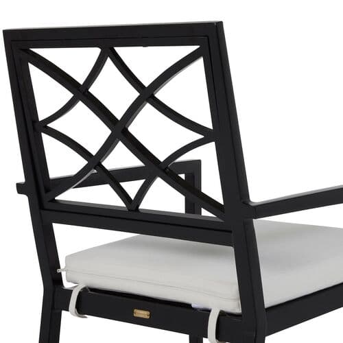 Choose a stylish armchair for your outdoor area, complete with a wrought aluminum frame and lattice back. The foam-filled cushion is wrapped in a weatherproof, solution-dyed acrylic fabric to ensure comfort and long-lasting use.