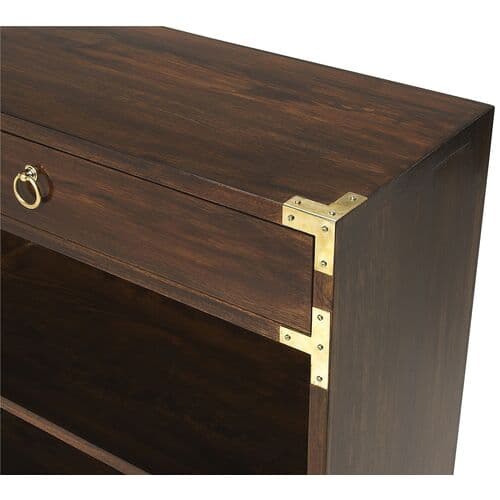 Featuring a rich brown finish in a campaign style, this bookcase fits with almost any decor. It provides three surfaces and a drawer for ample storage and display, accented by brass corner brackets.