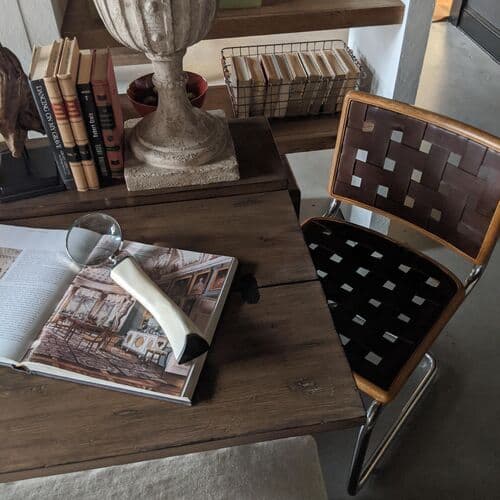 Featuring a vintage-inspired design, this barstool combines beautifully grained oak, premium top-grain leather, and a steel base with a polished nickel finish.
