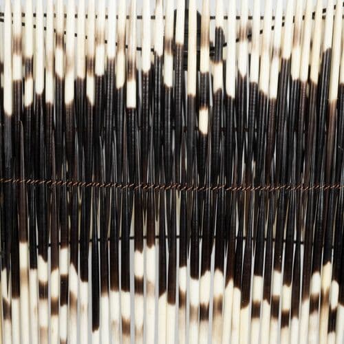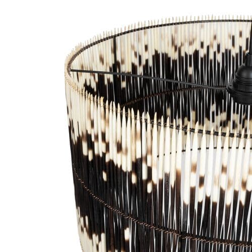Porcupine quills are sustainably collected and bound to form the distinctive drum shade of this light fixture. Due to the natural variability of the materials, each pendant features a unique appearance.