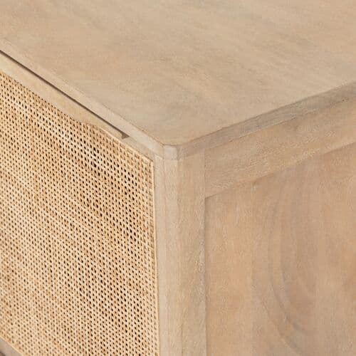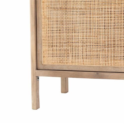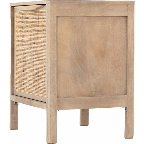 The woven-cane door adds texture to the sturdy mango-wood frame of this nightstand. Its warm brown finish offers timeless elegance. Inside, behind the right-hinged door, you'll find a shelf that can be removed for convenience.
