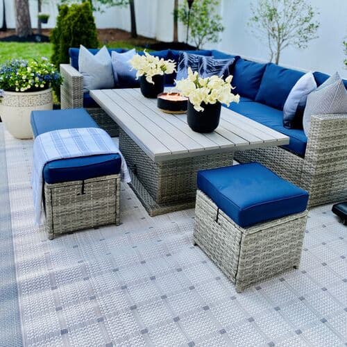 Featuring a geometric pattern, this durable rug adds elegance to porches, patios, or entryways. Suitable for high-traffic indoor or outdoor spaces, it is easy to clean and can be washed with a hose. The rug is Oeko-Tex Standard 100 certified, ensuring it has been tested for harmful substances. Use a rug pad to help prevent slipping.