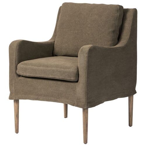 Inspired by heritage comfort, this chair features sloping track arms designed to create playful forms. The fluid frame gives a polished look, while its tapered legs extend beyond a short skirt to offer a relaxed style. Upholstered in 100% linen, it provides simple elegance.
