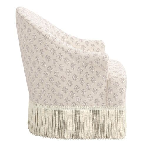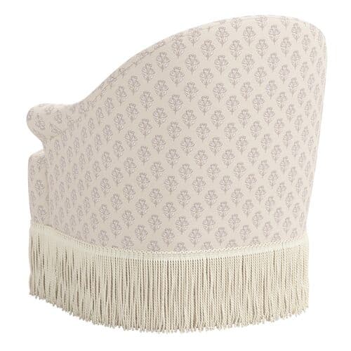 Experience the blend of comfort and elegance with the Marie Swivel Chair, an ideal accent for any room. Perfect for leisure activities like sipping tea or reading, this chair complements any setting. The fringe trim provides a unique textural contrast to the upholstery. Embrace both versatility and style with each moment in the Marie Swivel Chair. Available exclusively from the Stoffer Home, crafted by Cloth & Company.