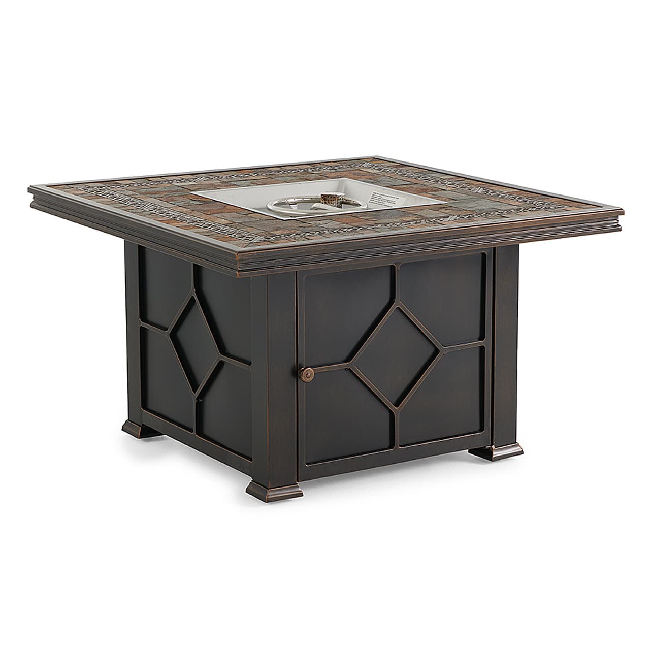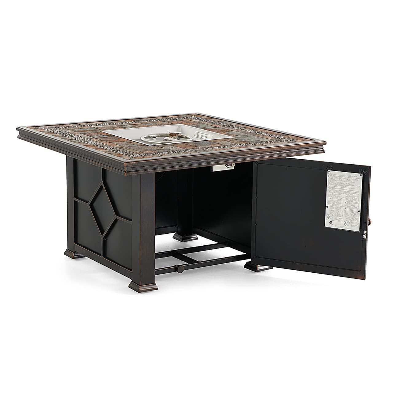 Siesta Seating Collection offers a contemporary touch to any backyard. Handcrafted with large resin wicker strands on a powder-coated aluminum frame, each chair promises durability outdoors. The club chairs feature wide arms and square feet for added comfort. Set includes deluxe cushions on sling seat suspension for ultimate relaxation. Fire pit has a square aluminum frame with a red slate top, ideal for more than aesthetics. Rust-proof frame and powder-coated steel fire bowl ensure long-lasting fires. Includes 4 club chairs with cushions and a fire pit. Features extruded aluminum frames, synthetic wicker, and Textilene sling seats. Fire pit includes a 55,000 BTU stainless steel burner, match-light ignition, and durable aluminum base. Finished with UV-resistant powder coat and slate top. LP tank storage pulls open for up to 20 lb. LP tank. Assembly required, lava rock sold separately, tank not included. Cushions are made with solution-dyed Sunbrella fabric, offering UV, fade, mold, mildew, spill, and stain resistance. Foam core interior ensures long-lasting comfort, while back cushions are designed for softness.