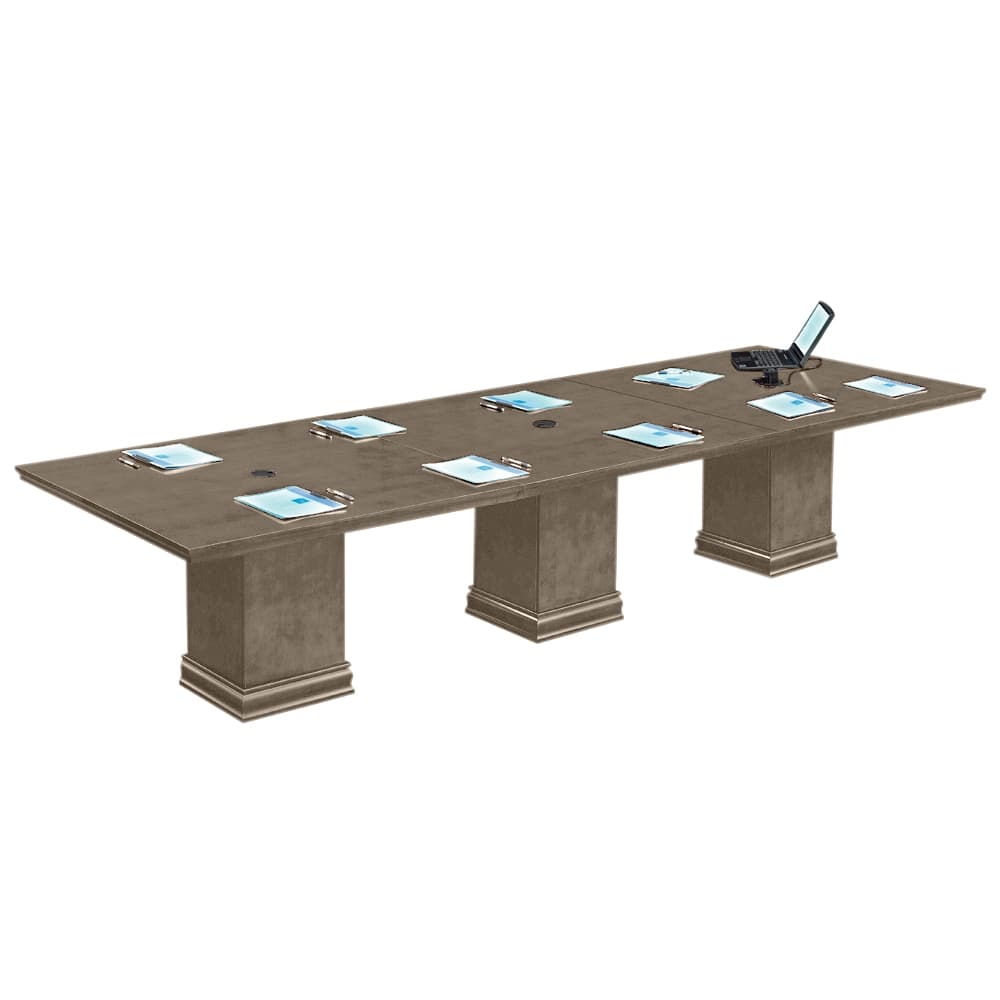 Furnish your conference room with our versatile and traditional-style 12' Conference Table. Its unique connection system allows easy installation and mobility, with four square sections. Made of genuine maple veneer, it features traditional moldings for strength and elegance. The 2'' thick table edge enhances durability. Includes one wire grommet per 4' section for cord management. Optional power and connection pop-up enhance adaptability. Assembly required, with pop-up data port sold separately. Available in various finishes including Chestnut Cherry, Gray, Ash Black, Deep Walnut, and Espresso. Note: Statesman gray has taupe and amber undertones for a