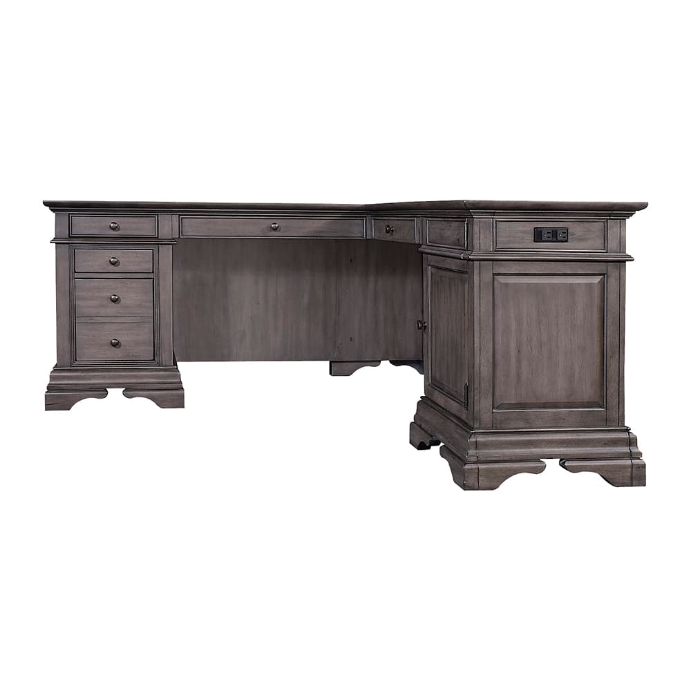 Enhance your home or private office with the Kensley L-Shaped Desk, combining traditional style with modern functionality. Designed for convenience and organization, the desk features a file drawer for document storage and a removable partition organizer to keep items orderly. The desk's return includes a cabinet with shelving for additional storage needs. A drop-front keyboard drawer provides a space-saving solution for your keyboard, while dual A/C outlets offer easy access to power. Two utility drawers and cord management features help keep cables organized. Felt-lined drawers add a touch of elegance and protect your belongings, with full-extension, steel ball bearing drawer slides ensuring smooth access. The Kensley Collection showcases relaxed traditional style and quality craftsmanship, including built-in Qi wireless charging, USB ports, AC outlets, locking file drawers, and cleverly styled drawers hidden in the molding. Assembly is required.