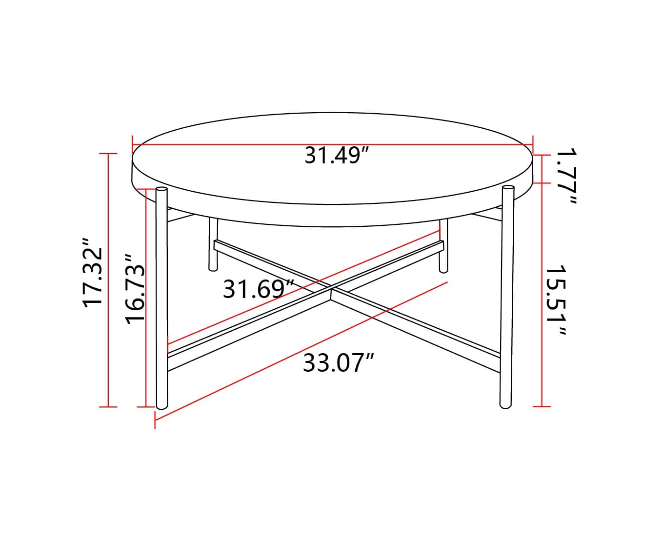 Enhance your living room with the 33" Modern Thread Design Round Coffee Table. It features a high-quality MDF tabletop and sturdy metal cross-legs base for style and durability. Ideal for displaying decorative pieces or storing magazines, beverages, and snacks, it offers additional space underneath for flexibility. Easy to assemble and maintain, this table accommodates daily needs with a load-bearing capacity of 220 lbs.