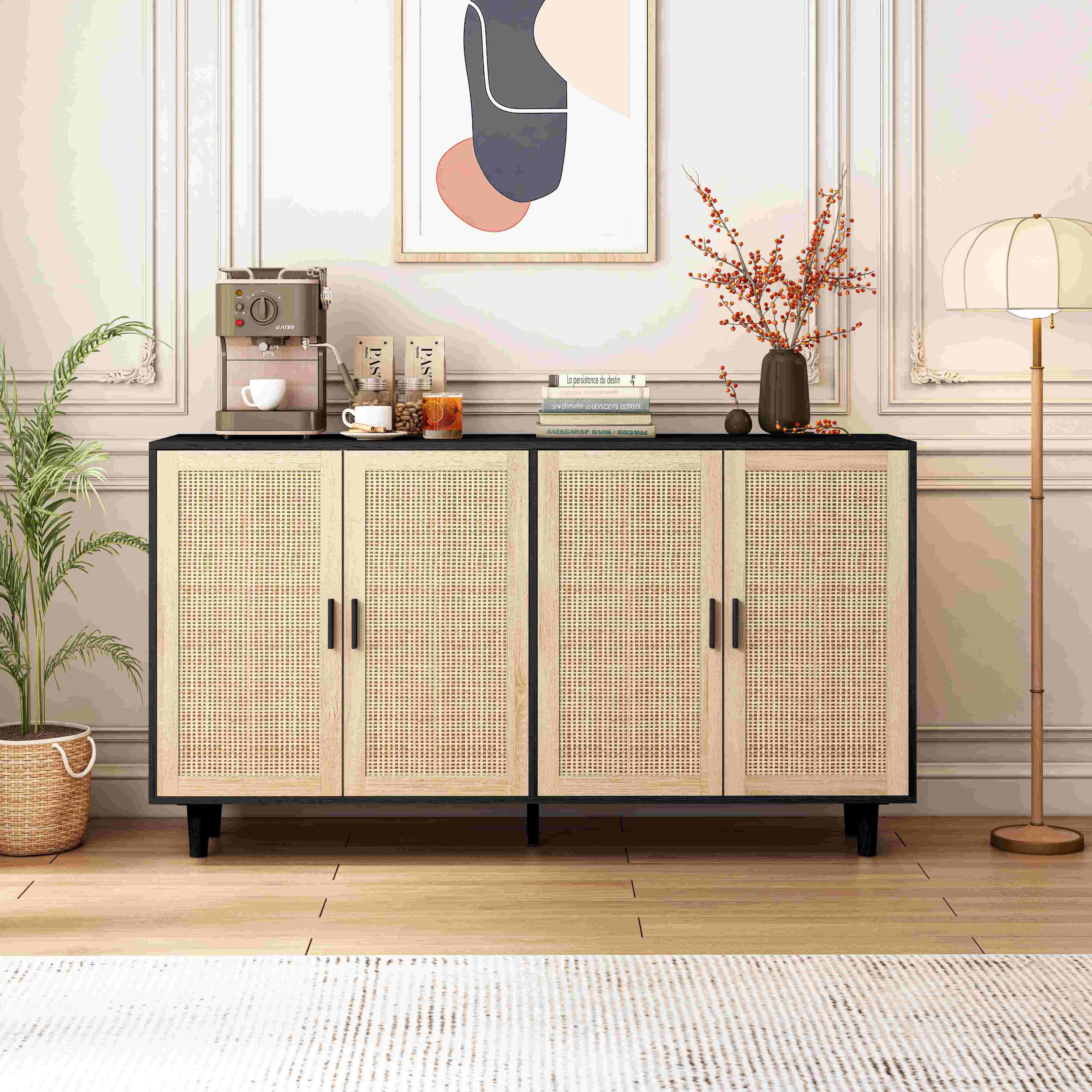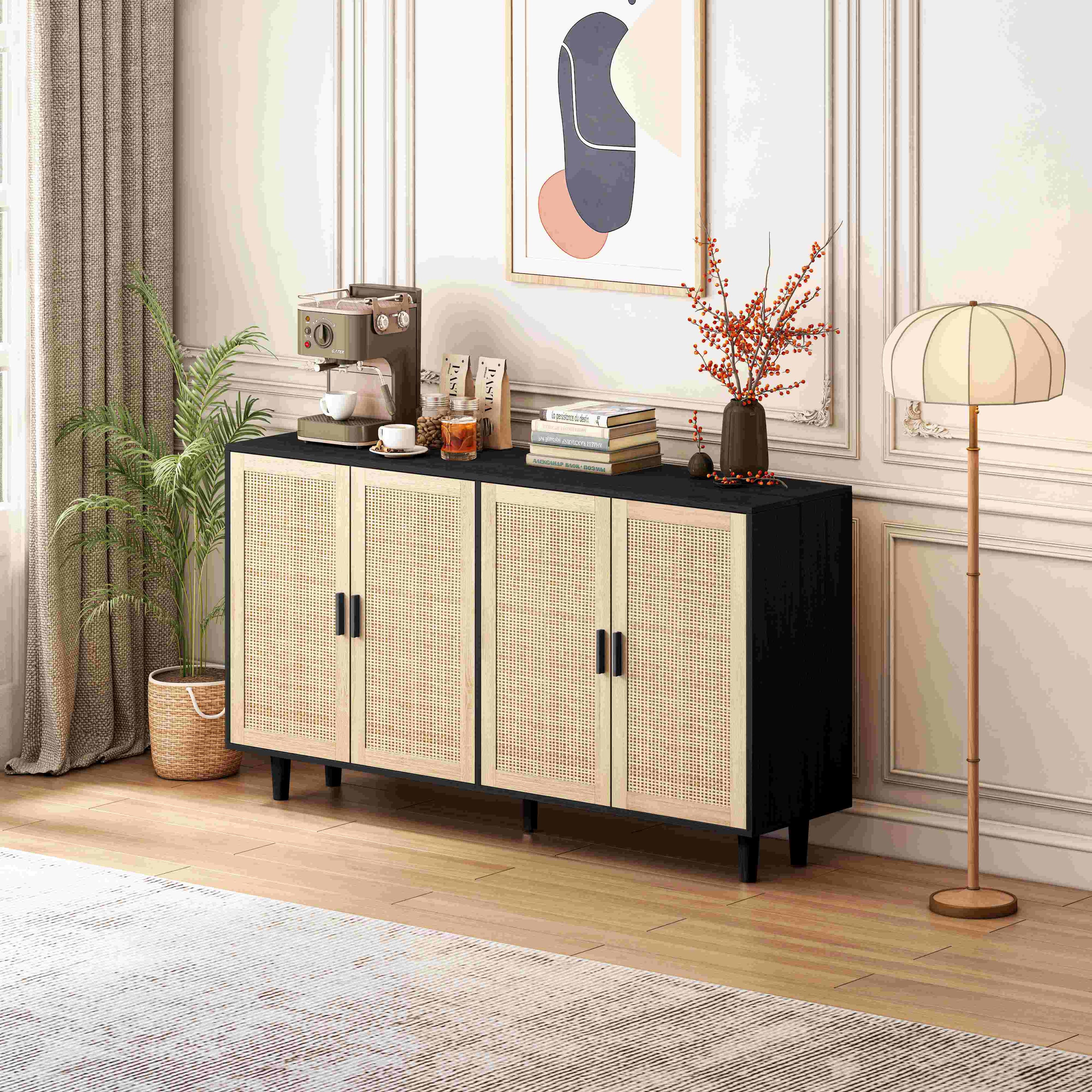 Add elegance to your home decor with the 4-Door Rattan Storage Cabinet, measuring 62.20" in length. Constructed from quality particle board and solid wood legs, it features stylish rattan doors that provide ample storage. Its versatile design suits any room, blending with a variety of interior styles. Easy assembly and maintenance enhance its practicality and timeless appeal.