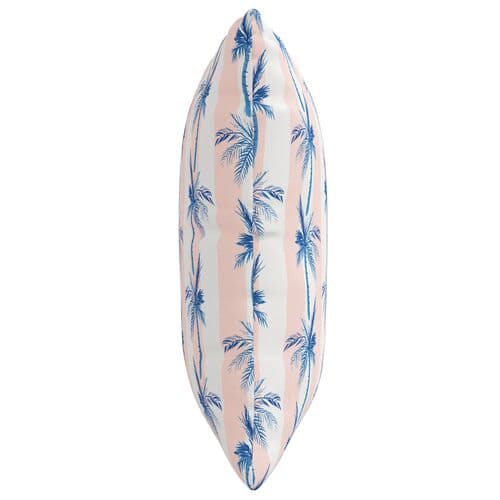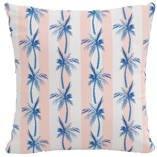 Decorated with palm trees and cabana stripes, this pillow serves as a lively addition for any patio, porch, or pool area. The design is printed on both sides for a vibrant look.