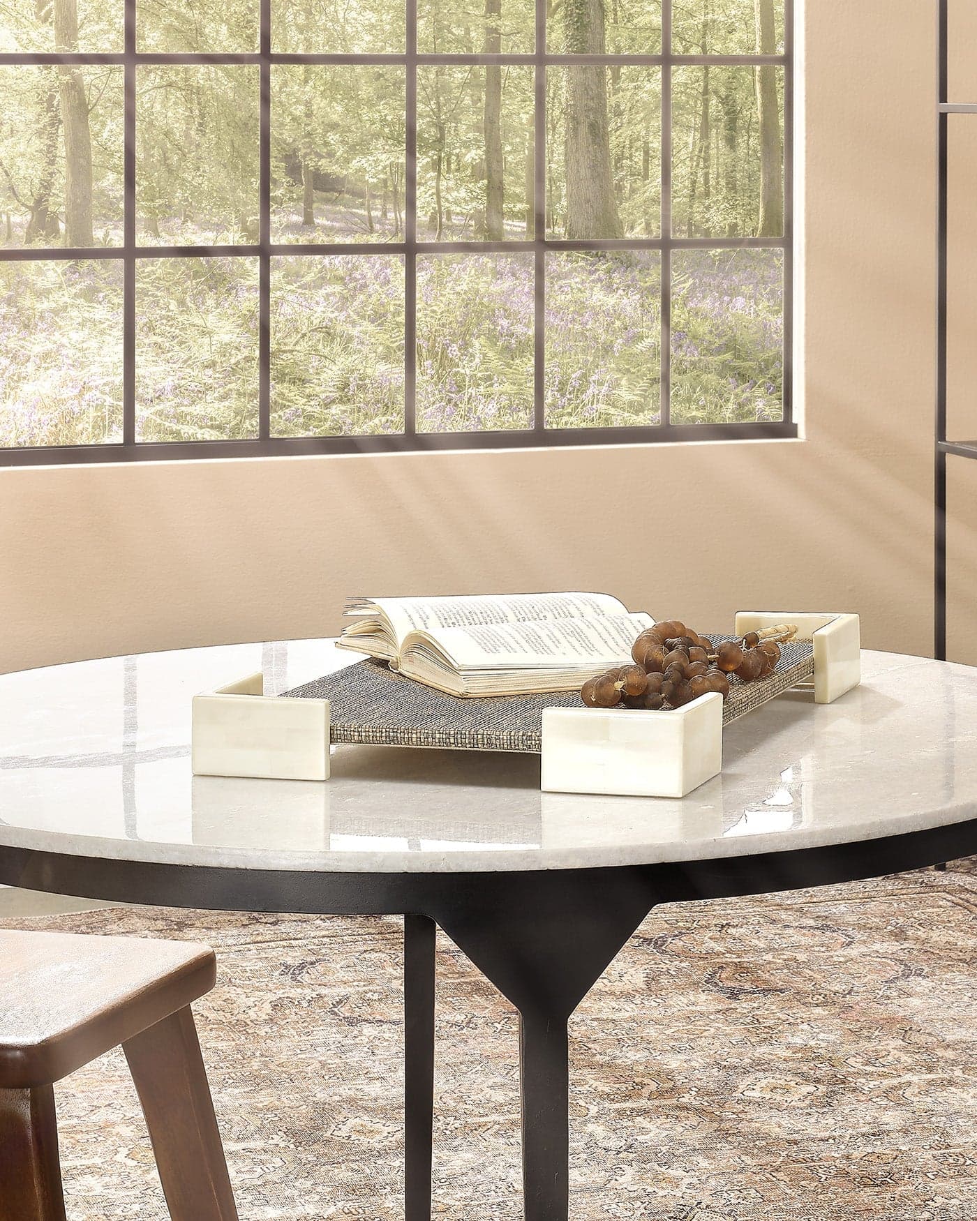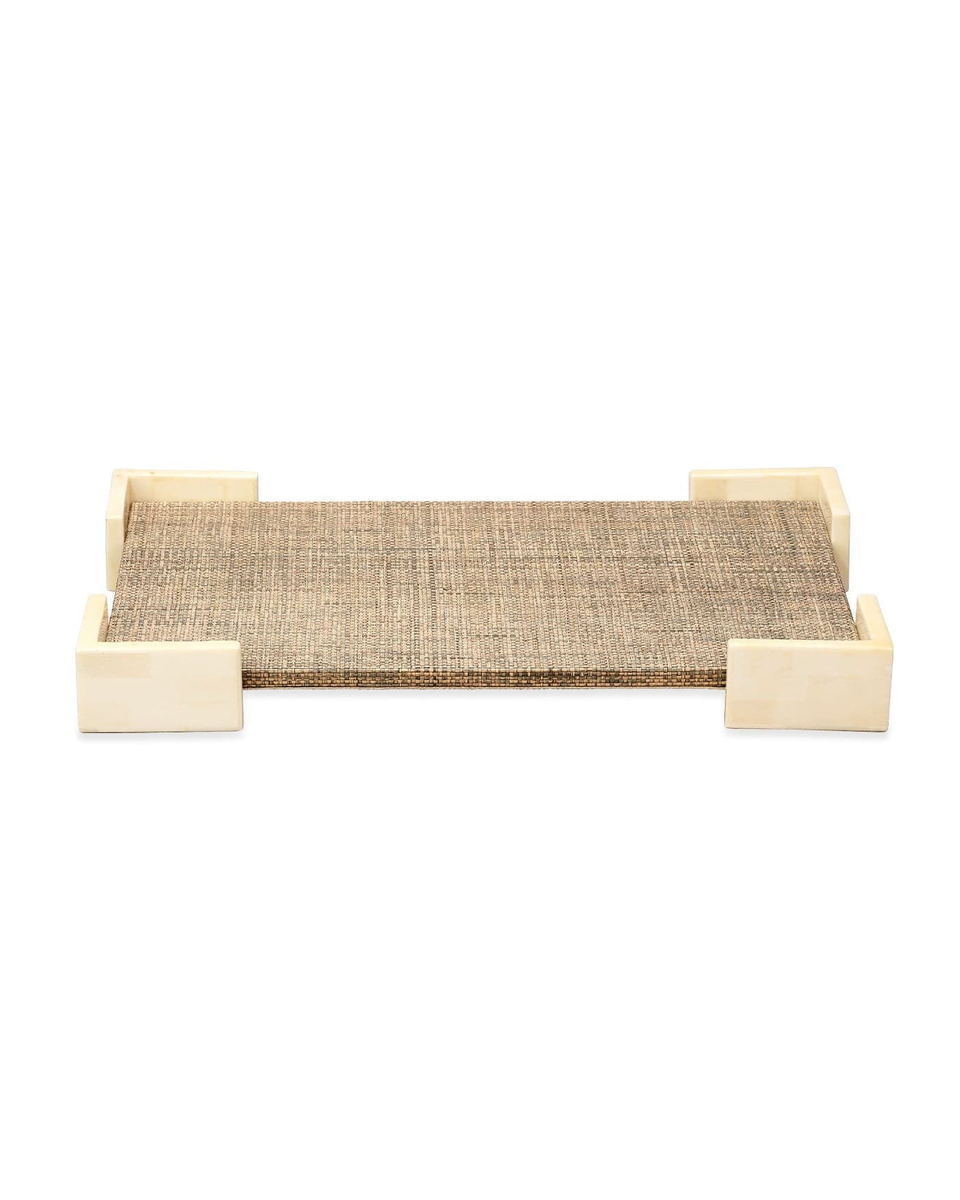 Beautiful bone is paired with woven raffia to create a decorative tray of unusual beauty. Lined with beige ultra suede, it can be piled with books or Topped with a collection of small decorative items. With an easily integrated neutral palette and bold but simple design, it also makes an ideal addition to a workspace.