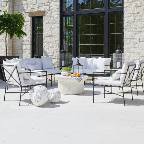 The Italia Collection features outdoor seating with a classic aesthetic, crafted from heavy wrought iron for enduring use. This Low Back Sofa includes elegant details seen in the Italia Loveseat, such as a slender Black Hammered Iron frame and X crossbar support, along with an enlarged seating area. The sofa comes with custom fabric-covered, flanged cushions arranged three-over-three, making it comfortable and spacious.