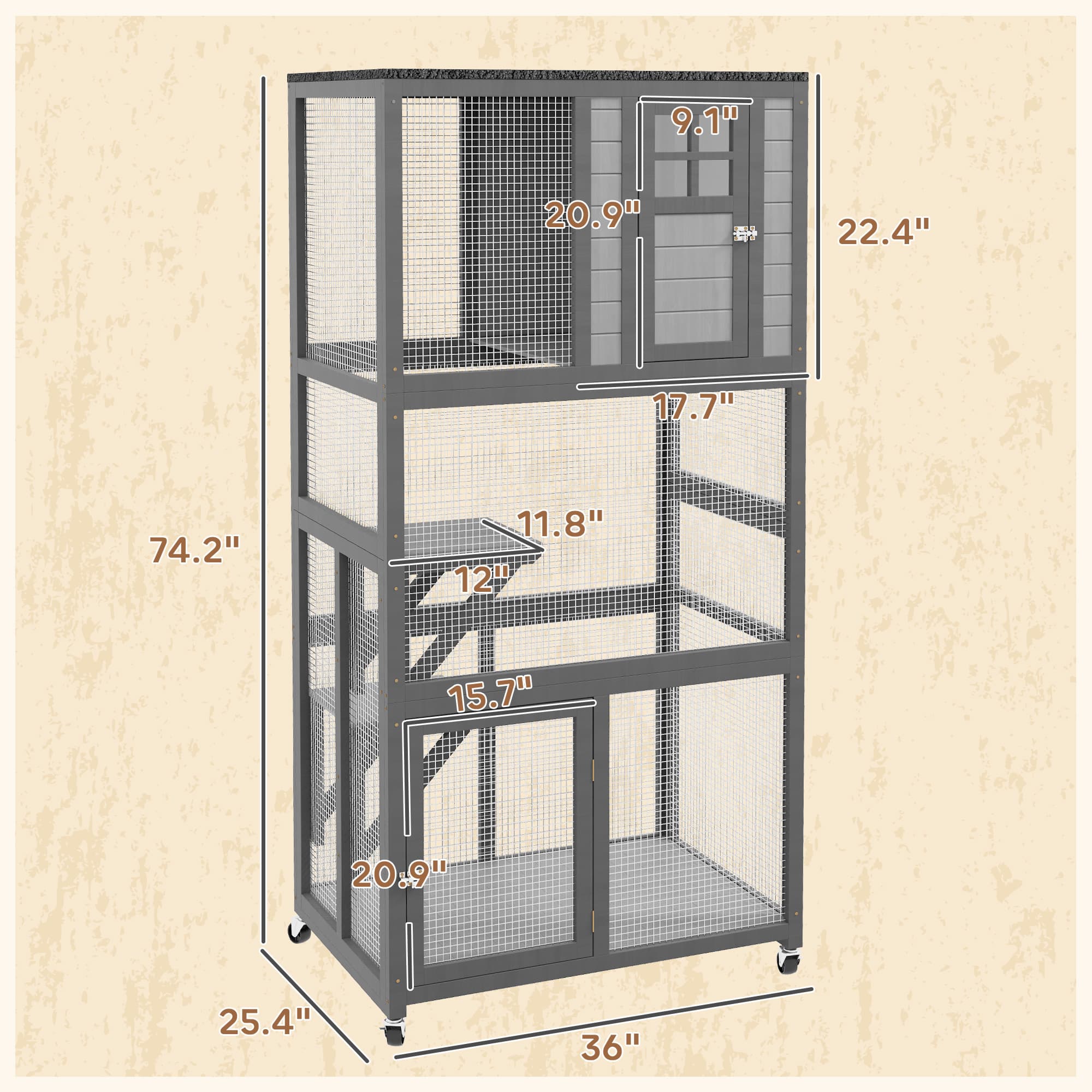 PawHut 74" Wooden Outdoor Cat House Catio with High Weight Capacity, Cat Cage Condo, Light Gray | Aosom.com