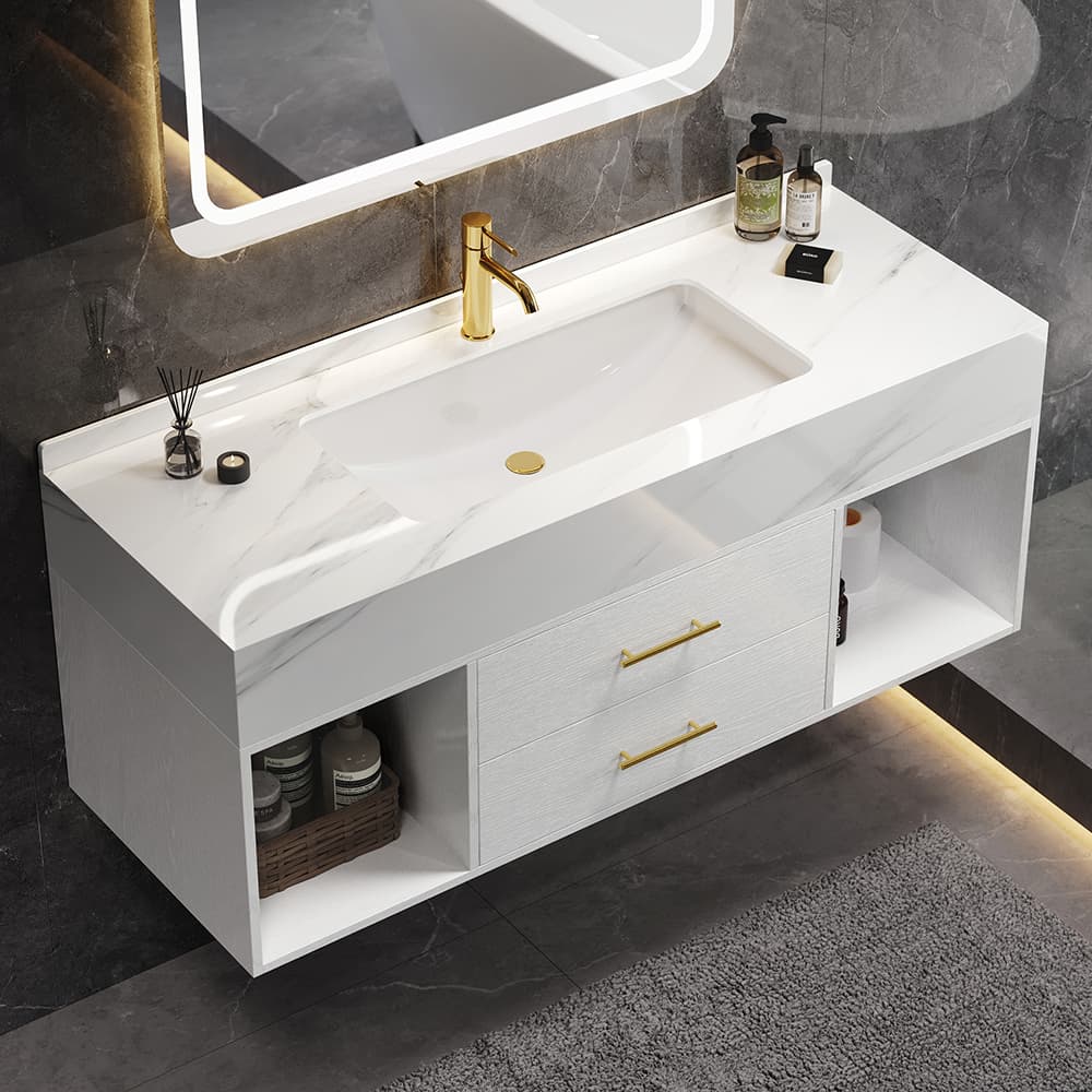 Elevate your bathroom with a wall-mounted vanity featuring elegant design and practical storage. Enjoy a beautiful contrast between the solid wood base and the stone countertop. Enhanced with gold-finished metal hardware for a sophisticated touch. Includes a single sink, slate countertops with ceramic basins, and a multi-layer 0.6-inch solid wood panel. Designed with a waterproof surface technology to ensure longevity and ample storage space.