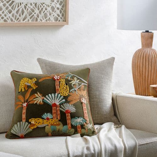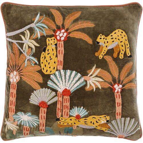 Junglesque Embroidered Pillow - Dark Green/Coral | Cushion, Bolster