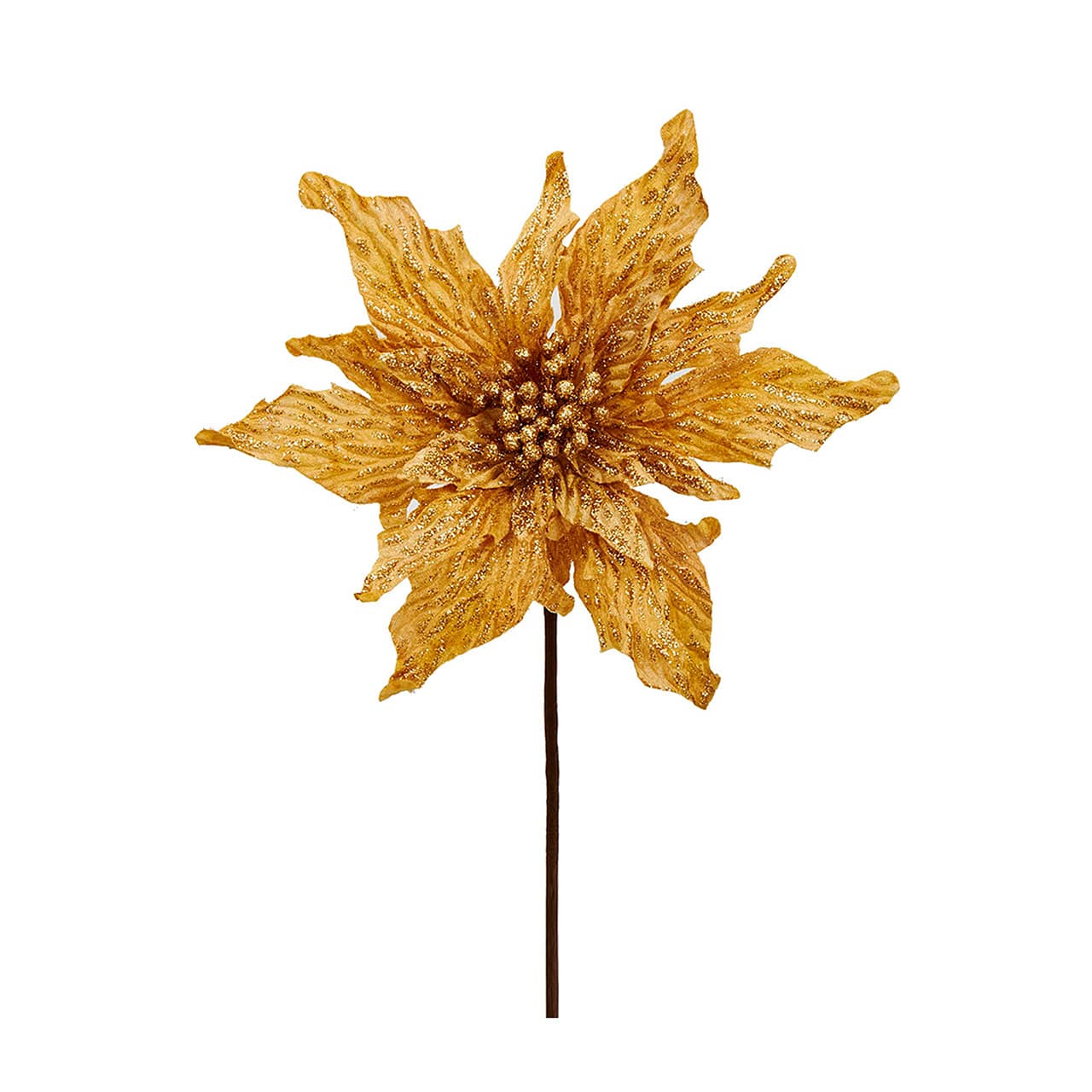 Enhance holiday decor with this Gold Velvet Poinsettia by Kurt Adler, featuring a wire design for versatile use in wreaths, garlands, or gifts. It is 14 inches tall, red, made of polyester, and designed for multiple purposes.