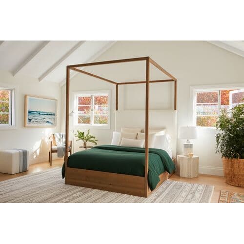 Crafted from oak with a warm finish, this canopy bed features a linen-upholstered headboard, adding height and style to your room without being overpowering. A mattress and box spring are required.