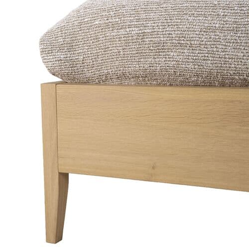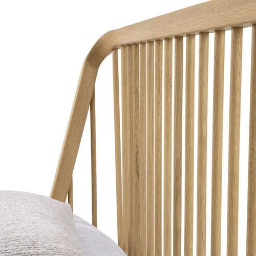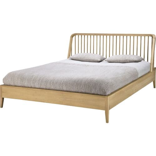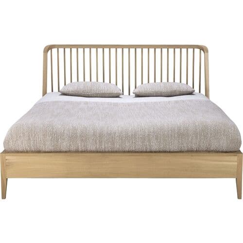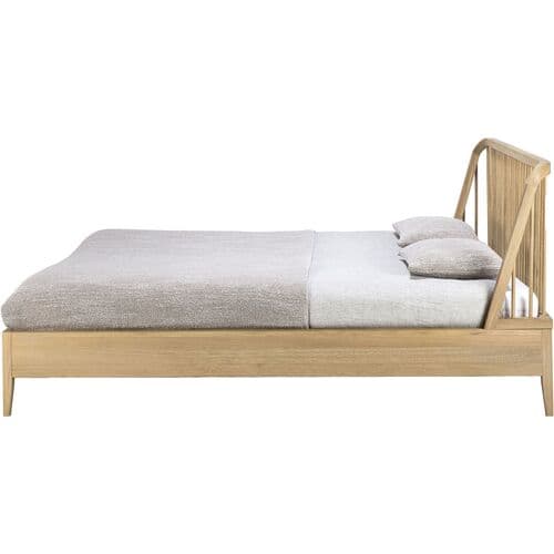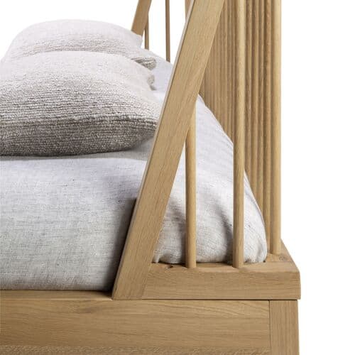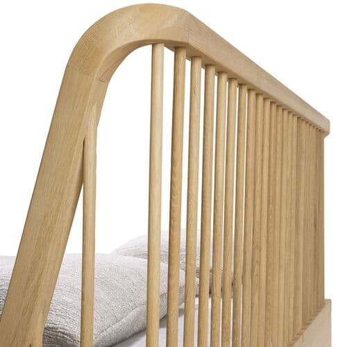 Inspired by traditional spinning wheels, the bed features a spoked headboard, while the tapered legs and minimal design add a modern touch. The hard-wax oil finish highlights the unique grain of the oak, a wood known for both beauty and durability.