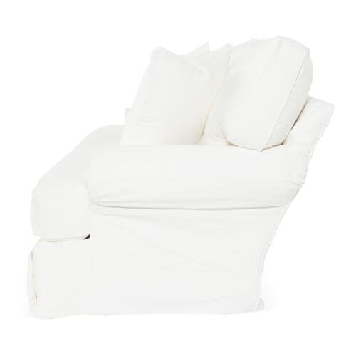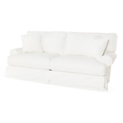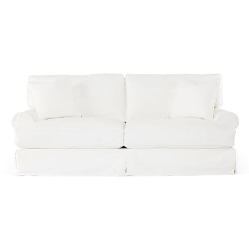 The sofa includes distinct welt lines, comfort wrinkles, and a casual skirt for a relaxed look. Its deep, plush seating offers a cozy yet firm feel to support your body. The Denim White slipcover is prewashed and machine washable for convenience. It comes with two pillows. Cushions are crafted from 1.8 density foam with ticking and fiber wrapping, while the back pillows feature microdenier fiber. This piece is handcrafted in the USA. Blending English charm with California casual, Rachel Ashwell's collection merges comfort with the beauty of imperfections and timeless practicality, epitomized by the Shabby Chic aesthetic. Ideal for adding a touch of classic charm, each item presents simple elegance and lasting appeal, as furniture should be both functional and comfortably inviting, according to Ashwell.