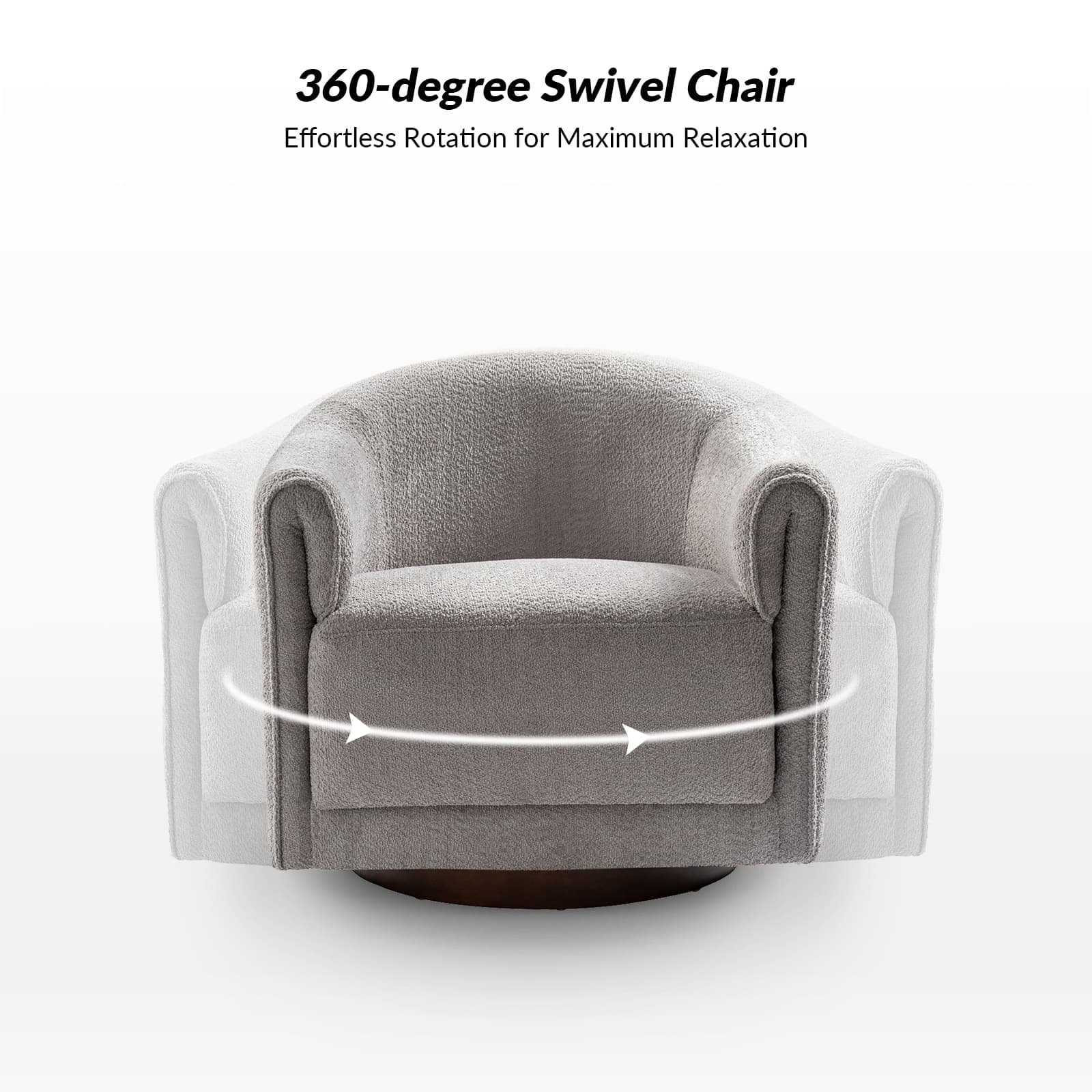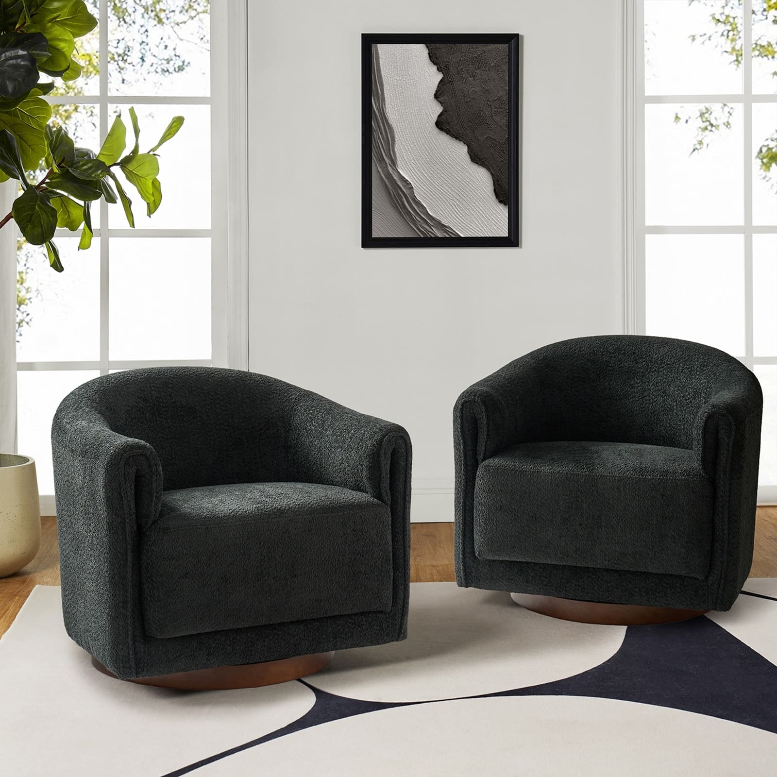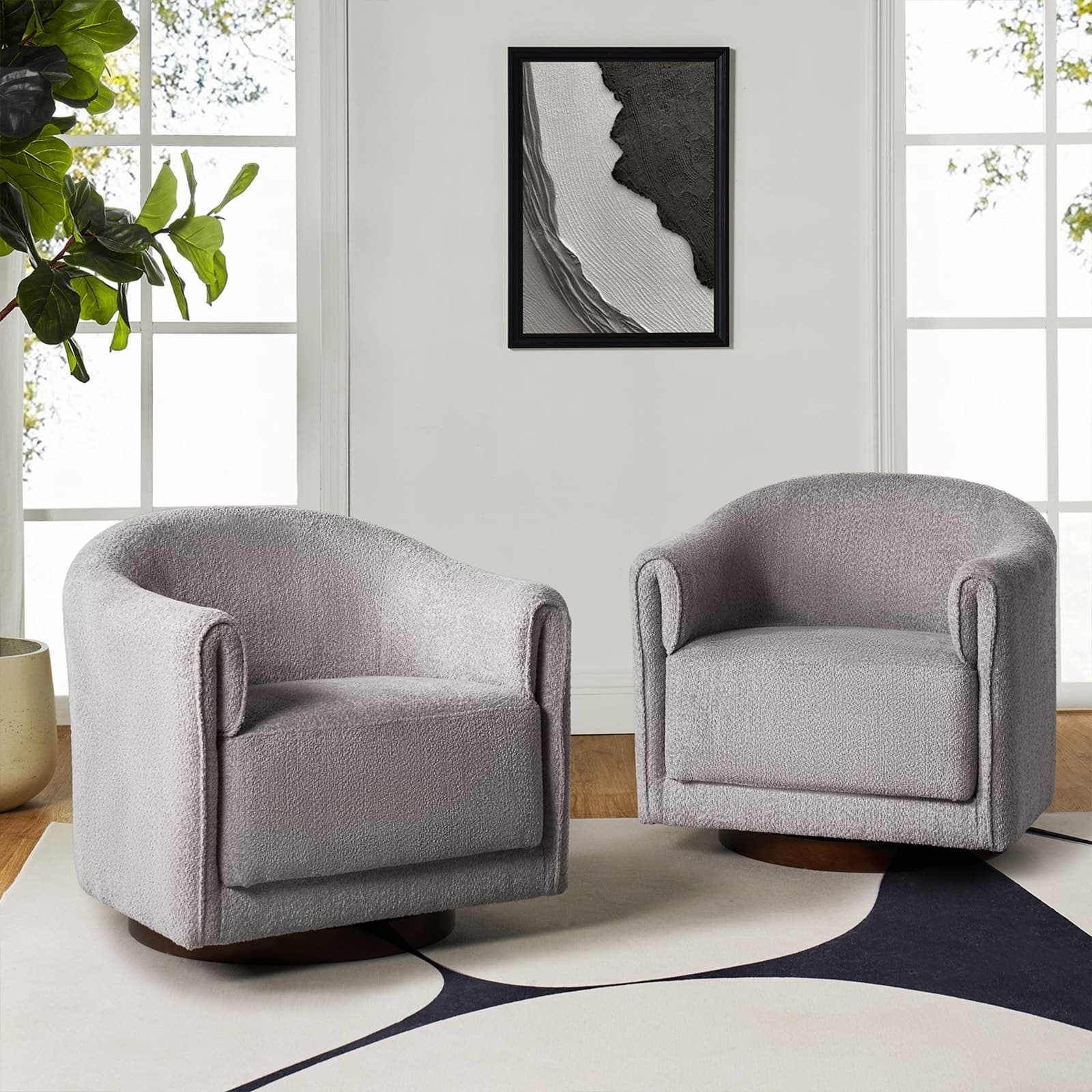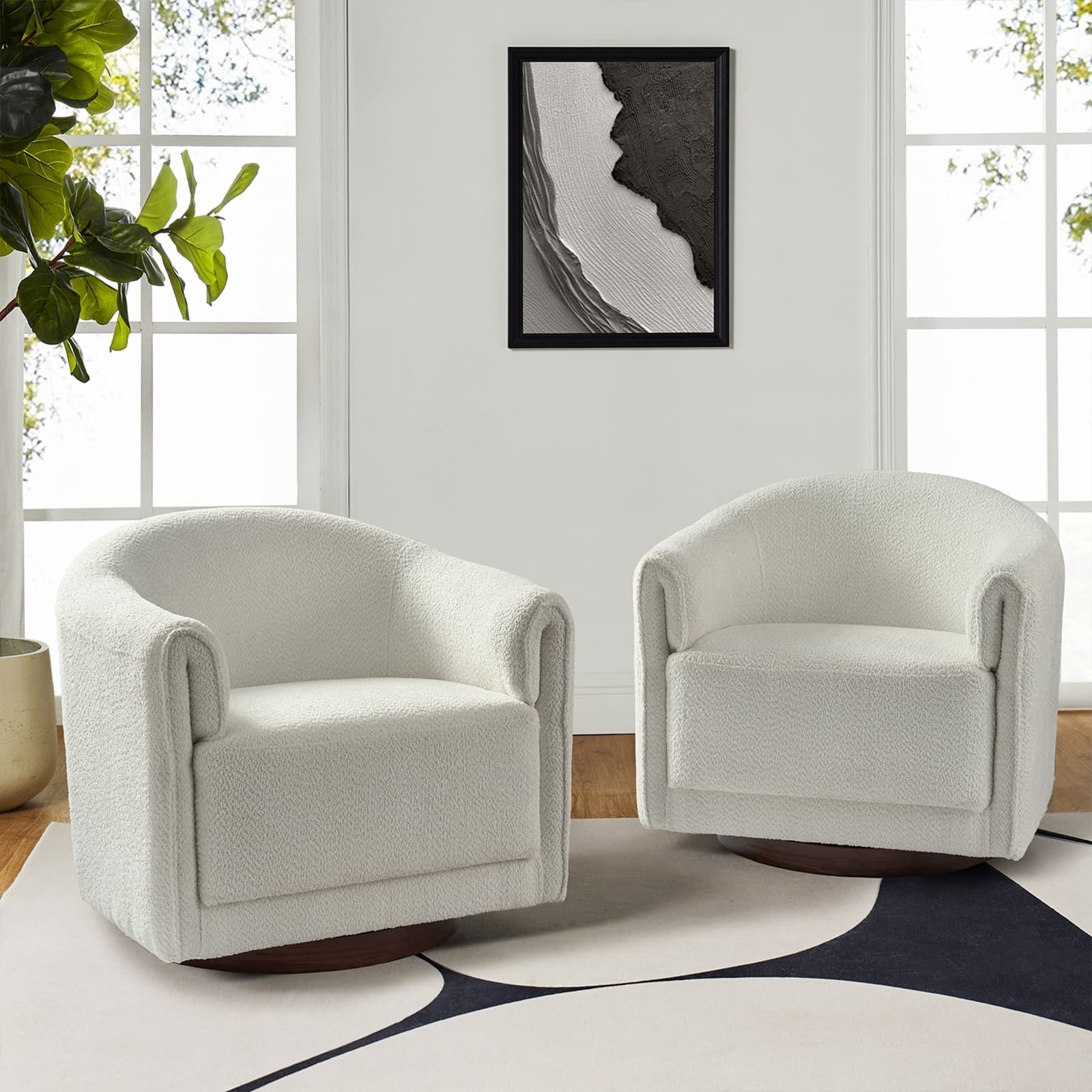 Experience a blend of modern style and functionality with this barrel swivel chair set. Designed to rotate a full 360 degrees, it offers flexibility and convenience. The sleek, contemporary design integrates seamlessly into various living room decors, including Italian contemporary, contemporary glam, ultra-modern, Scandinavian, and classic Boho styles. Enjoy comfort with the thick and wide cushion, enhancing your seating experience for relaxation or socializing. Fold-shaped armrests add extra comfort, ensuring a cozy feel for your arms. The sturdy wood base adds sophistication and value. Elevate your living room with this chair set, combining style, comfort, and convenience. PRODUCT INCLUDING: Two barrel chairs, no assembly required. EXQUISITE APPEARANCE: Designed to meet practical needs while adding unique charm, its simple and elegant appearance features smooth lines, high-quality materials, and attention to detail. 360º SMOOTH SWIVEL: Effortlessly rotate the chair in any direction, offering a complete range of motion and promoting an engaging atmosphere. SLEEK LOW-PROFILE DESIGN: The curved backrest follows body contours for ergonomic support and comfort, creating a visually striking silhouette. THICK AND COMFY CUSHION: The notably thick, soft, and plush cushion provides ample padding for enhanced comfort, making the seating experience more enjoyable and relaxing. Product Details Weight Capacity: 250 lbs Level of Assembly: Partial Assembly Frame Material: Solid and Manufactured Wood Back Fill Material: Foam Seat Fill Material: Foam Weights & Dimensions Item Size: 32"Wx30.5"Dx30"H Item Weight: 115.52 lbs Specifications Upholstered: Yes Arms Included: Yes Ottoman Included: No Instructions: Manual measurement may result in size errors. Country of Origin: