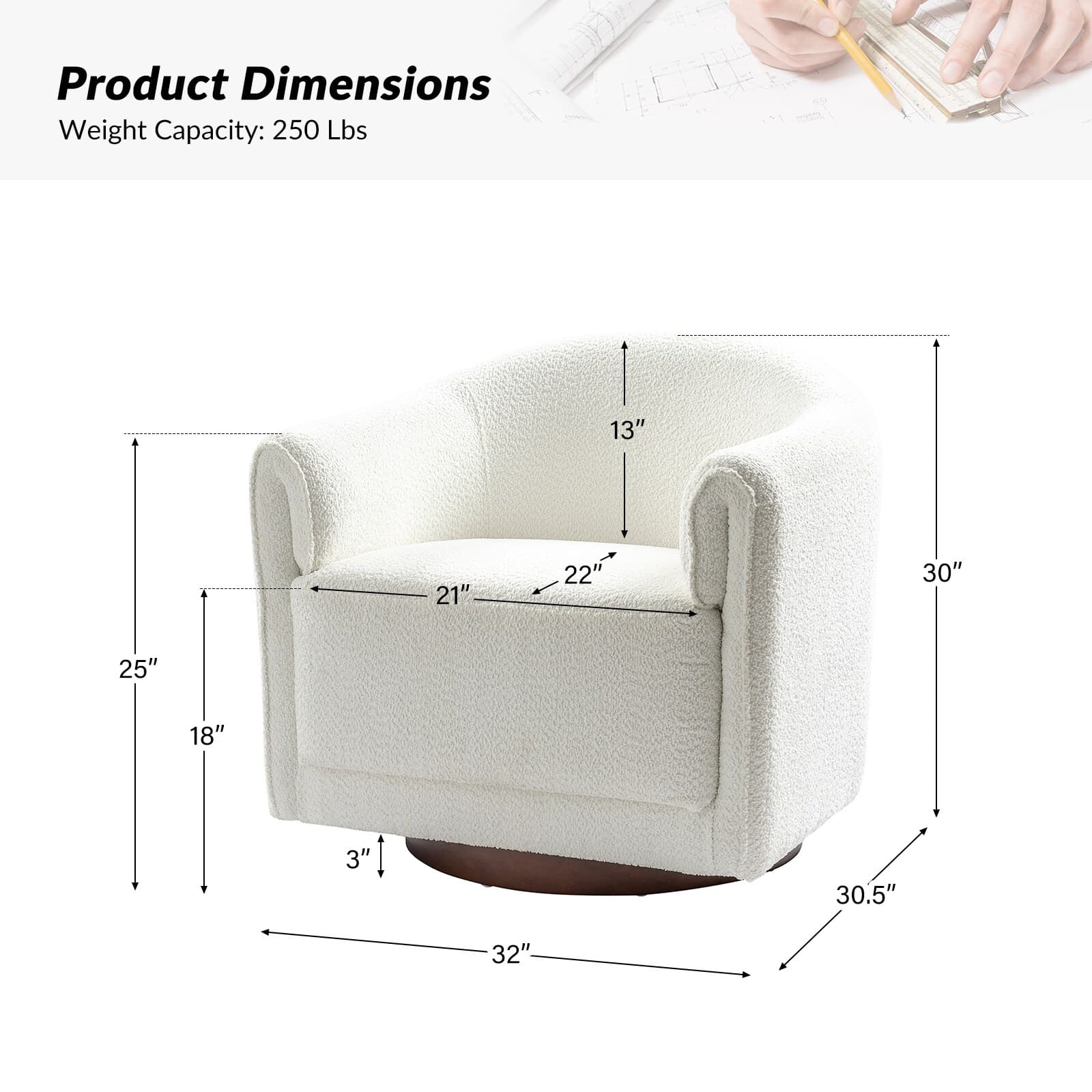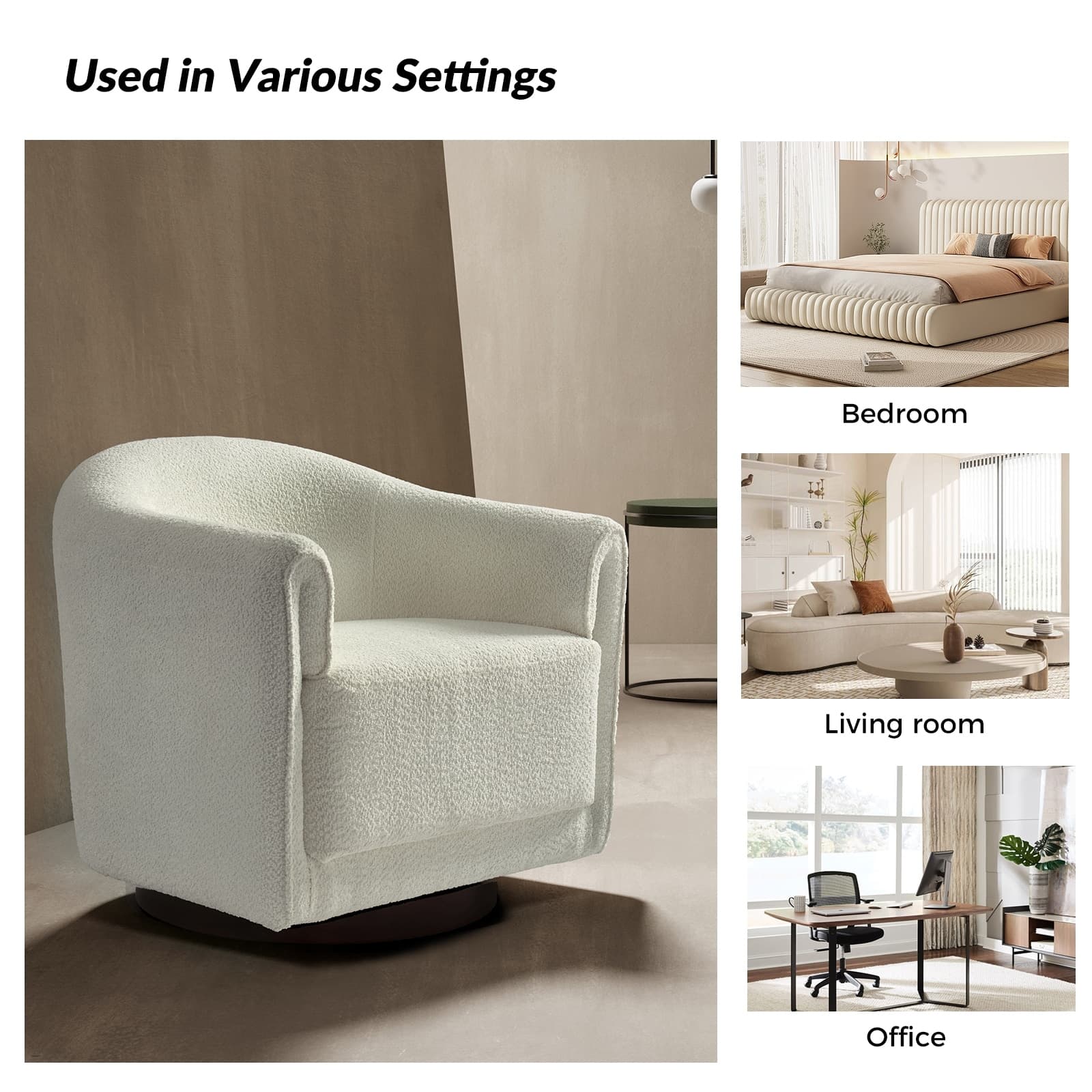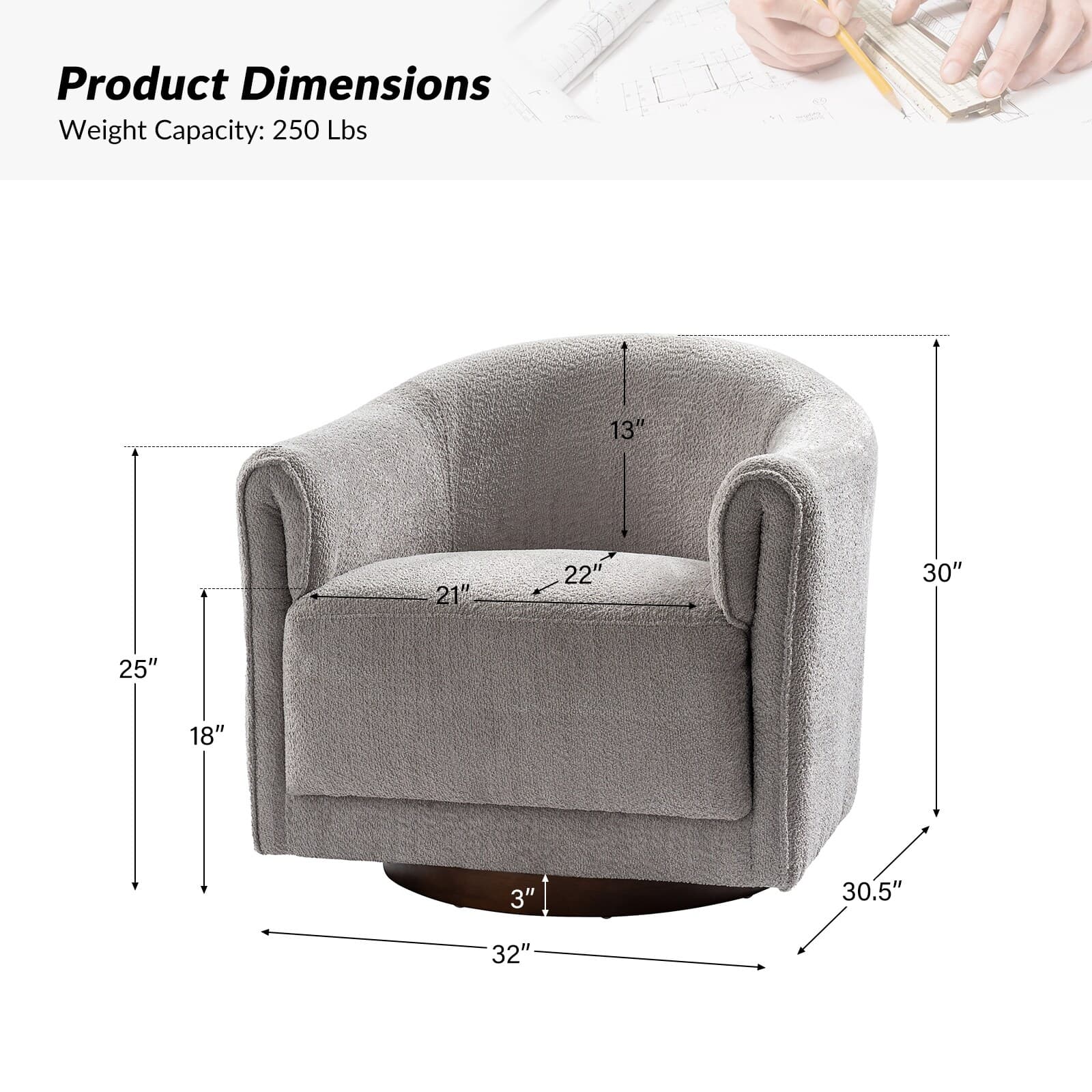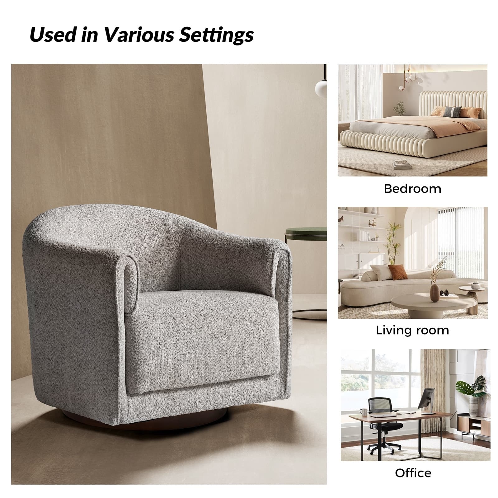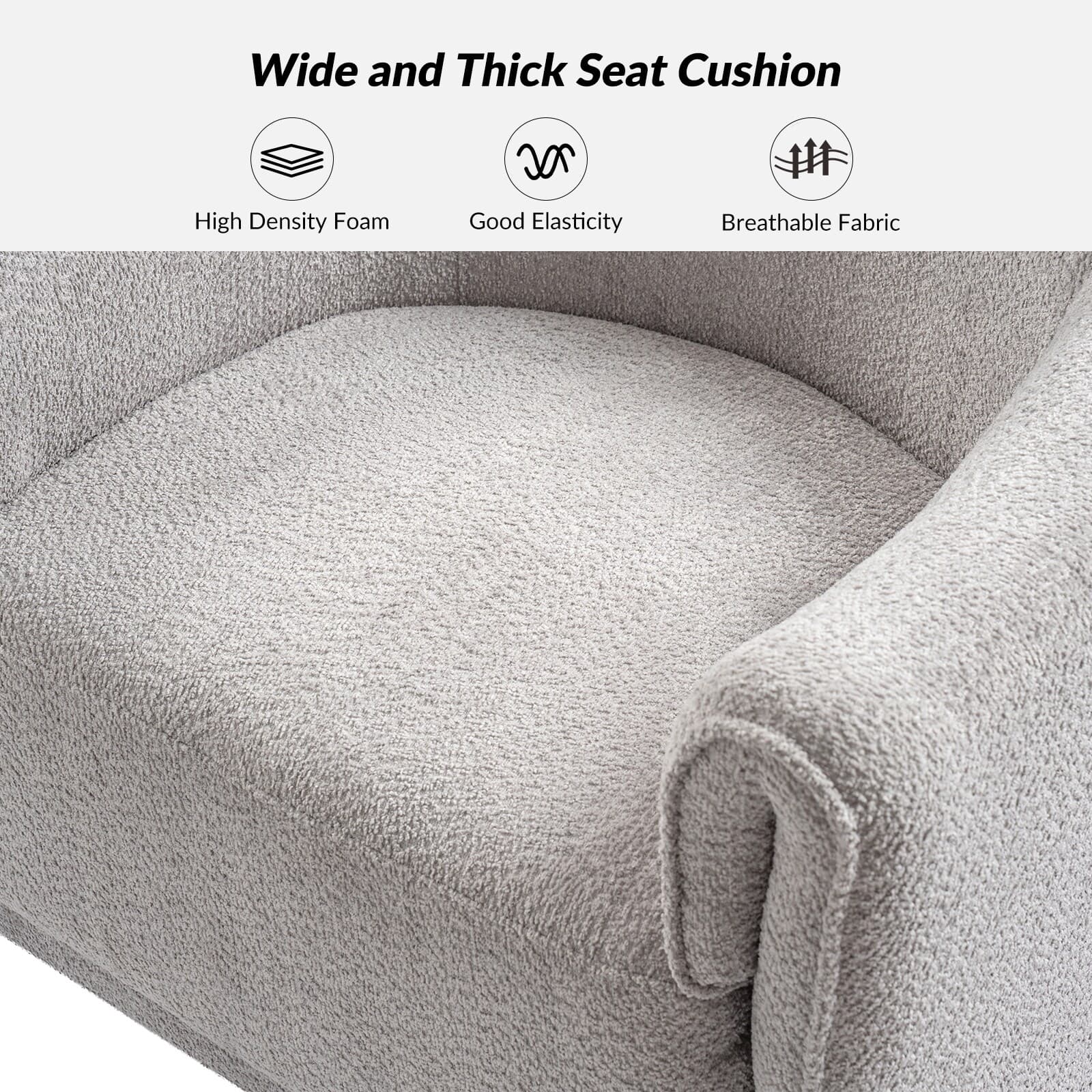 Experience a blend of modern style and functionality with this barrel swivel chair set. Designed to rotate a full 360 degrees, it offers flexibility and convenience. The sleek, contemporary design integrates seamlessly into various living room decors, including Italian contemporary, contemporary glam, ultra-modern, Scandinavian, and classic Boho styles. Enjoy comfort with the thick and wide cushion, enhancing your seating experience for relaxation or socializing. Fold-shaped armrests add extra comfort, ensuring a cozy feel for your arms. The sturdy wood base adds sophistication and value. Elevate your living room with this chair set, combining style, comfort, and convenience. PRODUCT INCLUDING: Two barrel chairs, no assembly required. EXQUISITE APPEARANCE: Designed to meet practical needs while adding unique charm, its simple and elegant appearance features smooth lines, high-quality materials, and attention to detail. 360º SMOOTH SWIVEL: Effortlessly rotate the chair in any direction, offering a complete range of motion and promoting an engaging atmosphere. SLEEK LOW-PROFILE DESIGN: The curved backrest follows body contours for ergonomic support and comfort, creating a visually striking silhouette. THICK AND COMFY CUSHION: The notably thick, soft, and plush cushion provides ample padding for enhanced comfort, making the seating experience more enjoyable and relaxing. Product Details Weight Capacity: 250 lbs Level of Assembly: Partial Assembly Frame Material: Solid and Manufactured Wood Back Fill Material: Foam Seat Fill Material: Foam Weights & Dimensions Item Size: 32"Wx30.5"Dx30"H Item Weight: 115.52 lbs Specifications Upholstered: Yes Arms Included: Yes Ottoman Included: No Instructions: Manual measurement may result in size errors. Country of Origin: