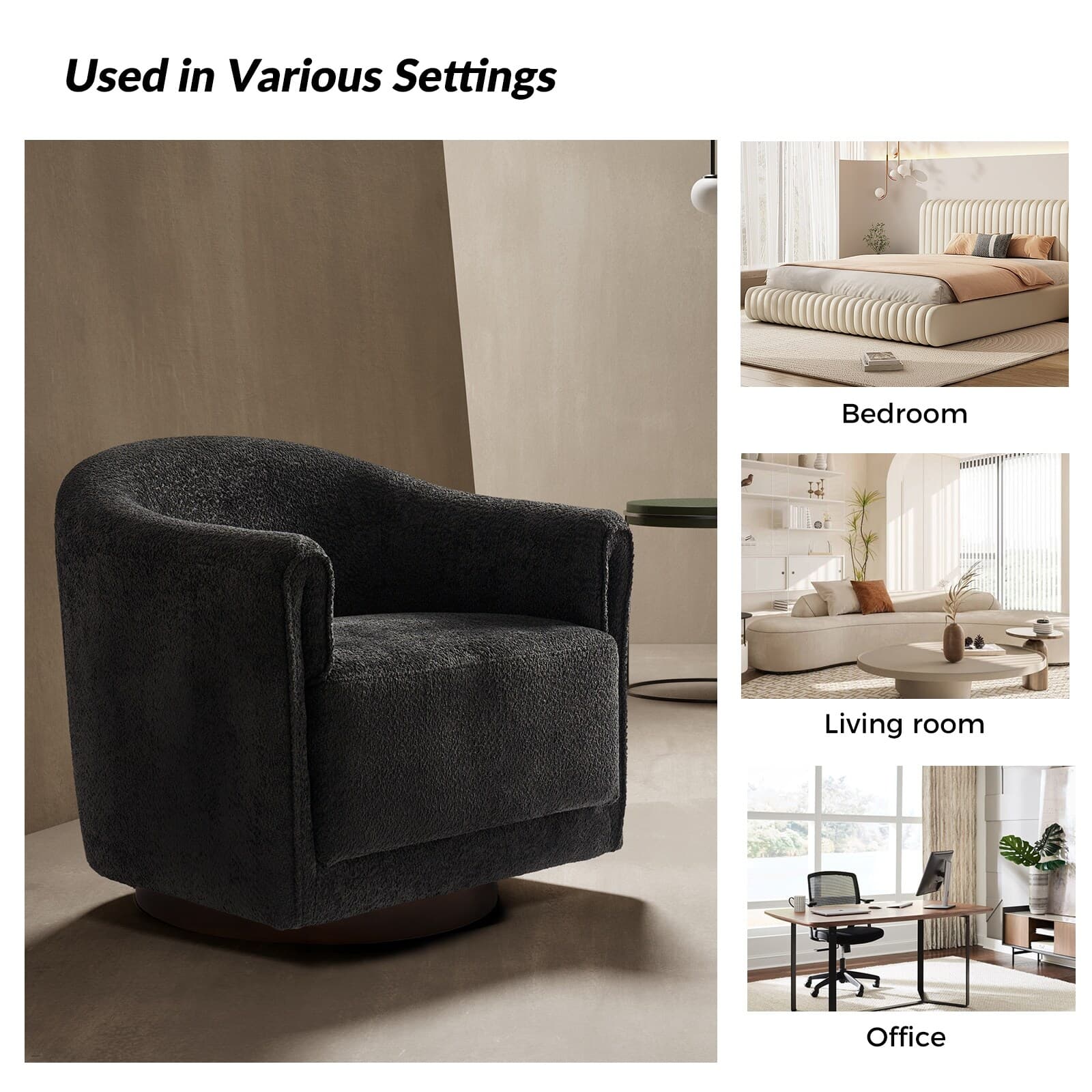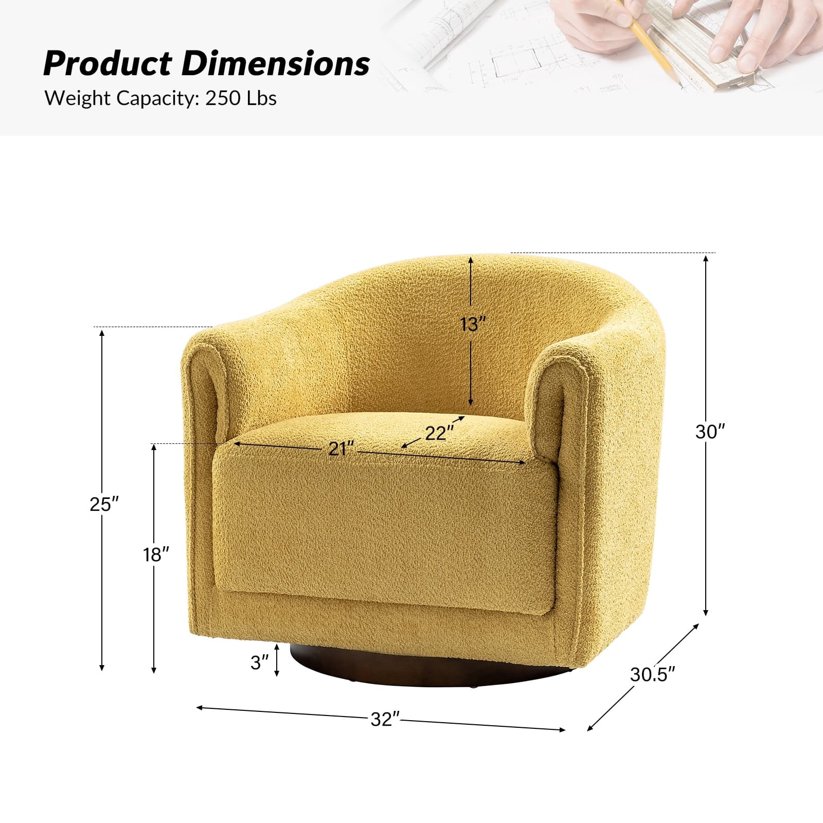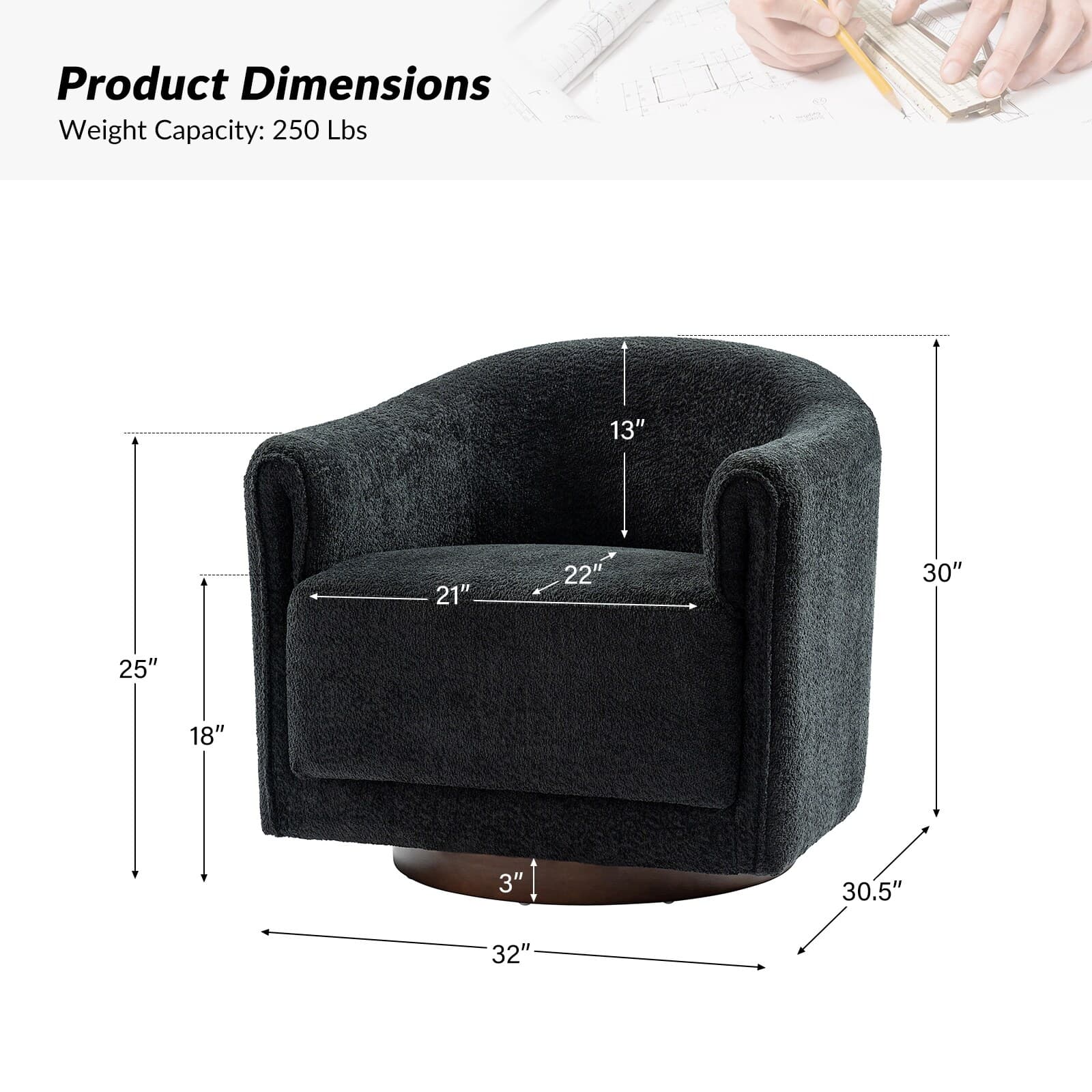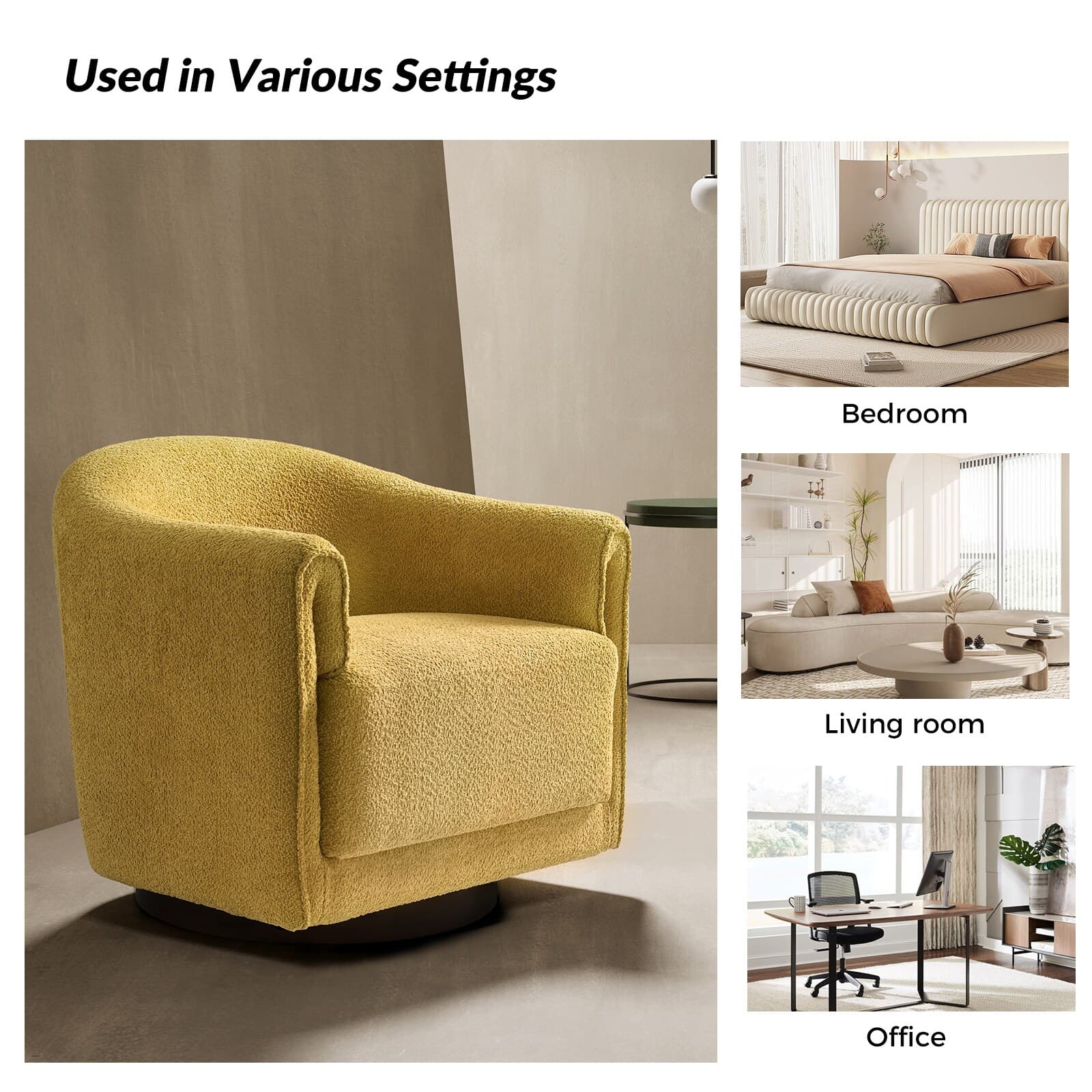 Experience a blend of modern style and functionality with this barrel swivel chair set. Designed to rotate a full 360 degrees, it offers flexibility and convenience. The sleek, contemporary design integrates seamlessly into various living room decors, including Italian contemporary, contemporary glam, ultra-modern, Scandinavian, and classic Boho styles. Enjoy comfort with the thick and wide cushion, enhancing your seating experience for relaxation or socializing. Fold-shaped armrests add extra comfort, ensuring a cozy feel for your arms. The sturdy wood base adds sophistication and value. Elevate your living room with this chair set, combining style, comfort, and convenience. PRODUCT INCLUDING: Two barrel chairs, no assembly required. EXQUISITE APPEARANCE: Designed to meet practical needs while adding unique charm, its simple and elegant appearance features smooth lines, high-quality materials, and attention to detail. 360º SMOOTH SWIVEL: Effortlessly rotate the chair in any direction, offering a complete range of motion and promoting an engaging atmosphere. SLEEK LOW-PROFILE DESIGN: The curved backrest follows body contours for ergonomic support and comfort, creating a visually striking silhouette. THICK AND COMFY CUSHION: The notably thick, soft, and plush cushion provides ample padding for enhanced comfort, making the seating experience more enjoyable and relaxing. Product Details Weight Capacity: 250 lbs Level of Assembly: Partial Assembly Frame Material: Solid and Manufactured Wood Back Fill Material: Foam Seat Fill Material: Foam Weights & Dimensions Item Size: 32"Wx30.5"Dx30"H Item Weight: 115.52 lbs Specifications Upholstered: Yes Arms Included: Yes Ottoman Included: No Instructions: Manual measurement may result in size errors. Country of Origin: