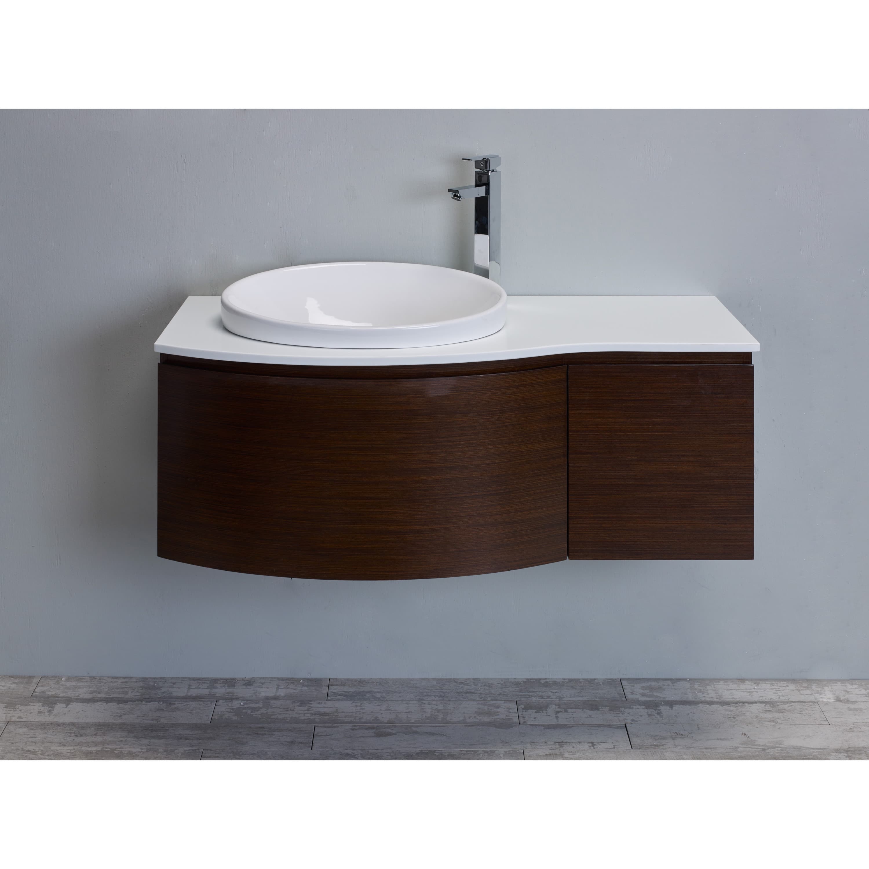 Enhance your bathroom with this wall-mounted vanity featuring a natural brown wood finish and a Glassos countertop for a modern touch. The spacious cabinet offers ample storage for toiletries and personal items.