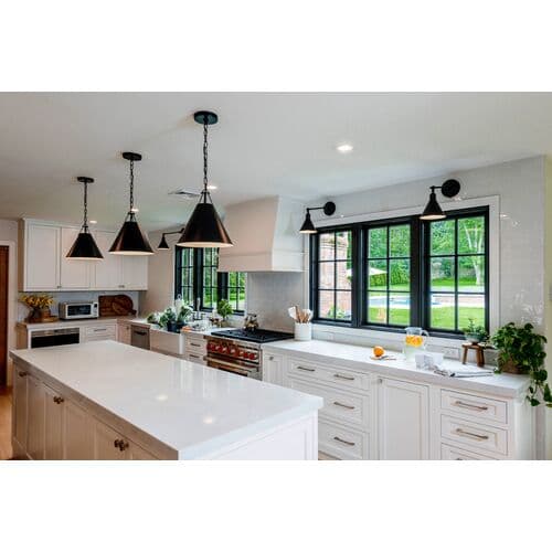 A striking balance of matte black exterior and warm white interior lends sophistication to this conical pendant light.