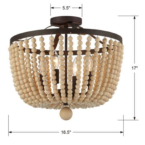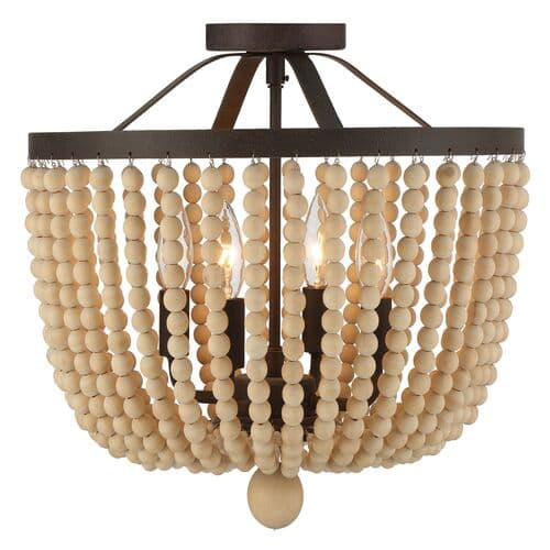 Wooden beads combined with a bronze finished wrought-iron frame create a natural ambience, contrasting with the elegant shape of this four-light ceiling fixture.