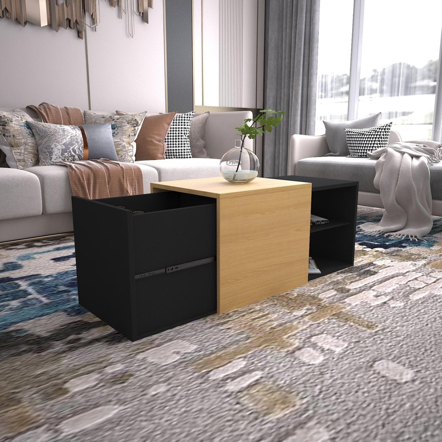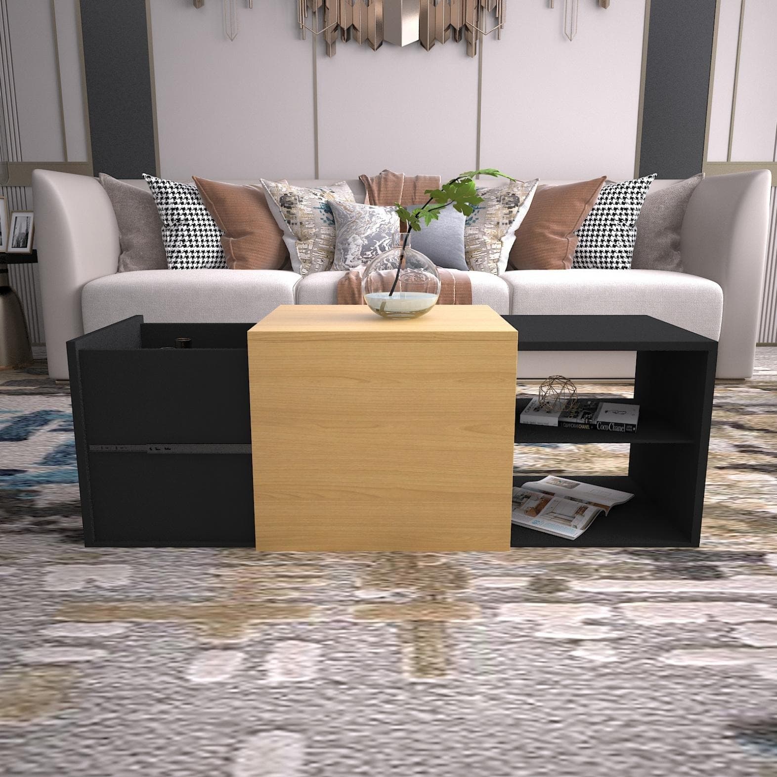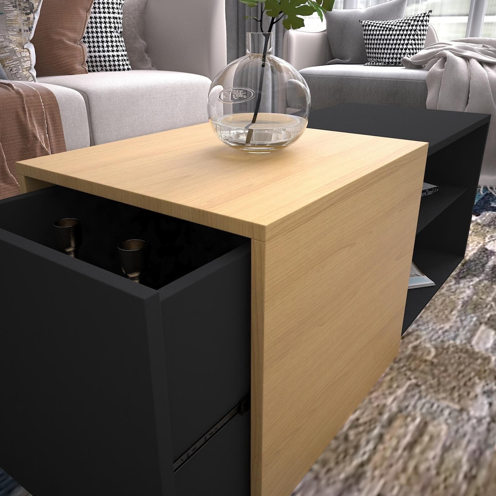 Enhance your living room with a coffee table that blends style and practicality. It features a sleek black finish and a left pull-out drawer for storing fragile items, along with a two-layer shelf on the right for easy storage access. The metal slide provides quiet drawer operation, and the 1.6 cm particleboard construction ensures stability. Lifting the tabletop reveals extra storage space for blankets and pillows.