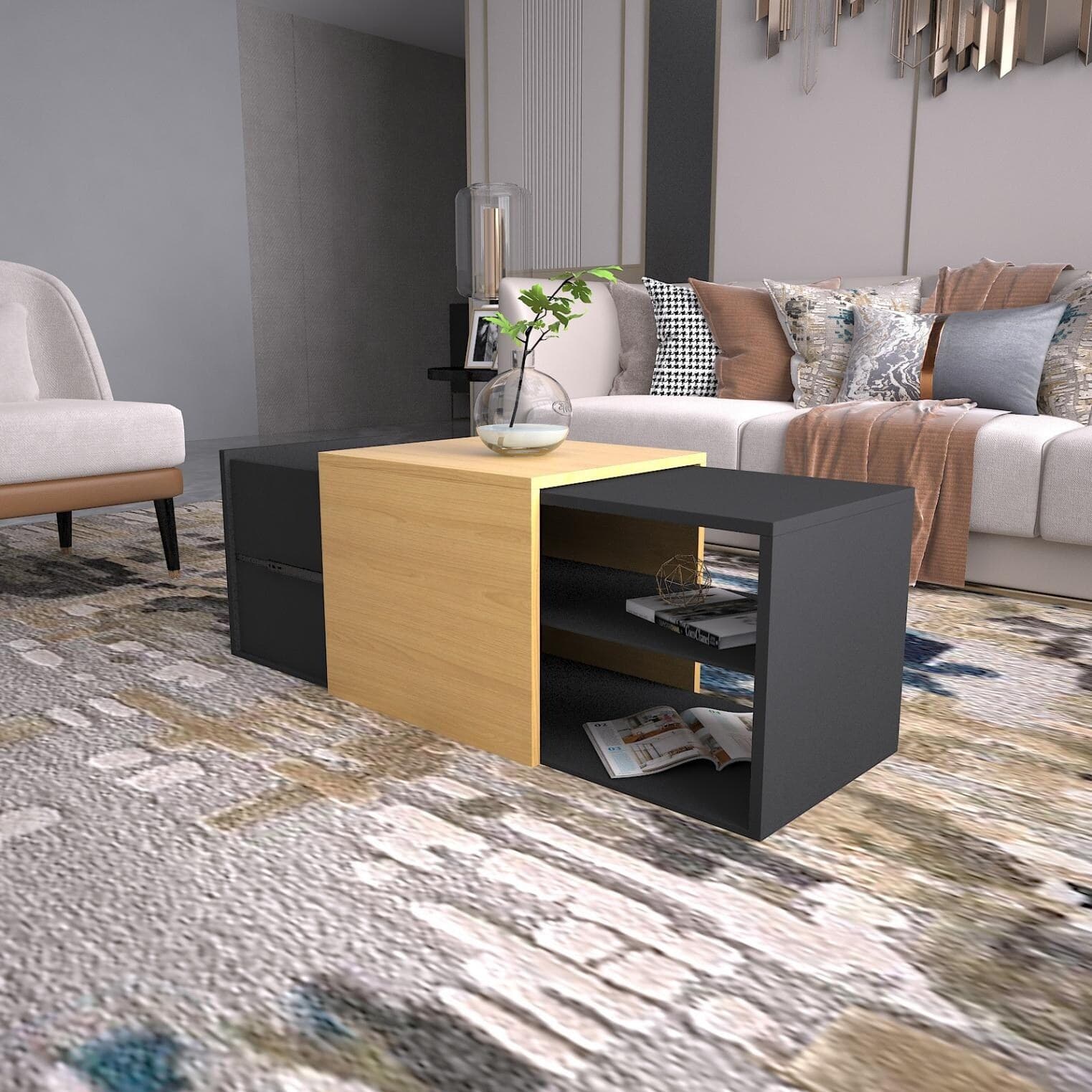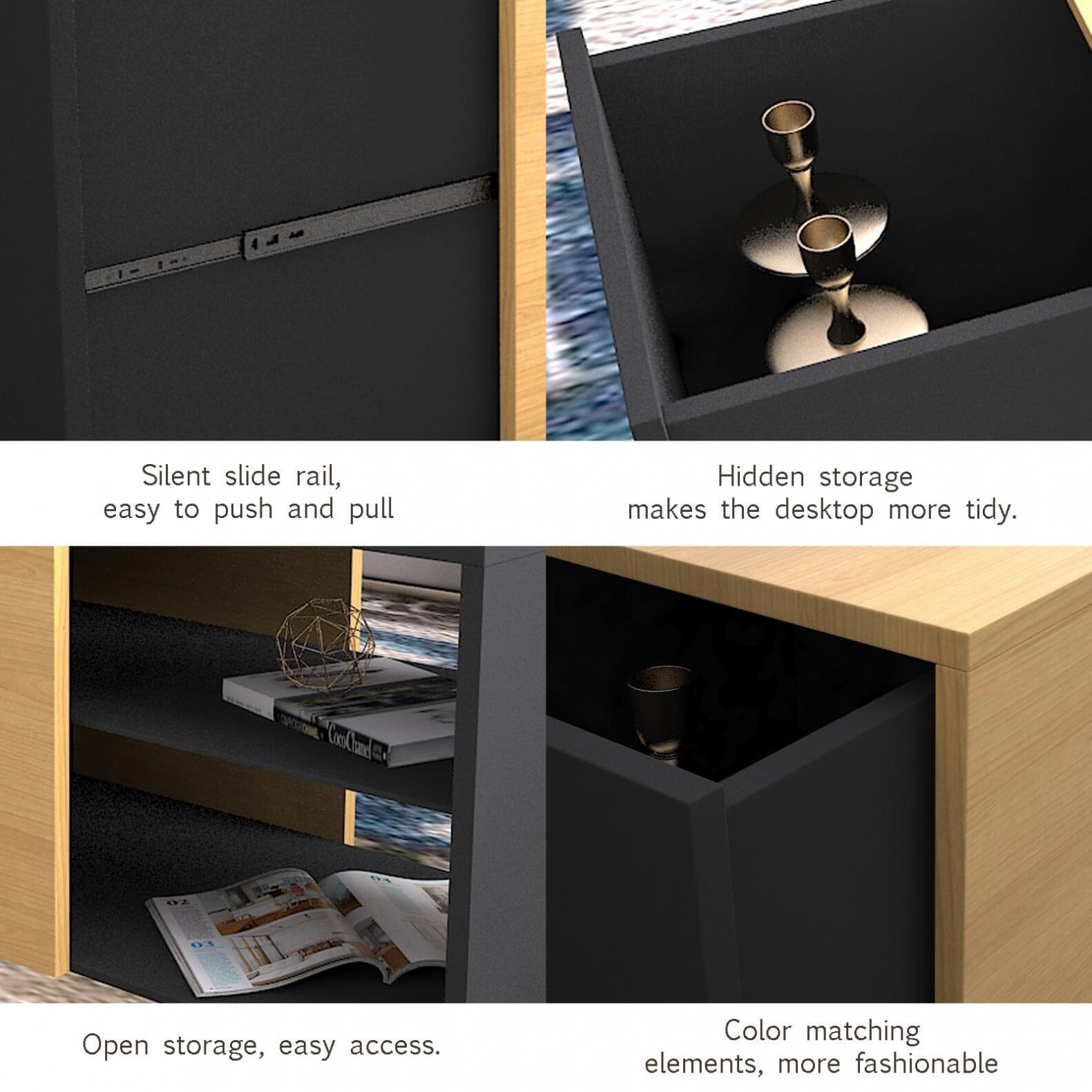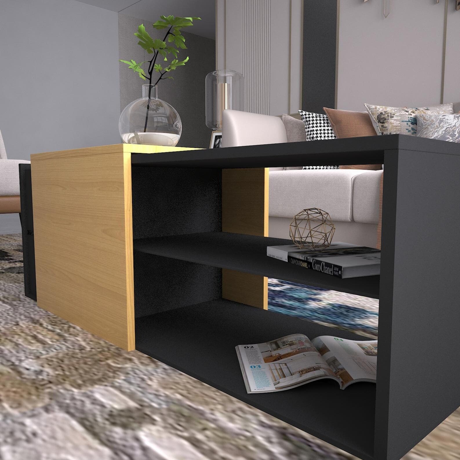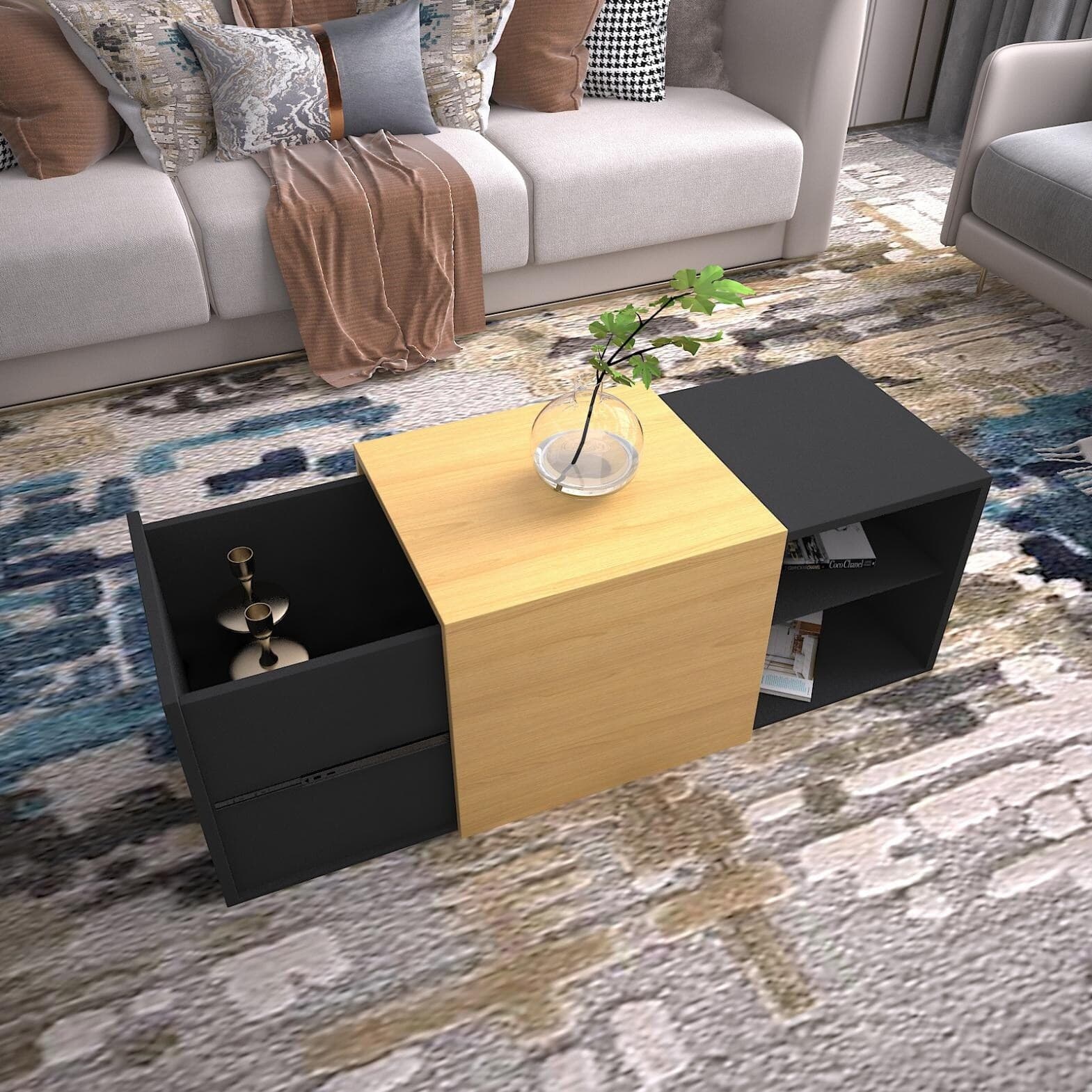 Enhance your living room with a coffee table that blends style and practicality. It features a sleek black finish and a left pull-out drawer for storing fragile items, along with a two-layer shelf on the right for easy storage access. The metal slide provides quiet drawer operation, and the 1.6 cm particleboard construction ensures stability. Lifting the tabletop reveals extra storage space for blankets and pillows.