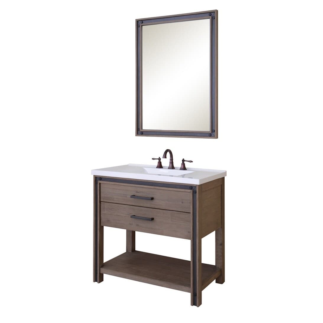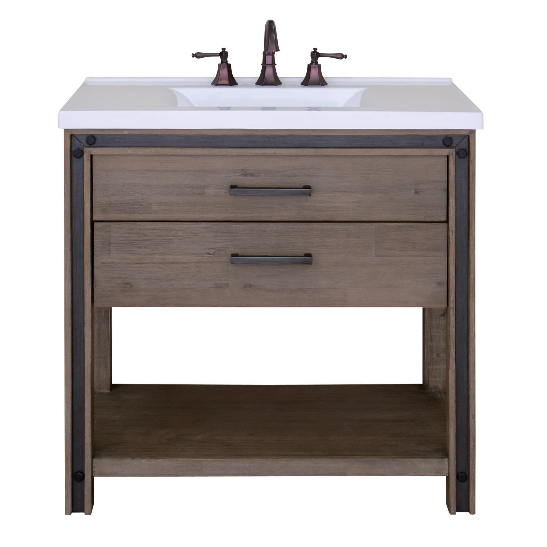 Features include high-quality hardwood construction and a multi-step hand-rubbed finish to enhance the wood's beauty. Comes with a 1-year limited warranty from Sagehill Designs. Contains a soft-close slide drawer for ample concealed storage, operating smoothly on ball-bearing glides. Adjustable foot levers are incorporated. The vanity is shipped fully assembled, ensuring reliable performance for years. Dimensions are 34" in height, 21" in depth, and 36" in width. It is free-standing, comes with one drawer, and excludes doors. This is the vanity base only; top and sink must be ordered separately. Product details are provided by external sources and not Overstock.