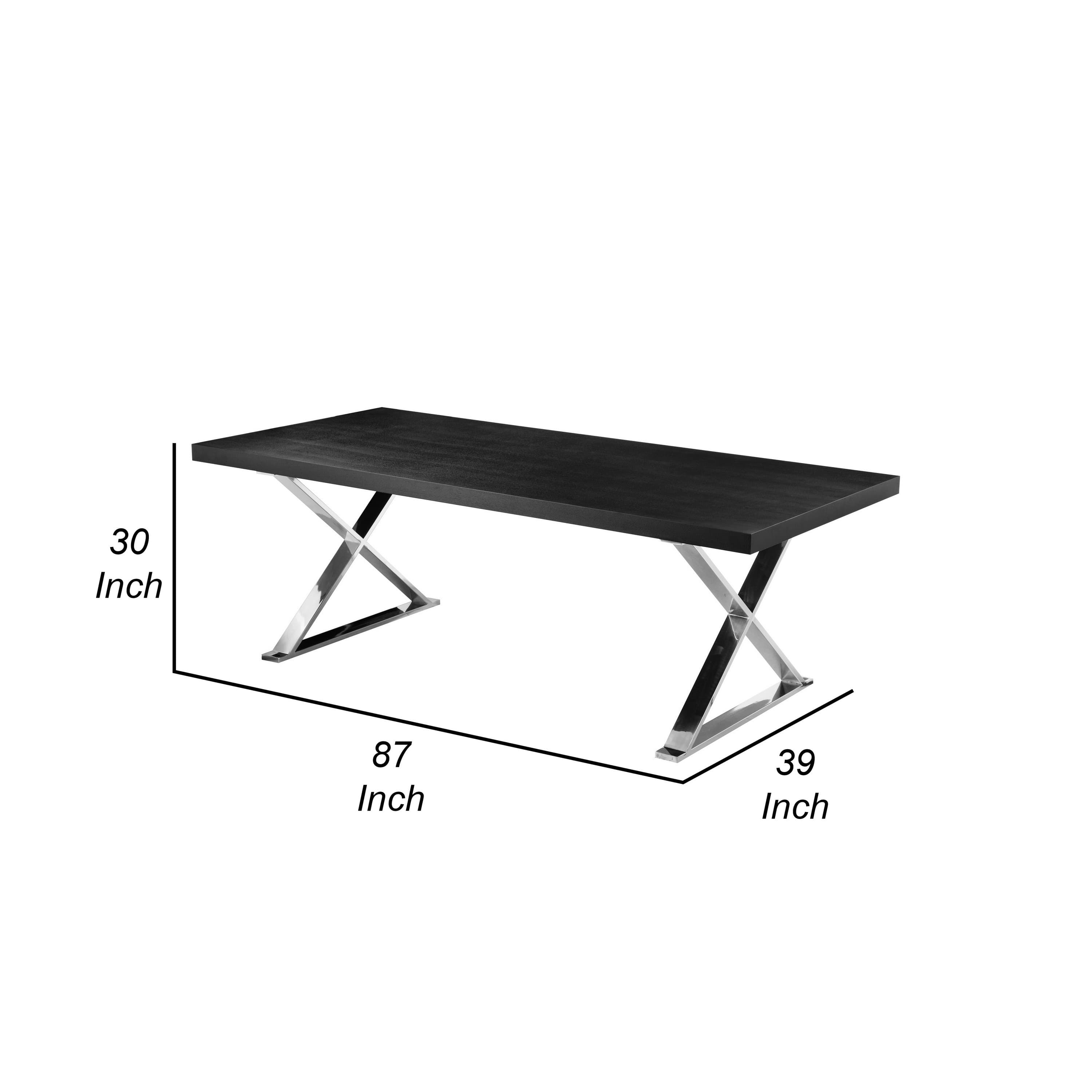 Rix 87 Inch Dining Table, Black Wood Top, X Chrome Finished Steel Legs