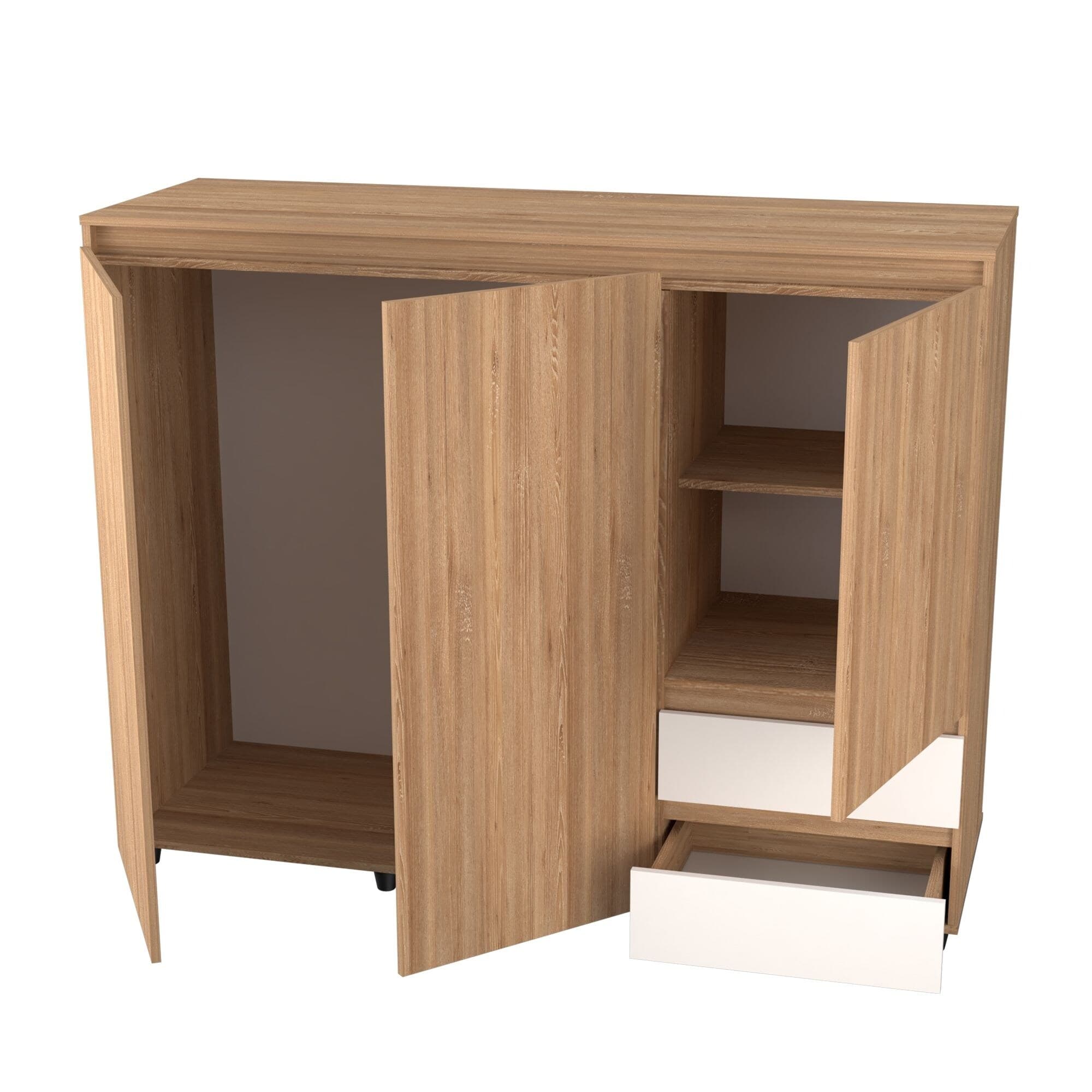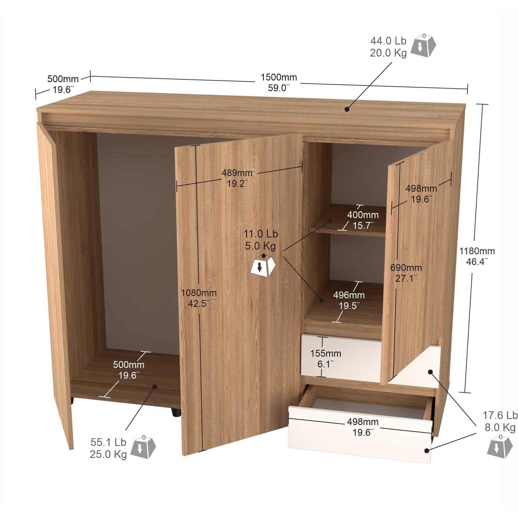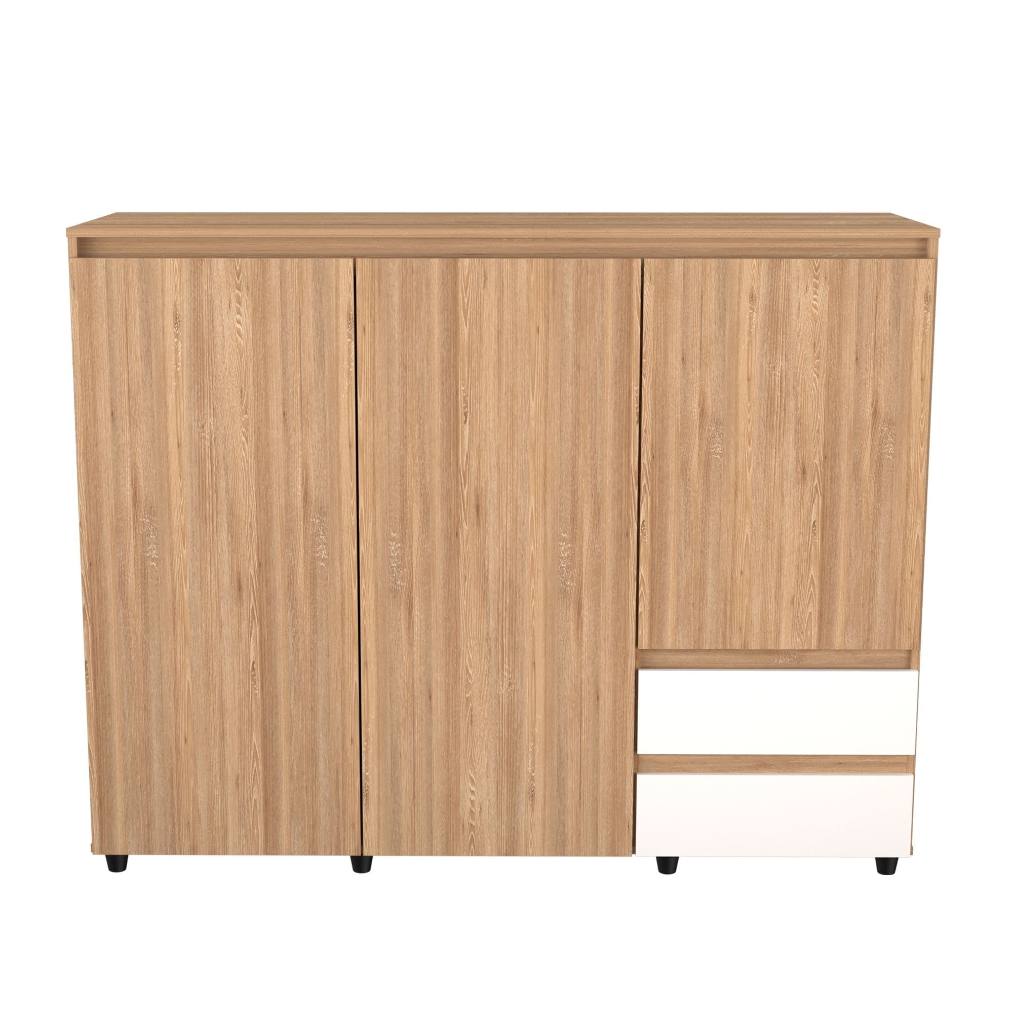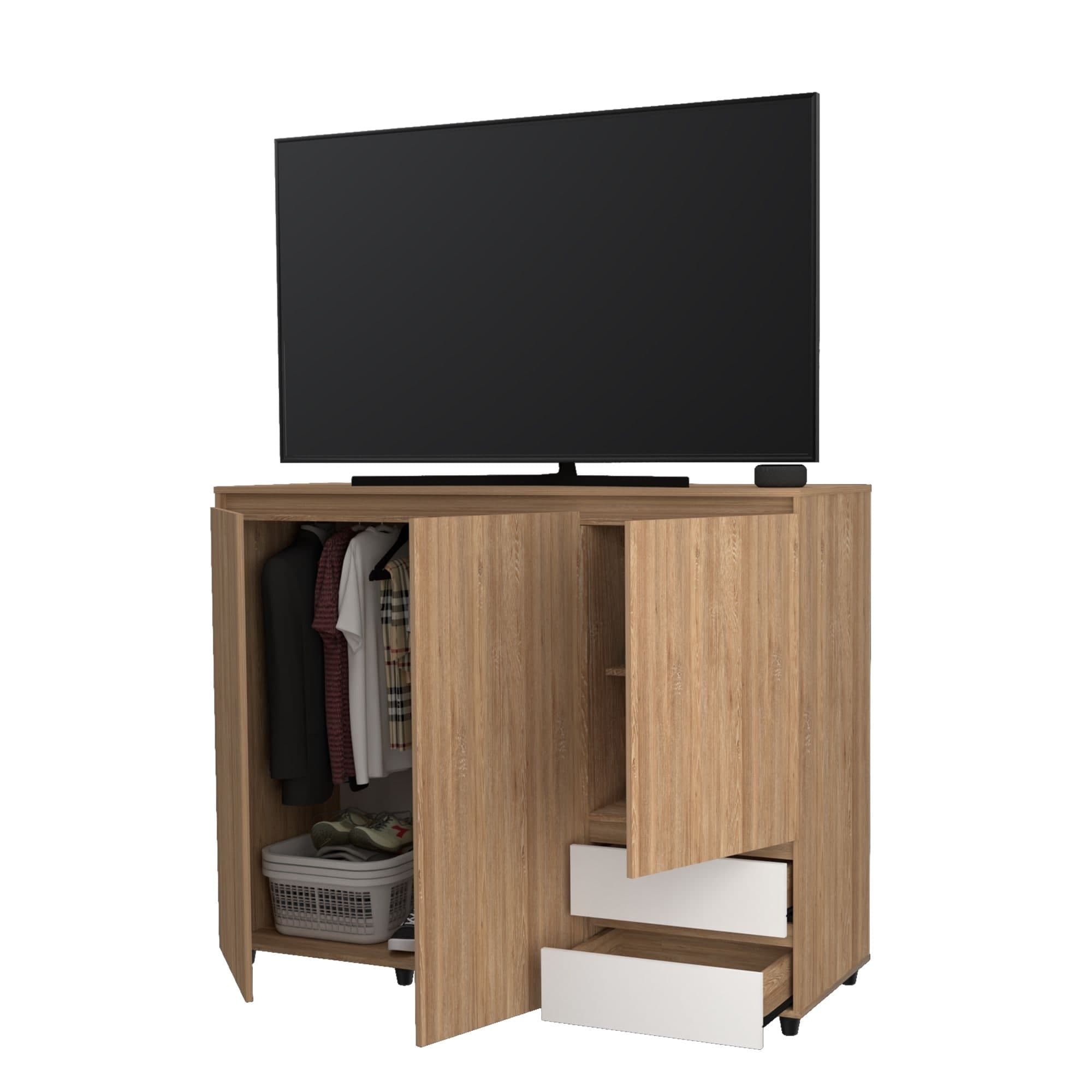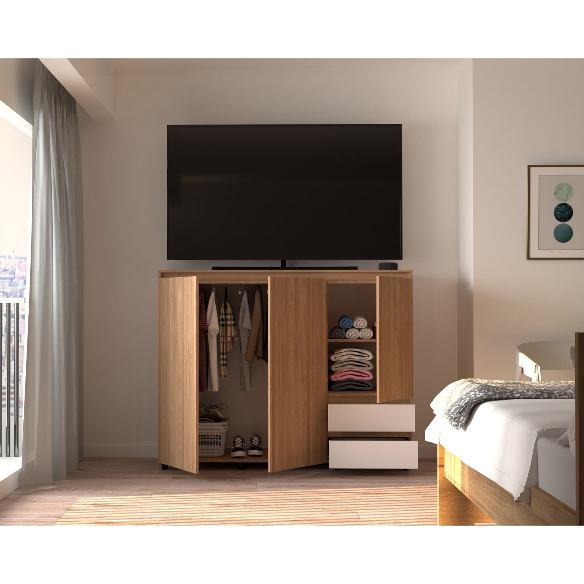Finished in rich Amaretto Oak and White laminates, this armoire resists stains, heat, and scratches with its durable melamine. Made from engineered wood, it offers two large doors hiding a wardrobe area with a removable rod for hanging clothes. Additional space includes a lower shelf for shoes or items, and the right side houses two drawers with metal slides and a door with two shelves, one adjustable, for organization. All doors have concealed European hinges and a sleek design, increasing its sophisticated look. Enhance your storage space with this practical armoire. Easy assembly is required, and it includes a 1-year warranty from the manufacturer.