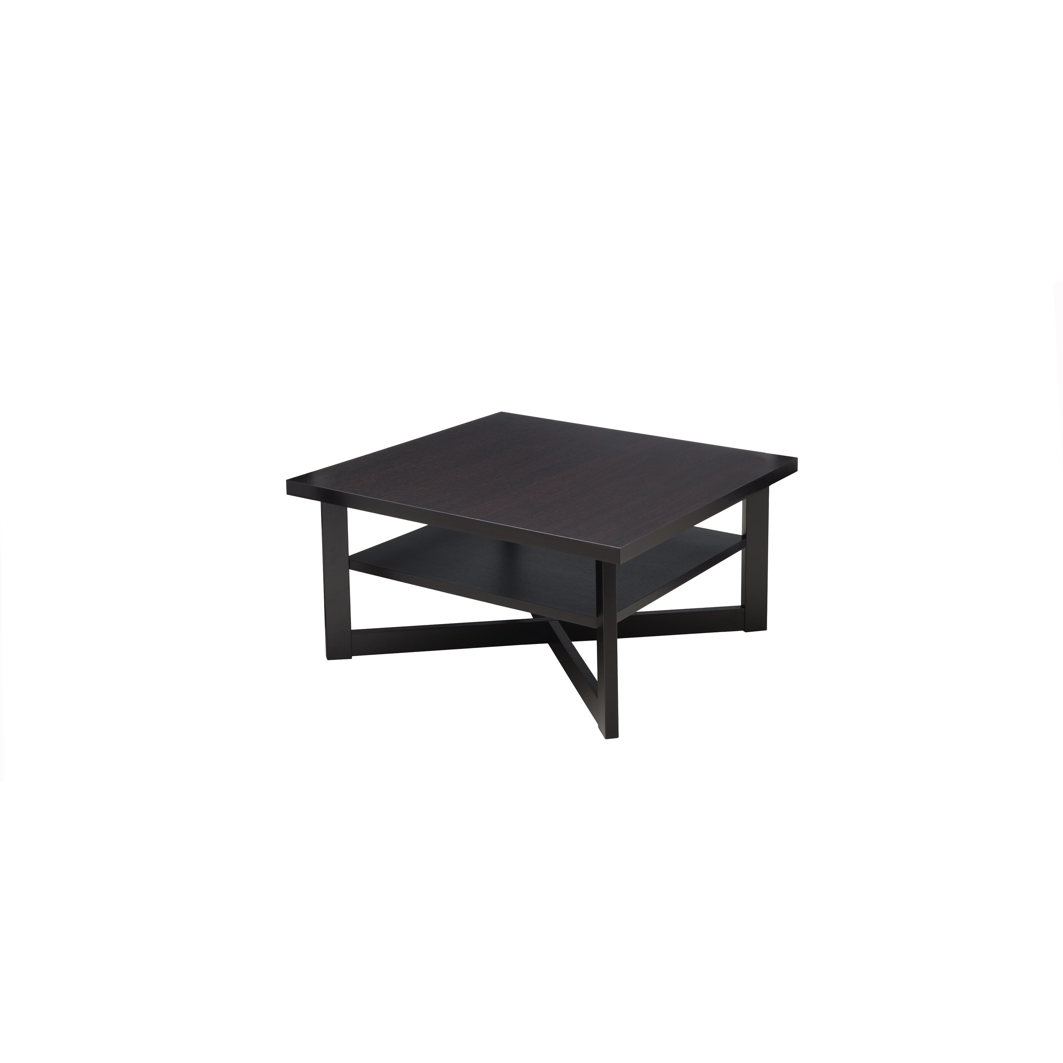 Simmons Casegoods square cocktail table features a floating mid-shelf design for added storage and functionality. The merlot finish provides a durable laminate table top surface.
