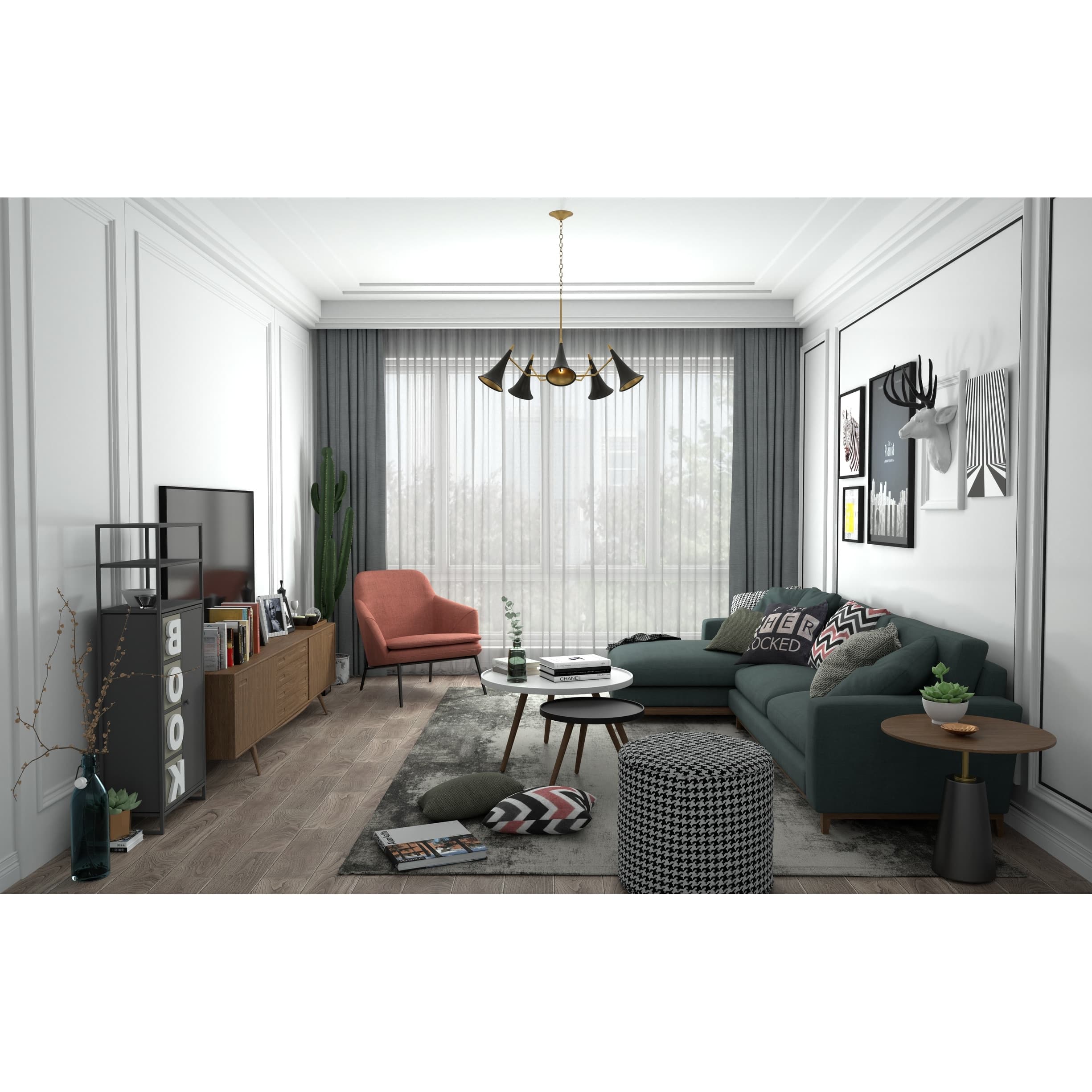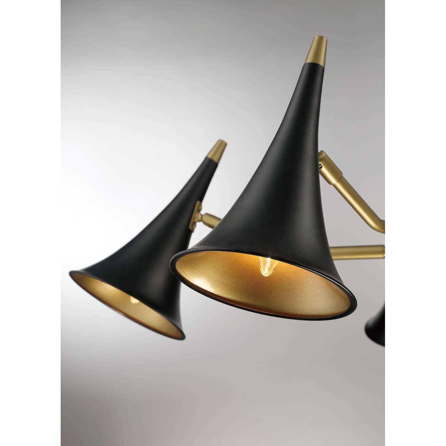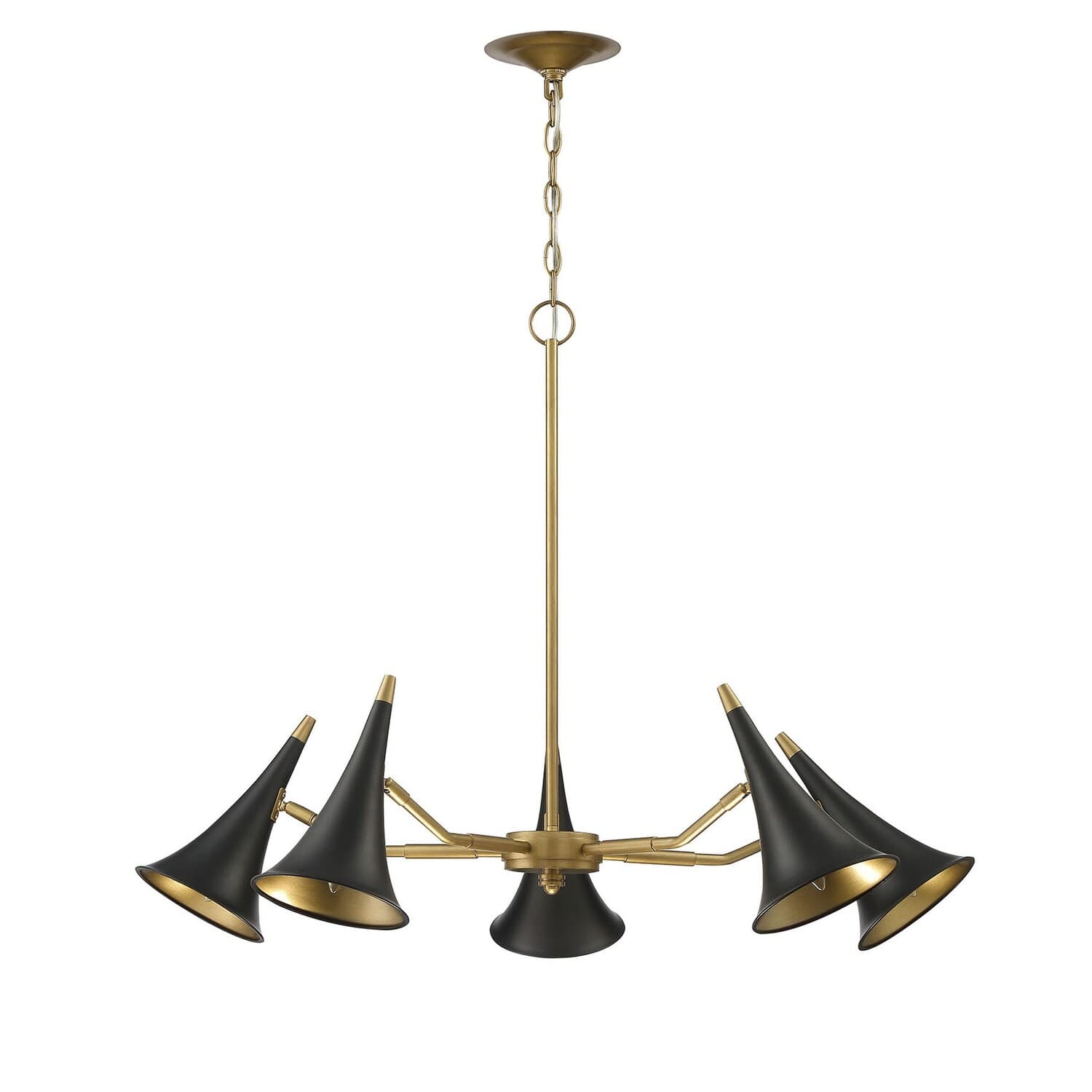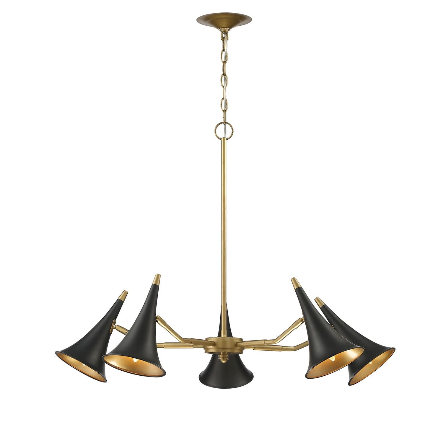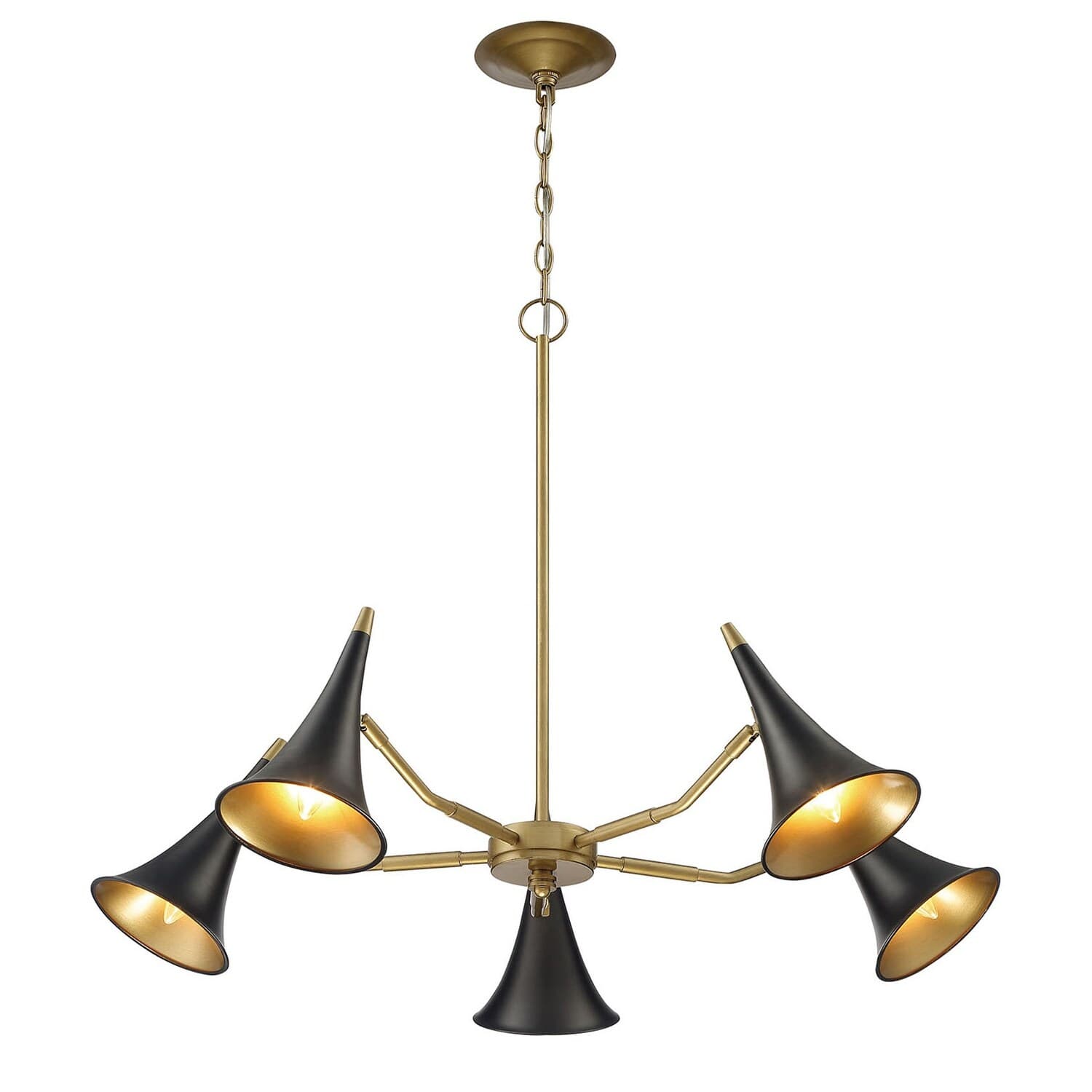 Shaped like a trumpet, the Clarion 5-Light Chandelier brings a refined mid-century modern touch, measuring nearly 36 inches wide. Its metal shades feature a hand-rubbed bronze exterior and a brass-finished interior and body. Providing a warm, dramatic glow, the Clarion is designed for living, dining, and kitchen areas. Includes an adjustable 6-foot chain, with additional chain available if needed.