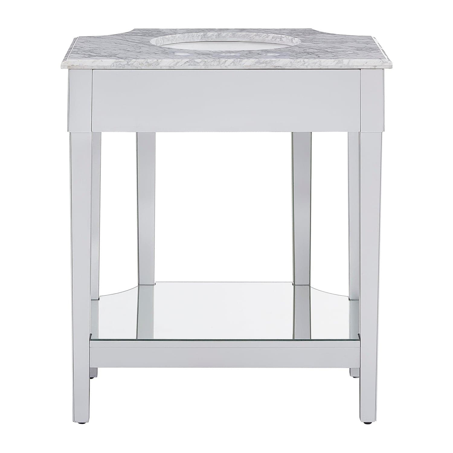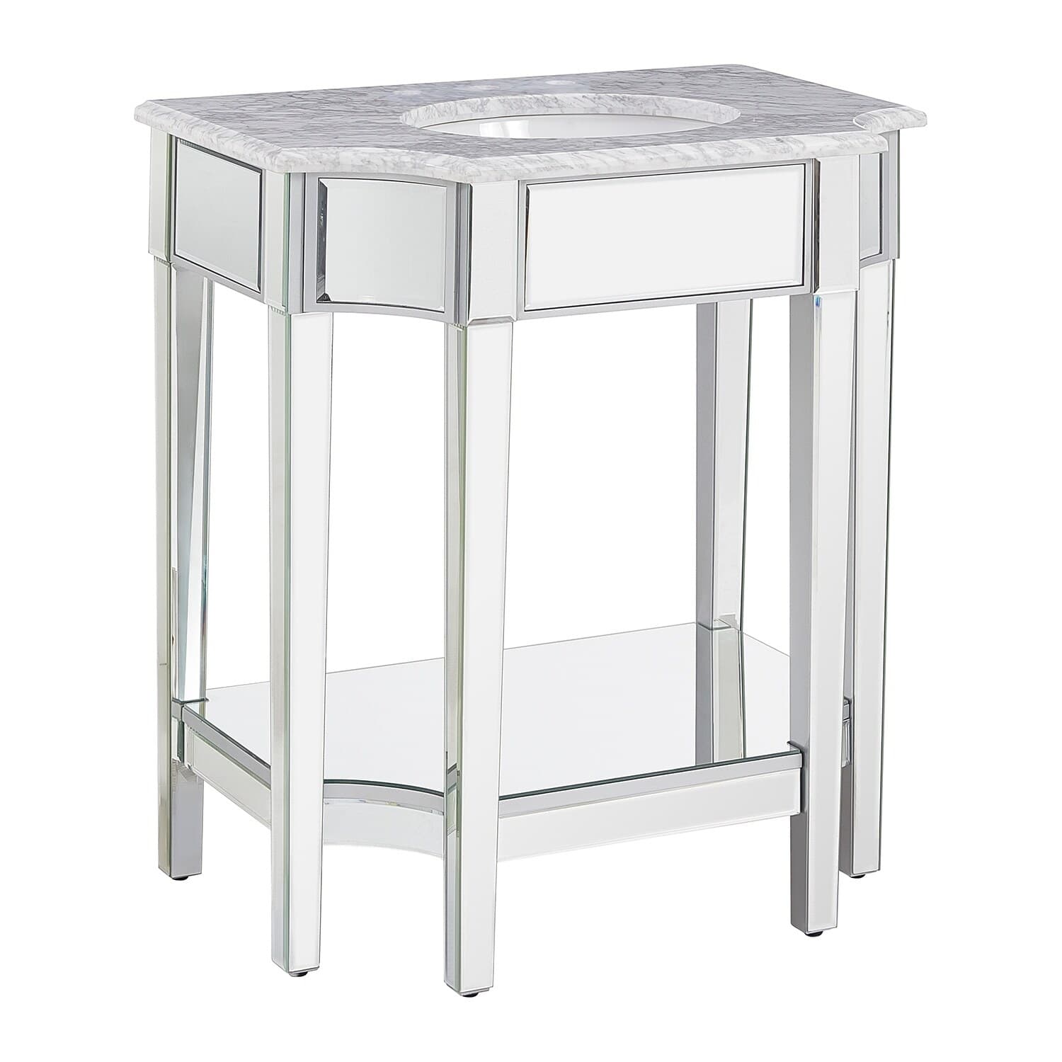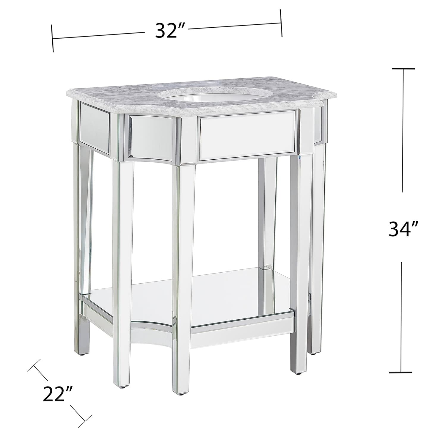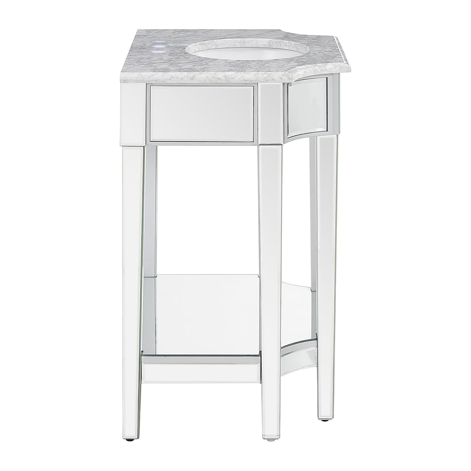 With its scalloped demilune design, this vanity sink is perfect for adding style to any bathroom. Mirrored sides create an illusion of more space in smaller areas. The countertop features sturdy gray marble, and the lower shelf offers open storage or display options. Enhance your bathroom's aesthetic with this mirrored vanity, providing a blend of style and practicality.