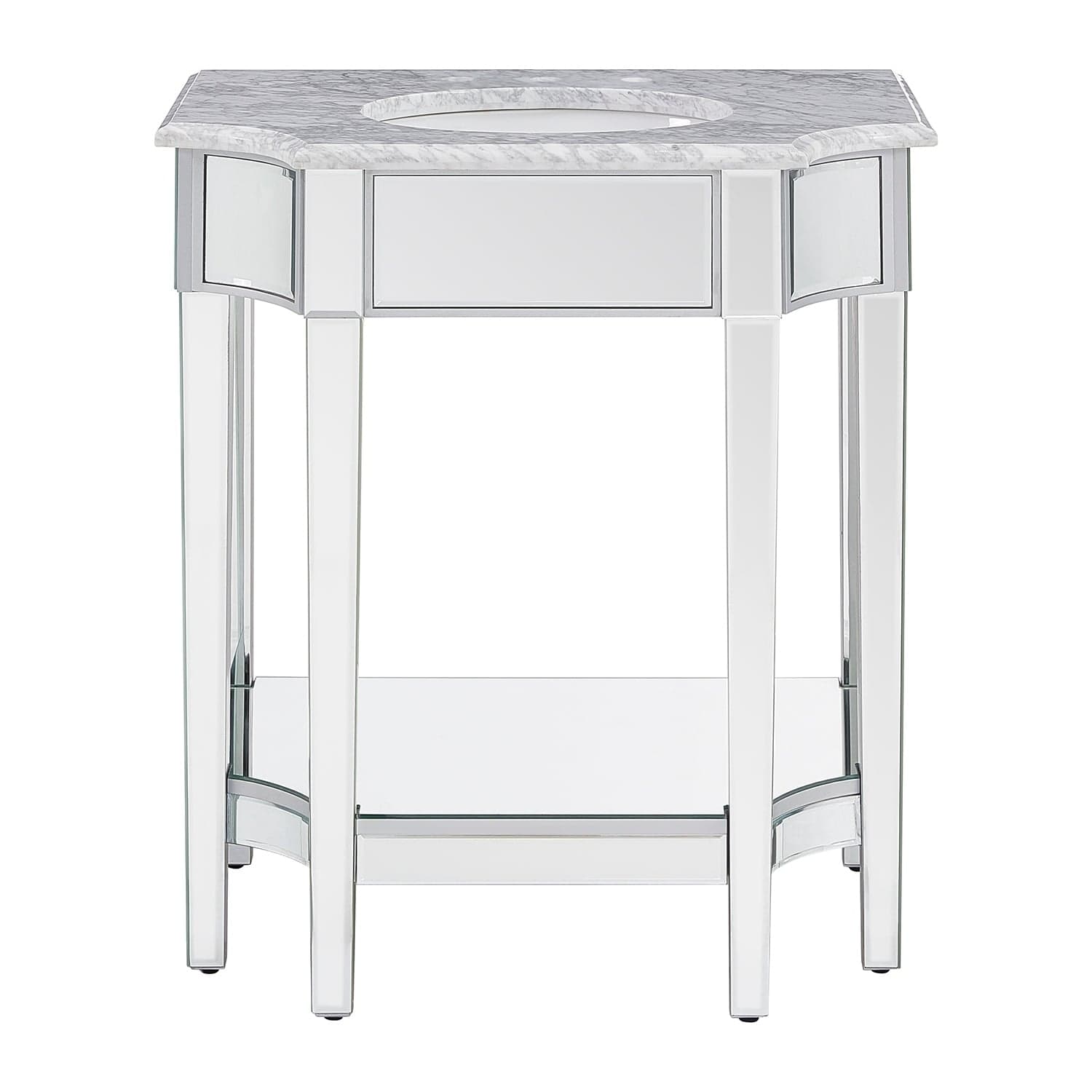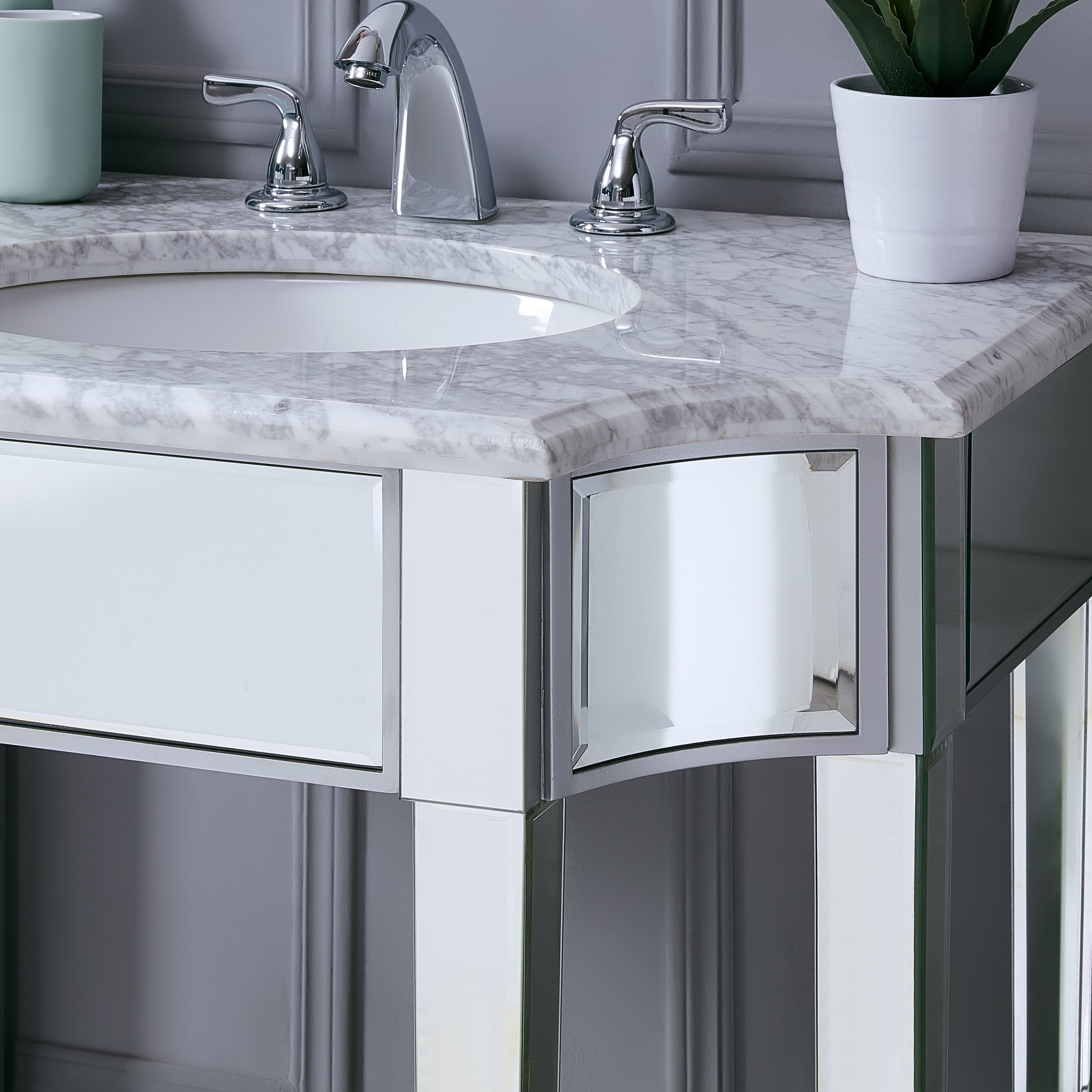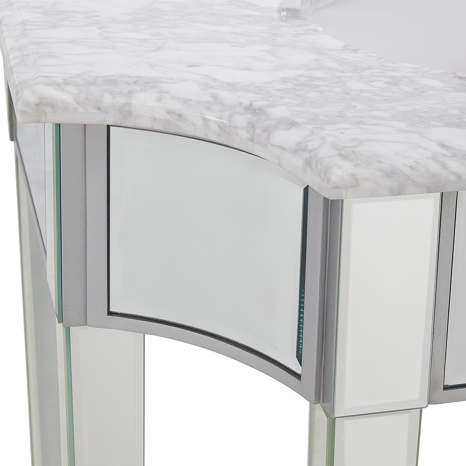 With its scalloped demilune design, this vanity sink is perfect for adding style to any bathroom. Mirrored sides create an illusion of more space in smaller areas. The countertop features sturdy gray marble, and the lower shelf offers open storage or display options. Enhance your bathroom's aesthetic with this mirrored vanity, providing a blend of style and practicality.