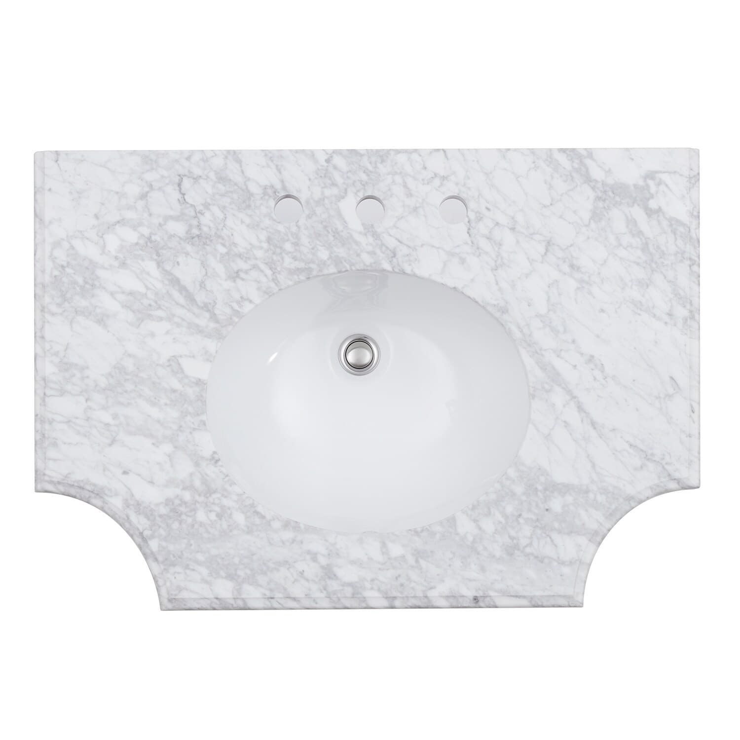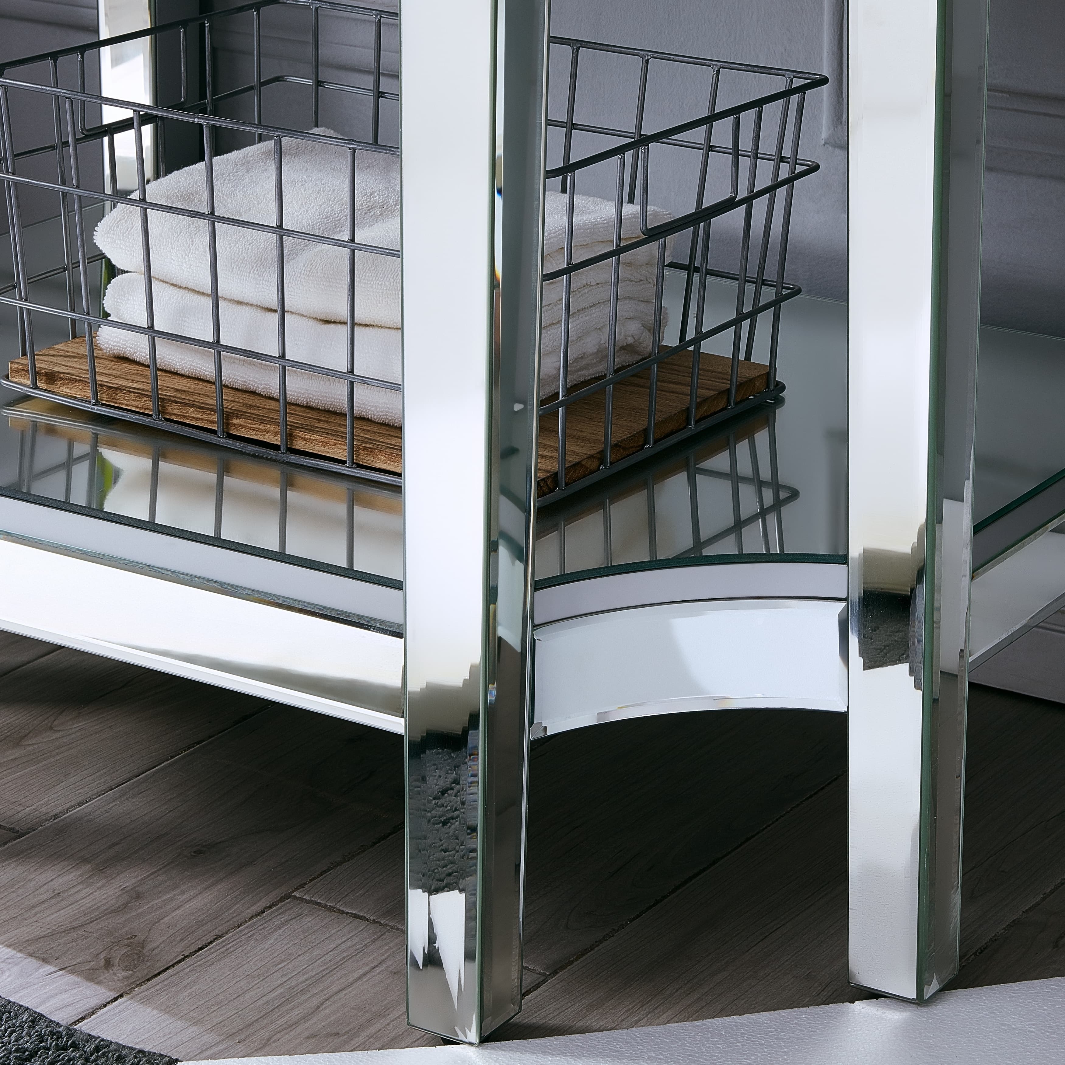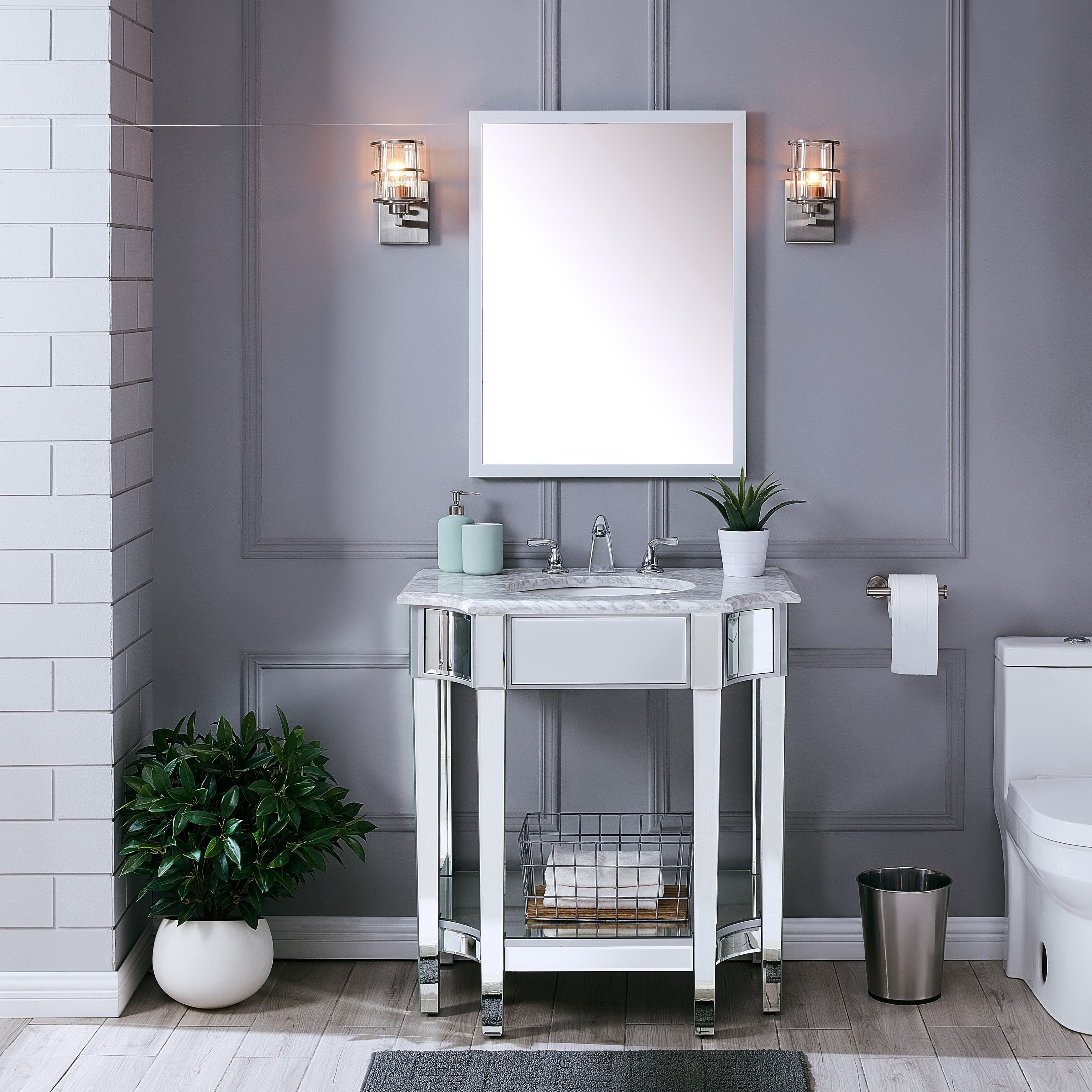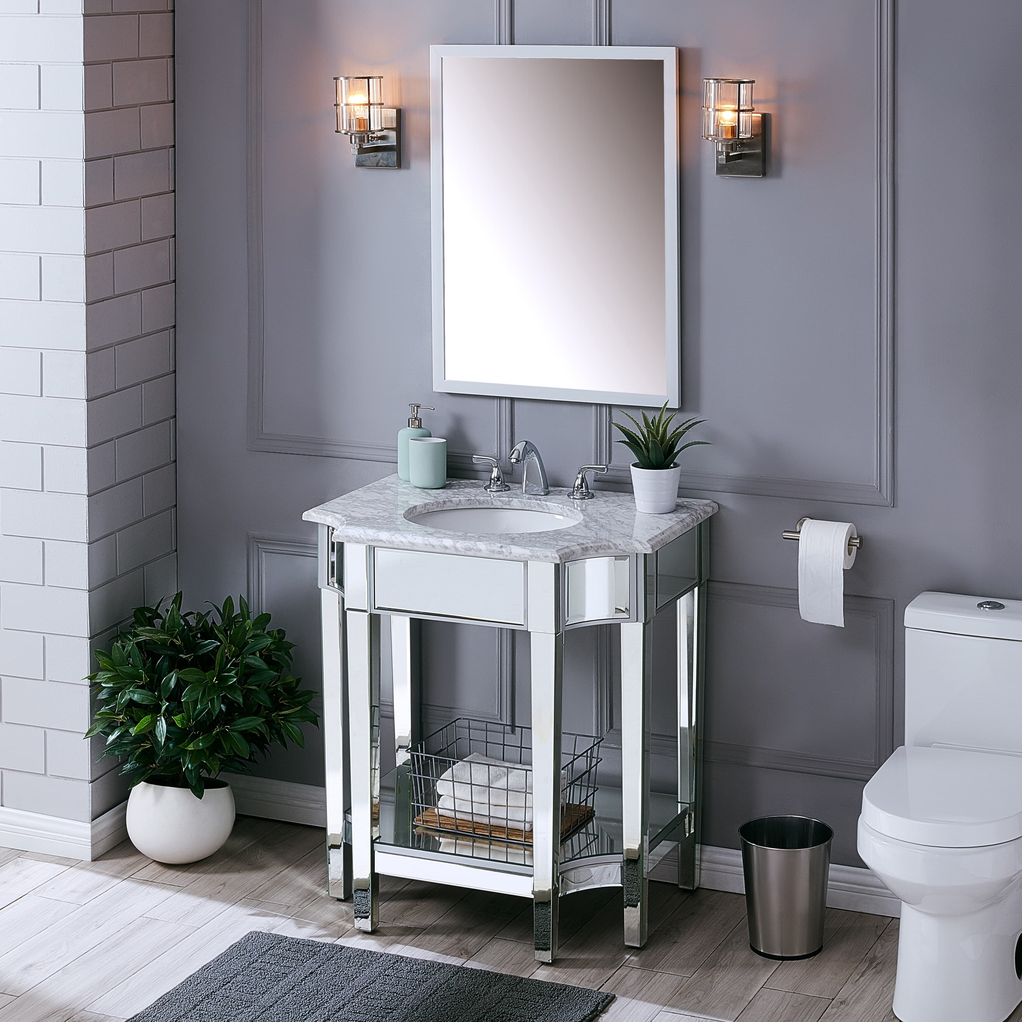 With its scalloped demilune design, this vanity sink is perfect for adding style to any bathroom. Mirrored sides create an illusion of more space in smaller areas. The countertop features sturdy gray marble, and the lower shelf offers open storage or display options. Enhance your bathroom's aesthetic with this mirrored vanity, providing a blend of style and practicality.