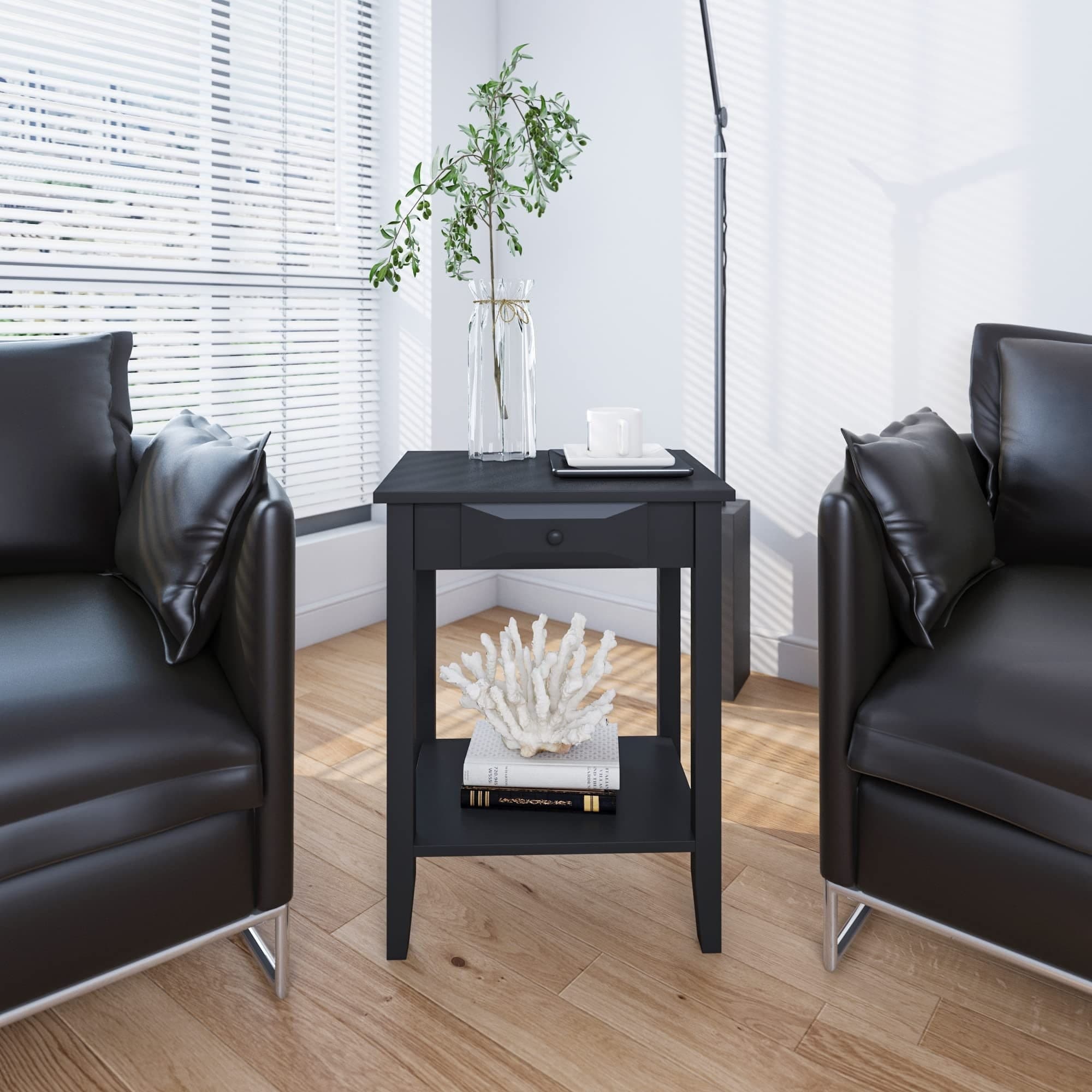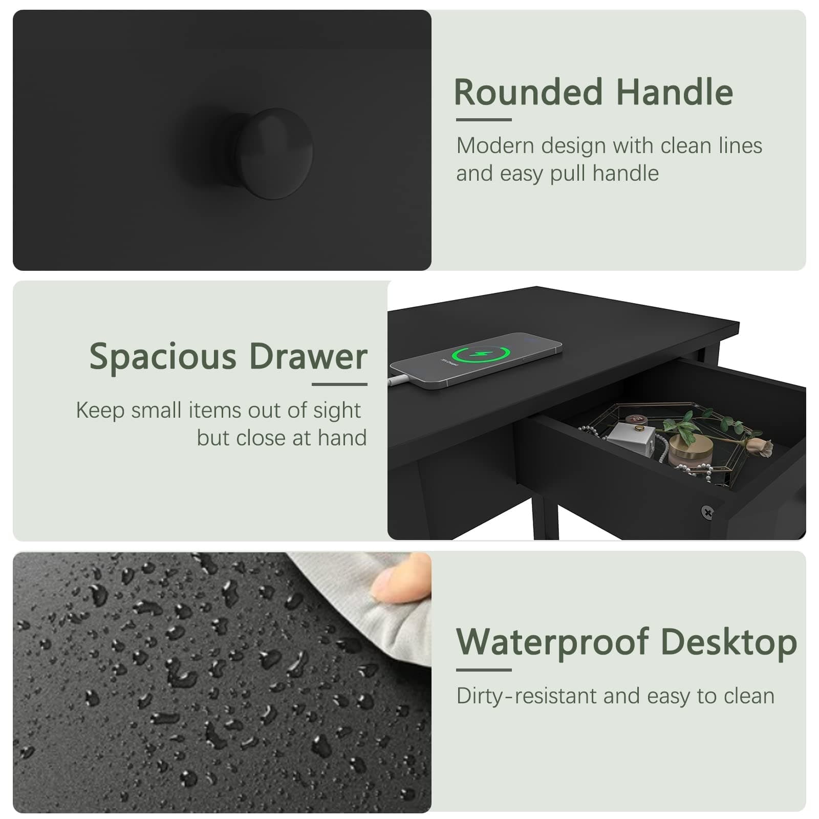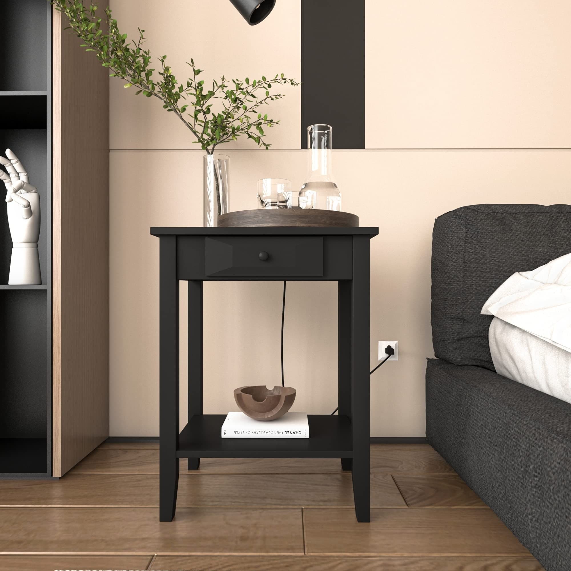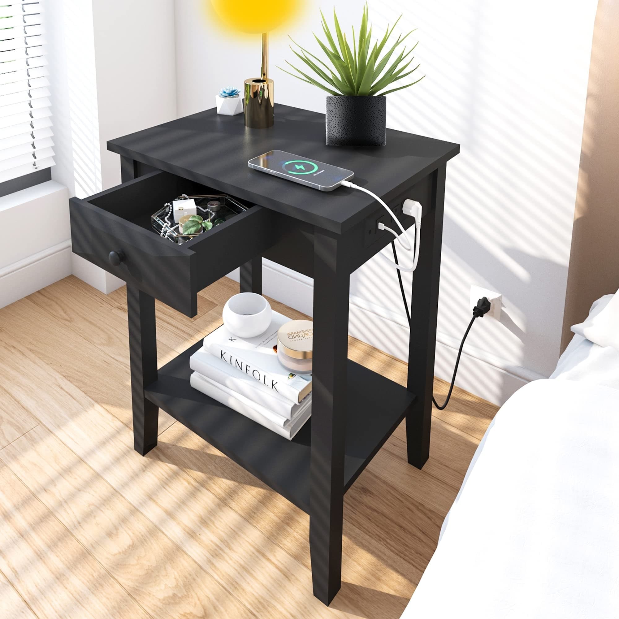 Nightstand with Charging Station, Solid Wood End Table with USB Ports and AC Power Outlets, Bed Side Table