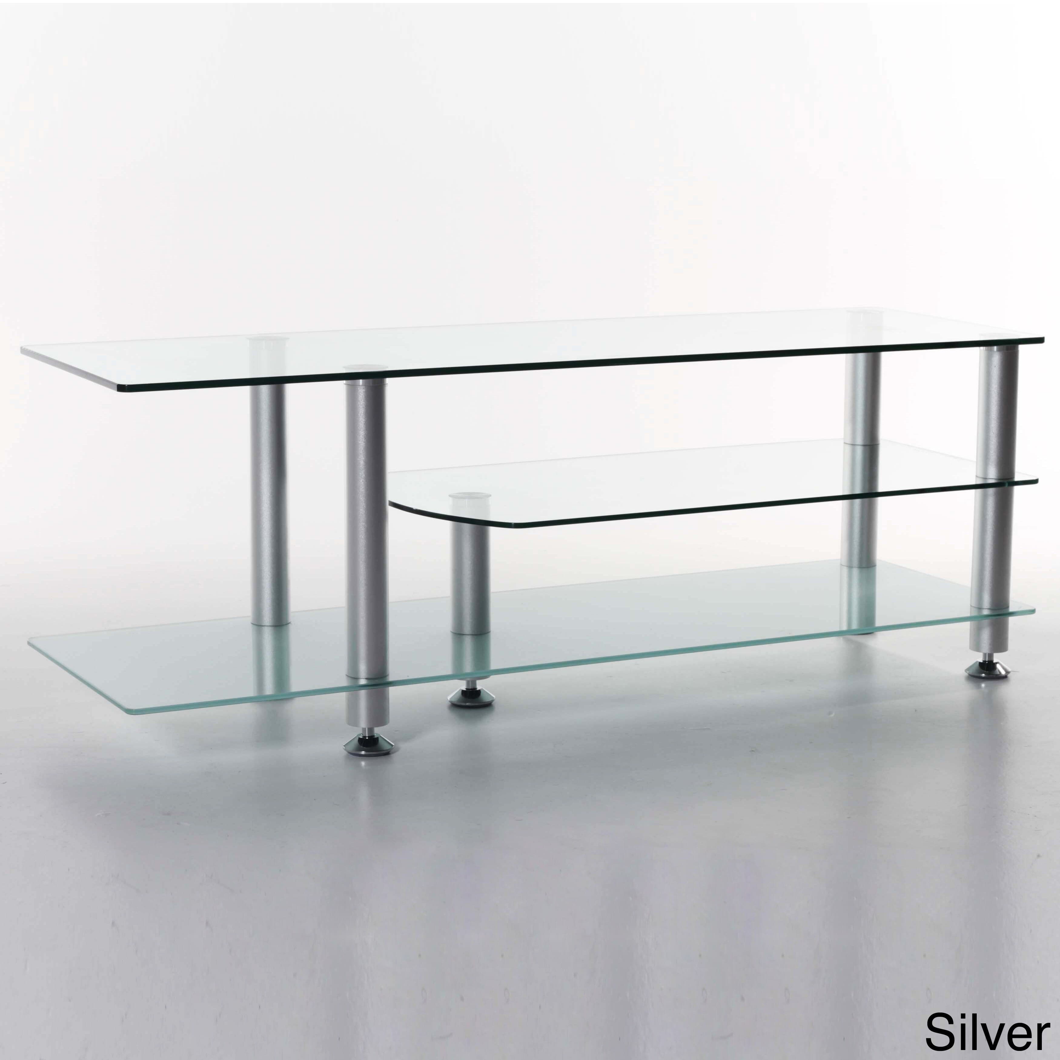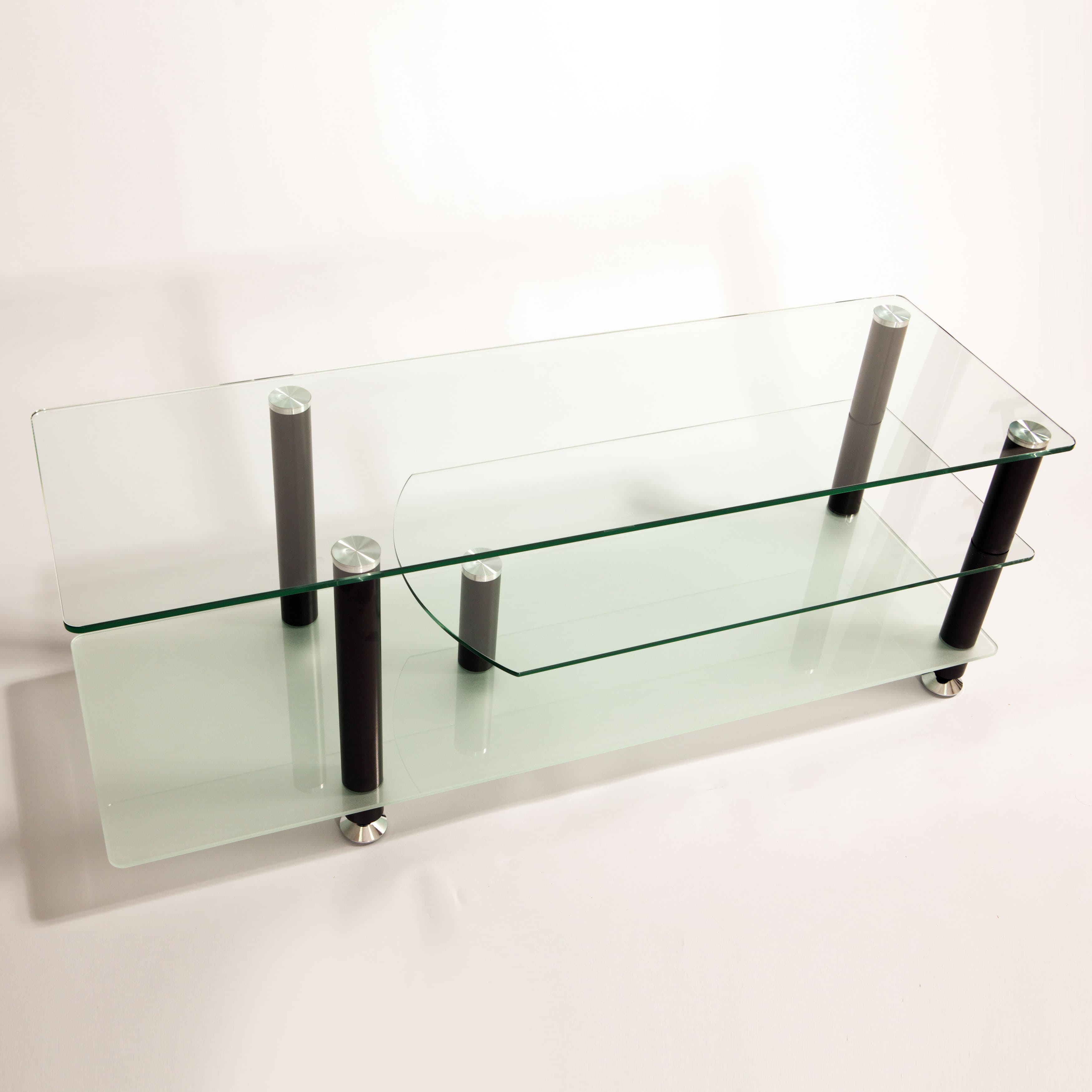 The Rocket Glass TV Stand adds a sophisticated touch to any living room space. It features a tempered clear glass top and a frosted glass bottom shelf, providing a stylish and elegant look.