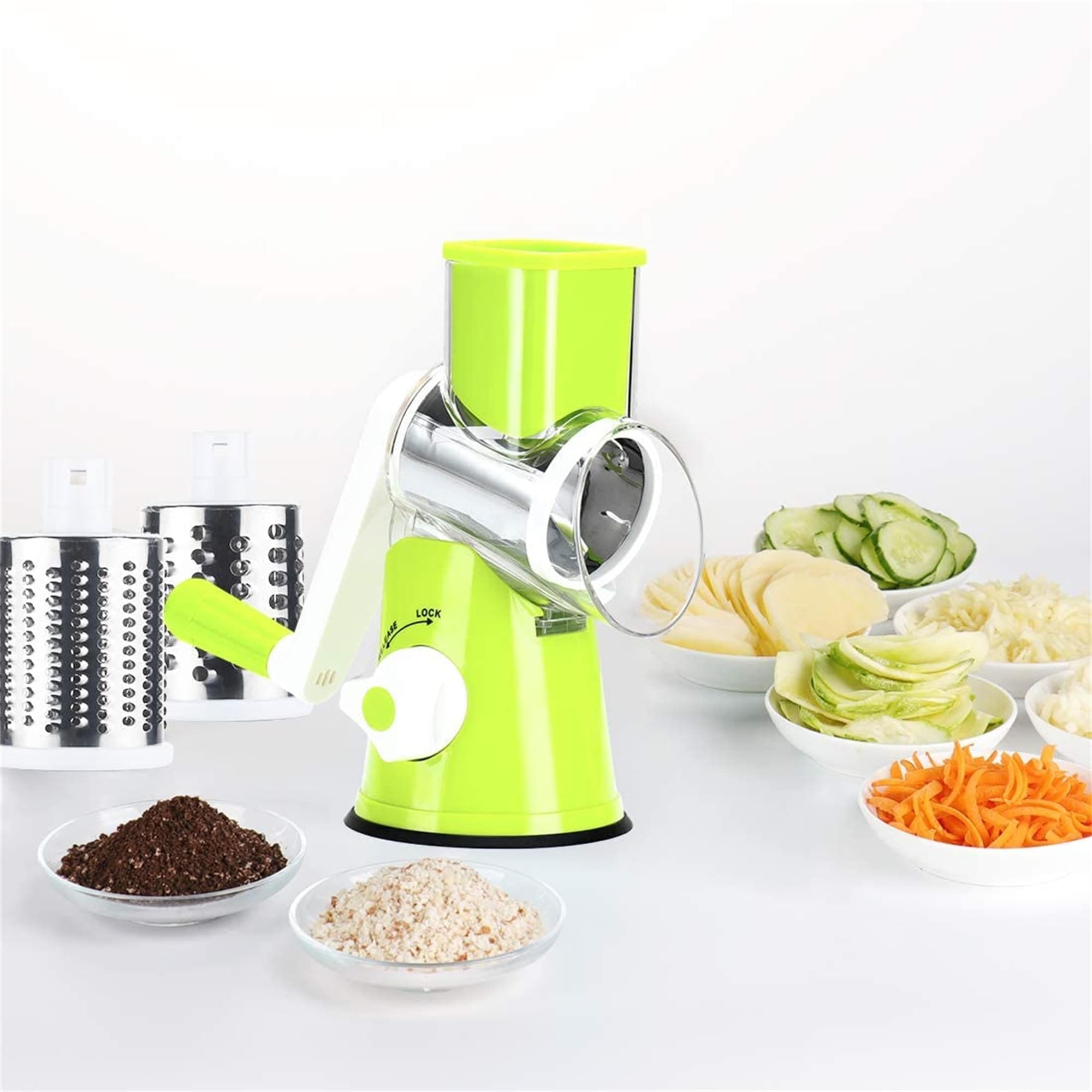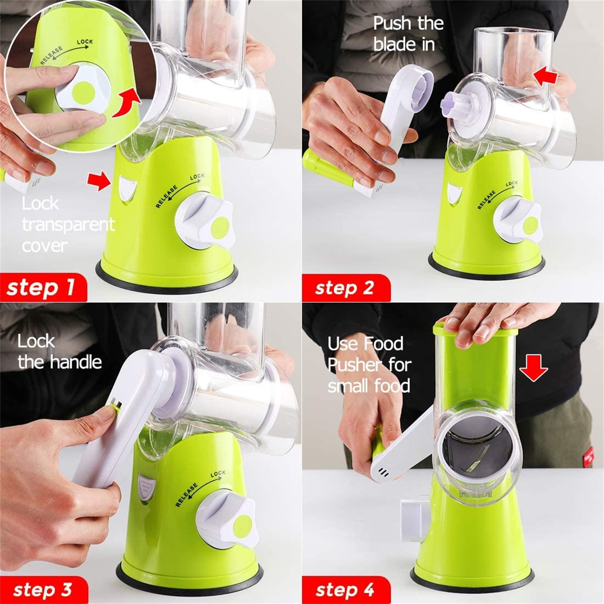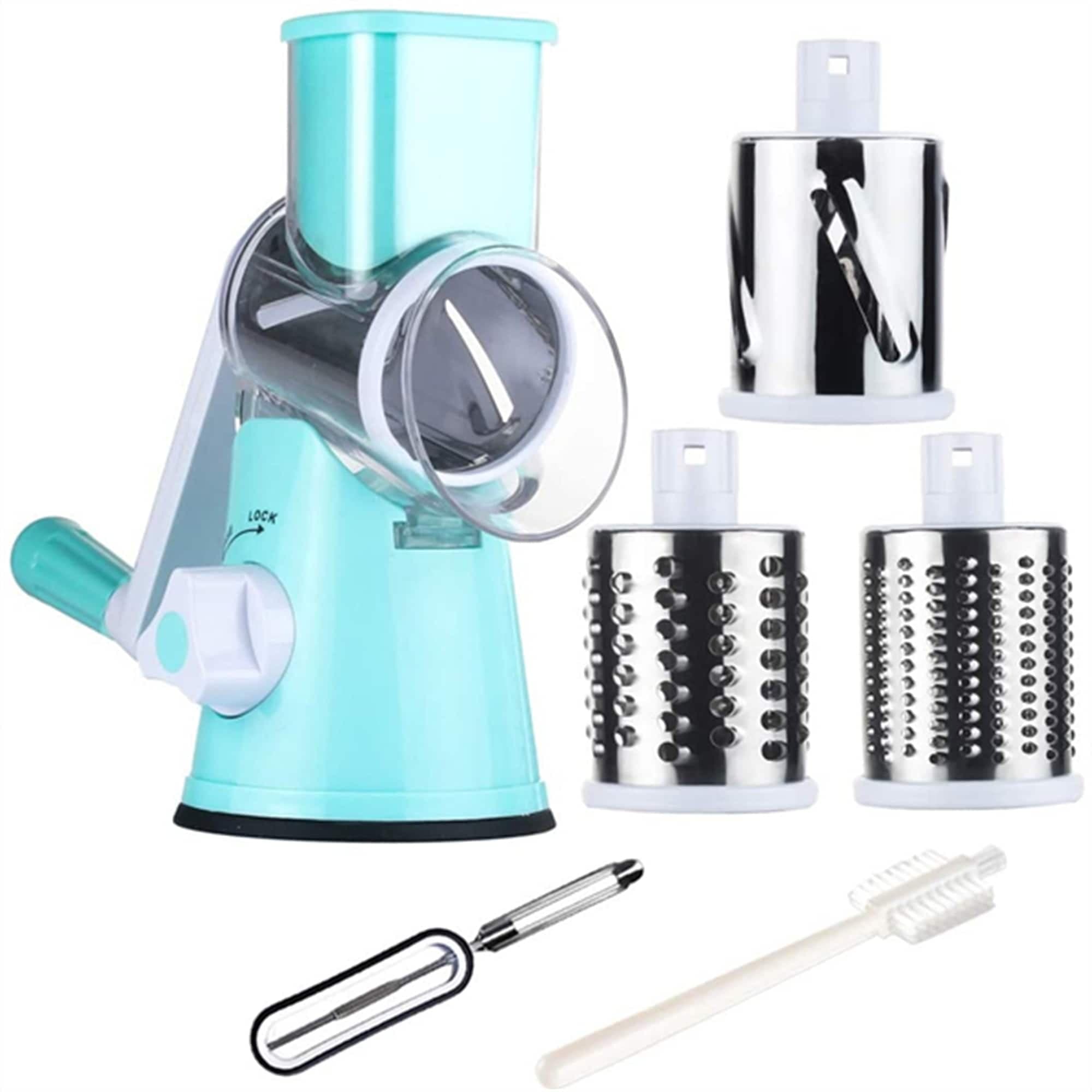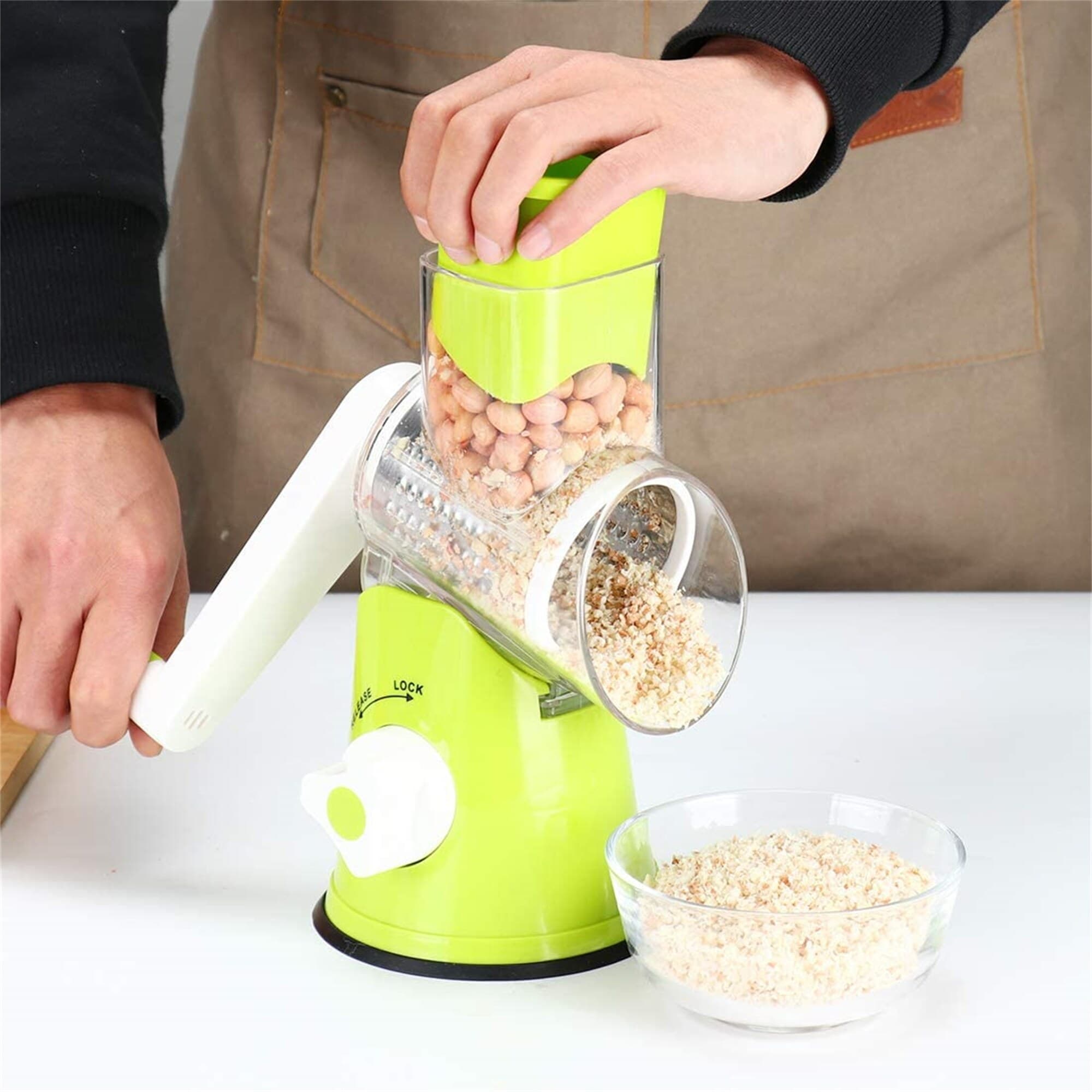 This cheese grater is made from high-quality stainless steel and BPA-free plastic. Safe to use with no electricity needed, it keeps hands and fingers away from blades. Strong suction non-slip base keeps the grater stable on a clean and smooth surface, making chopping easier and faster. This hand crank grater is great for cutting cheese, vegetables, potatoes, nuts, onions, cucumbers, carrots, salad, and pizza toppings.