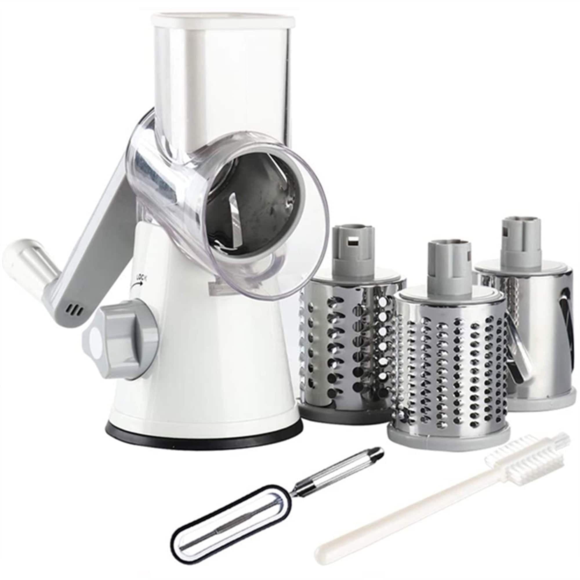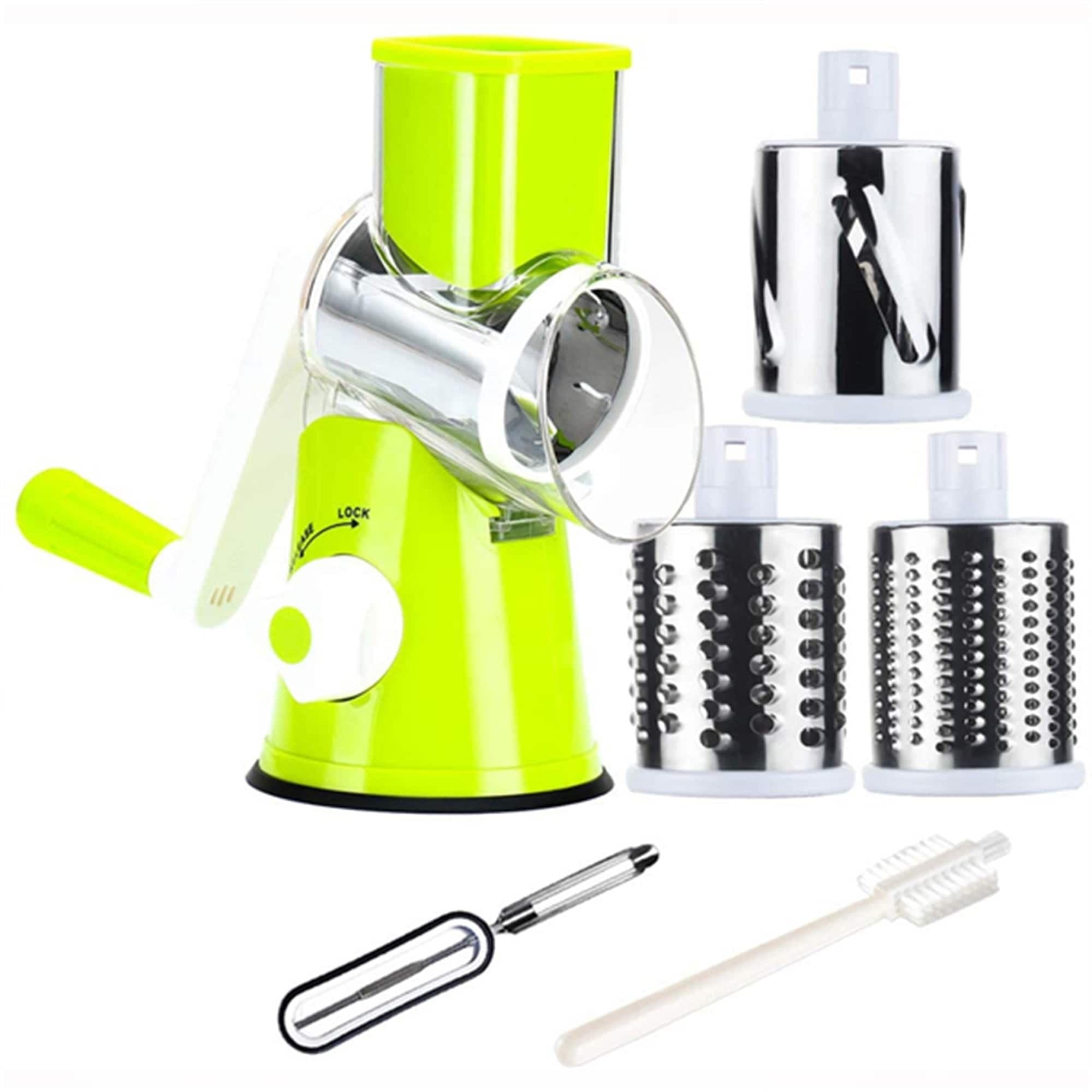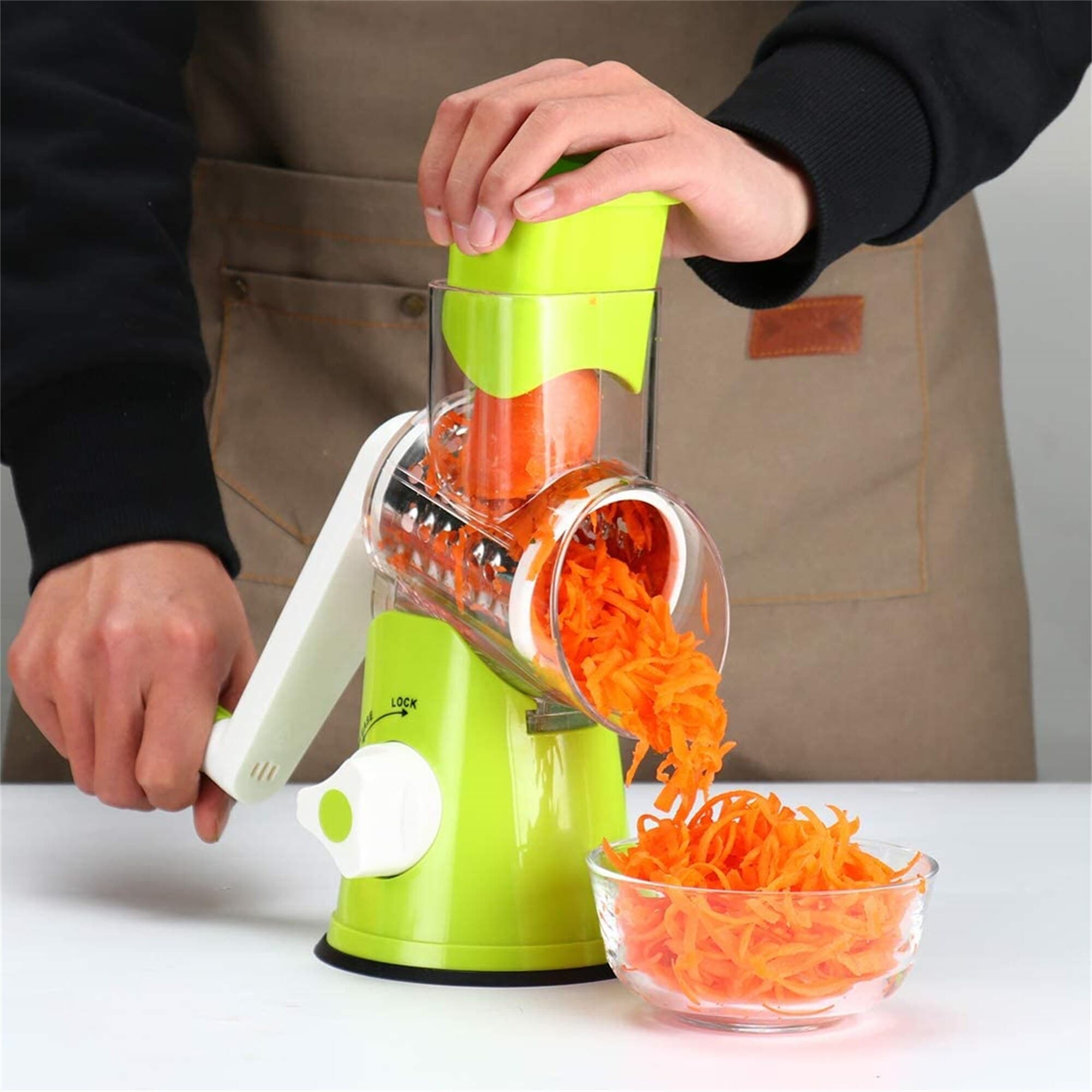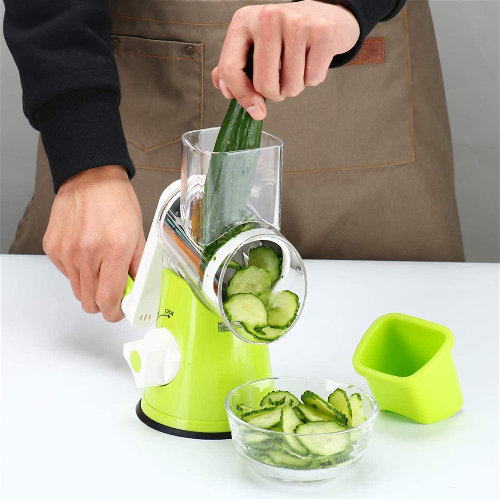 This cheese grater is made from high-quality stainless steel and BPA-free plastic. Safe to use with no electricity needed, it keeps hands and fingers away from blades. Strong suction non-slip base keeps the grater stable on a clean and smooth surface, making chopping easier and faster. This hand crank grater is great for cutting cheese, vegetables, potatoes, nuts, onions, cucumbers, carrots, salad, and pizza toppings.