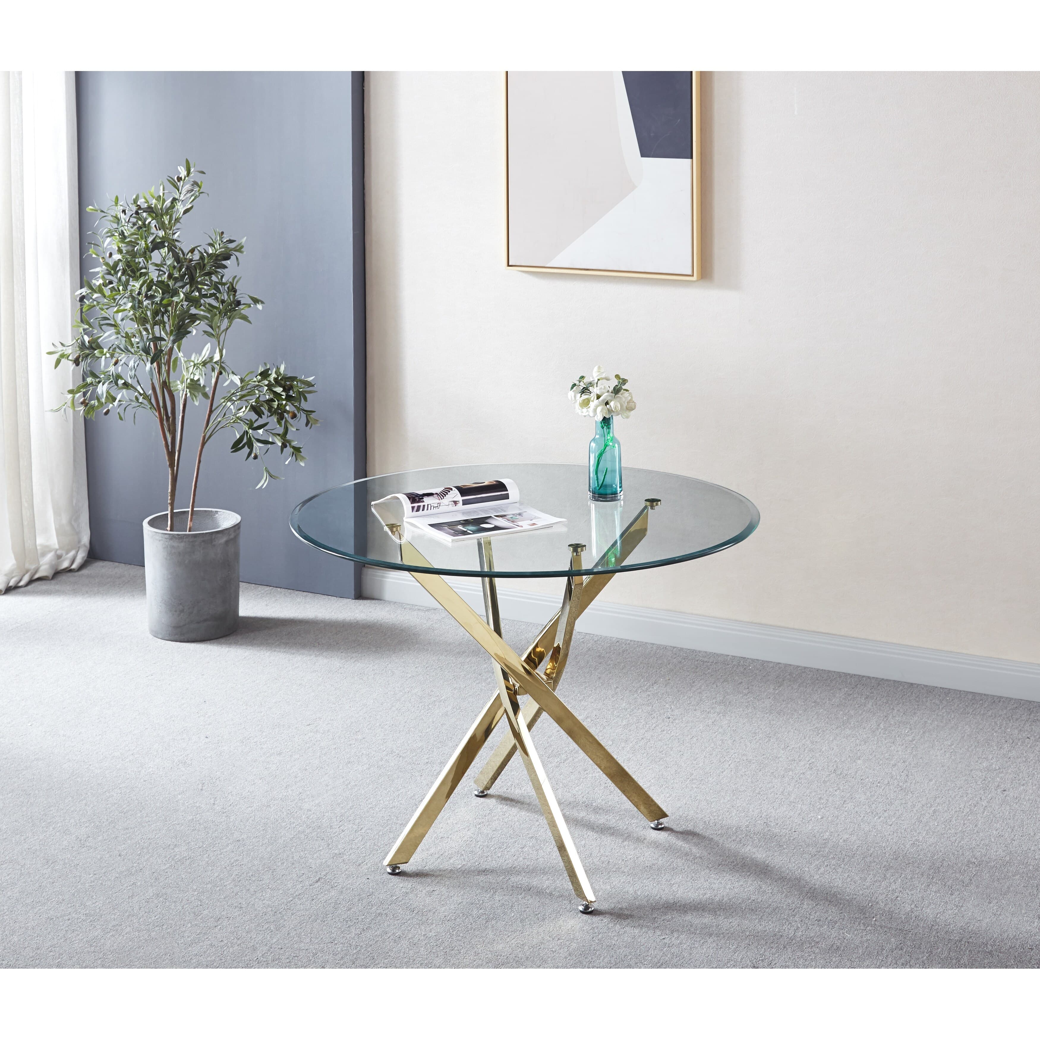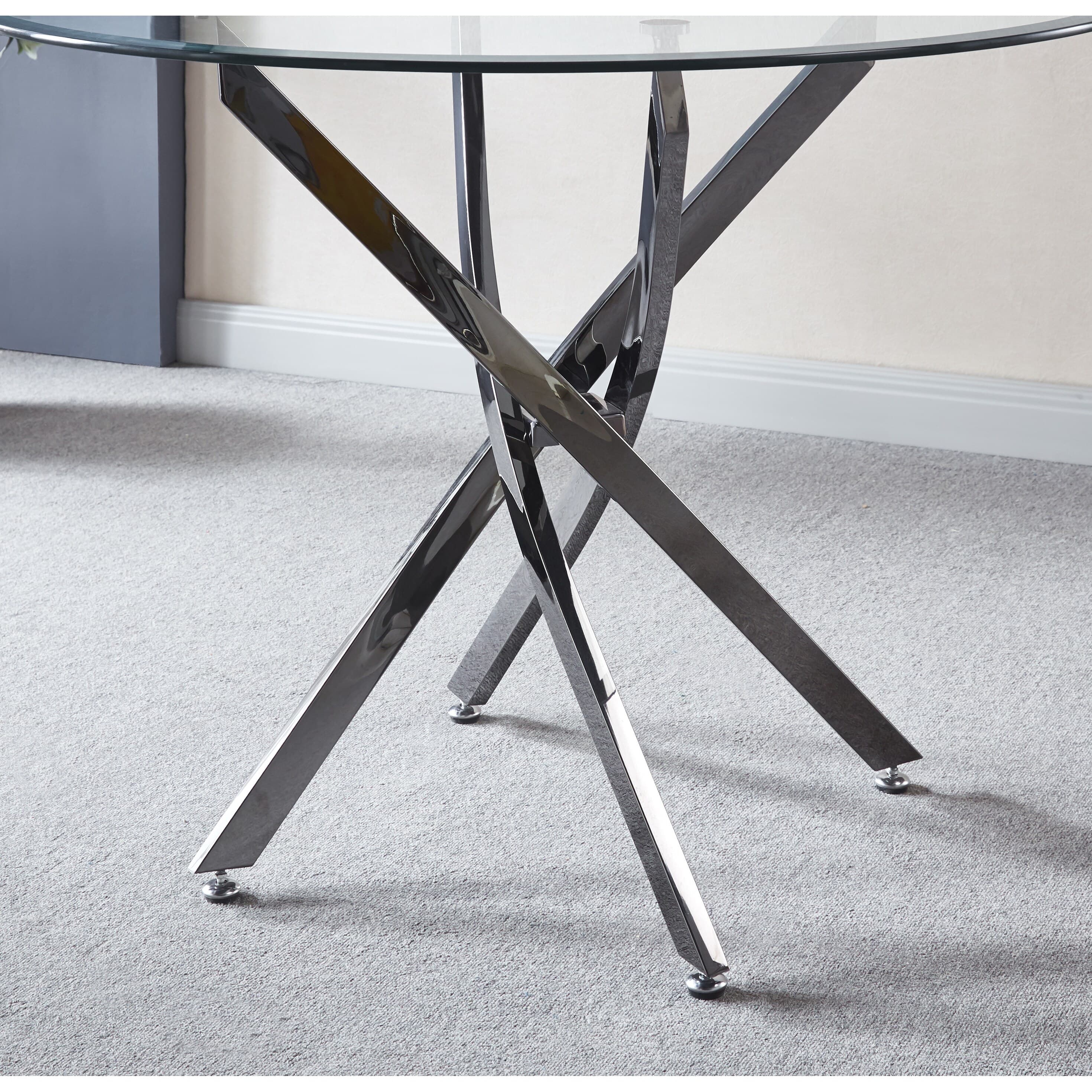 Enhance your dining room with this circle tempered glass table, featuring a stylish base and wide surface. The trestle base is made of stainless steel with four overlapping legs in a radial layout. A clear and 0.39" thick tempered glass top offers an easy-to-clean surface. Seats up to six for cozy dinners or casual gatherings. Partial assembly needed: simply attach the legs. Advantages include a sturdy glass top that is resistant to damage, durable stainless steel legs with a stylish look, and a 39-inch diameter that's perfect for young families. Includes only the table. No chairs or benches are included.