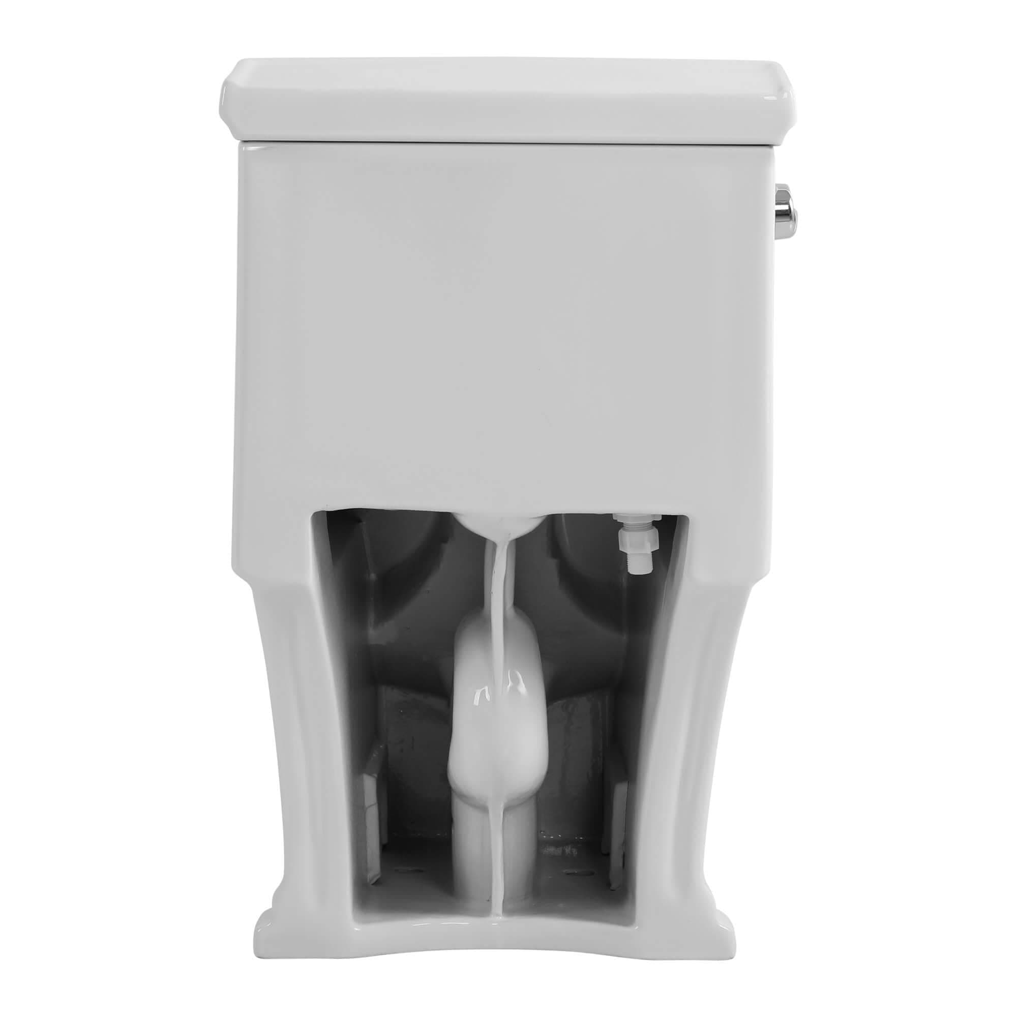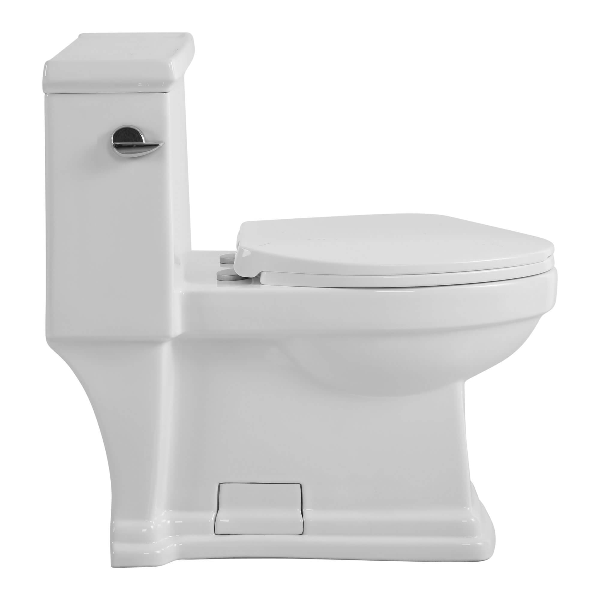 Fine Fixtures toilets offer top-notch quality with options in one- and two-piece styles. The sharply modern one-piece designs, alongside the smooth and classic two-piece styles, ensure maximum comfort in any bathroom. Its glazed surface discourages the buildup of bacteria, mold, and odors. Featuring an R&T cUPC certified water flush valve, a rounded siphon action bowl, and a fully-glazed trapway, it offers optimal performance. The toilet includes a slow-closing seat cover, a sanitary dam, and is ADA compliant, making it high-efficiency with a 4.8 lpf/1.28 gpf rating.