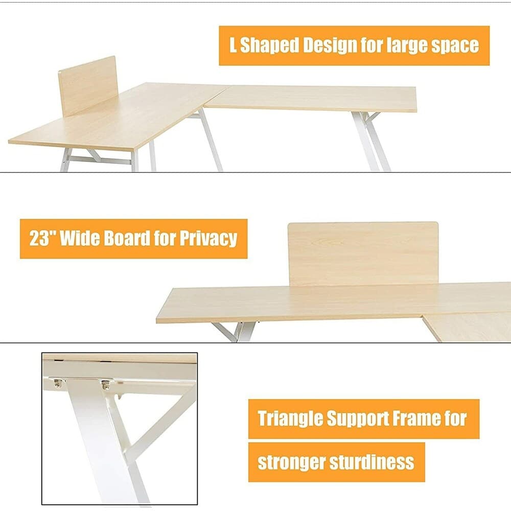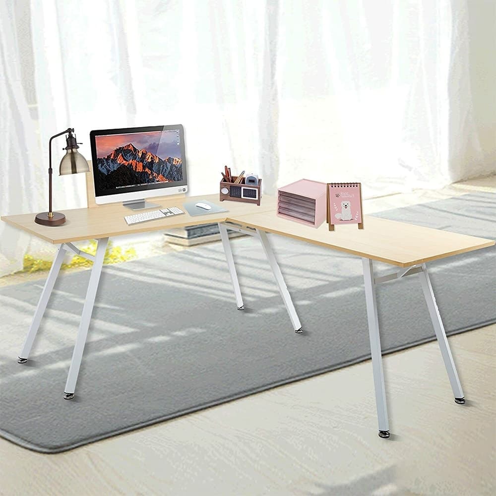 Enhance your workspace with the Brown L-Shaped Corner Computer Desk. Its expansive desktop (59" L + 67" L) x 23.5" W) offers plenty of space for keyboards, monitors, and paperwork. Supporting up to 220lbs, it features an anti-scratch MDF desktop and a robust metal frame. Six metal legs with adjustable feet ensure stability on uneven surfaces, while allowing ample space beneath. Assembly is straightforward with included instructions and hardware.