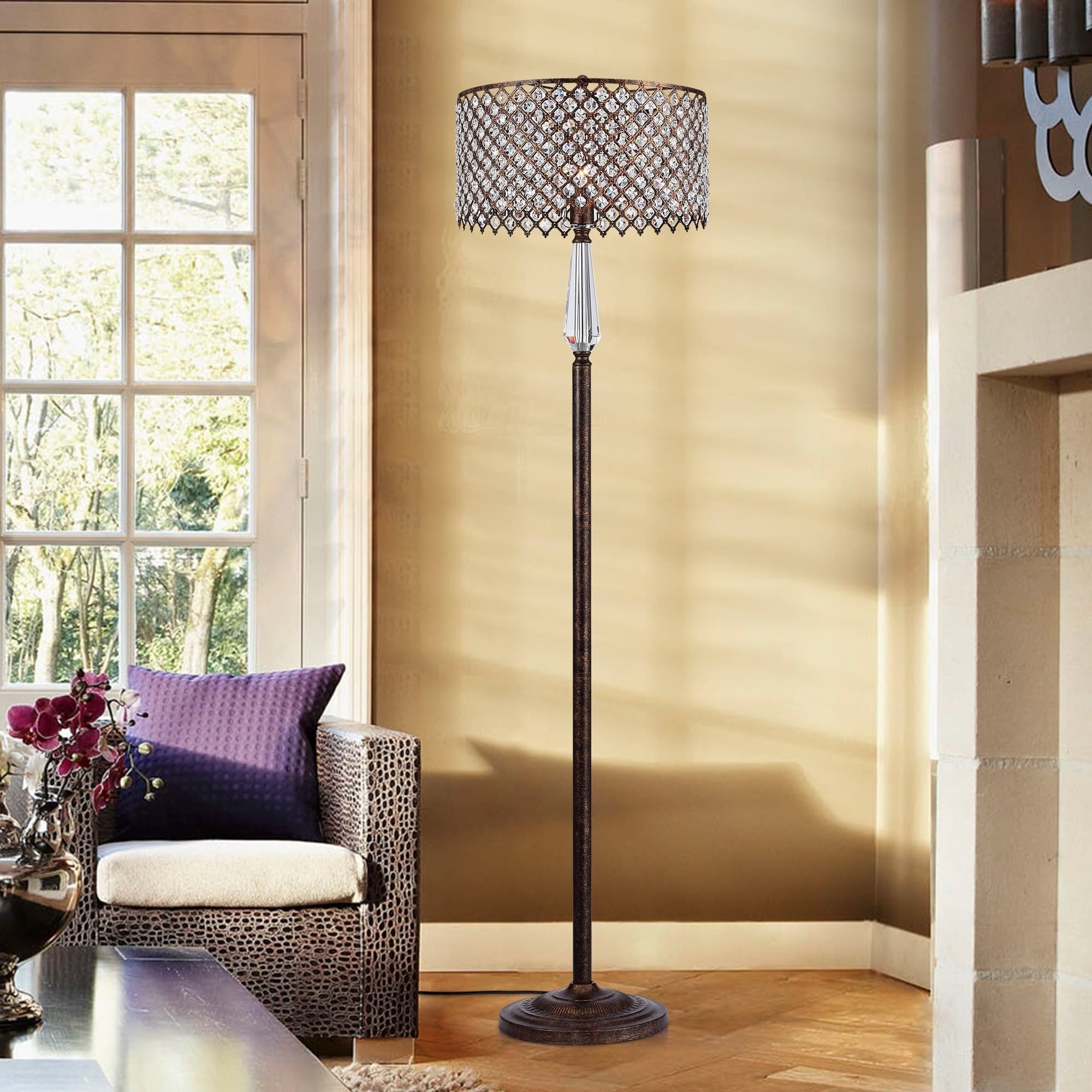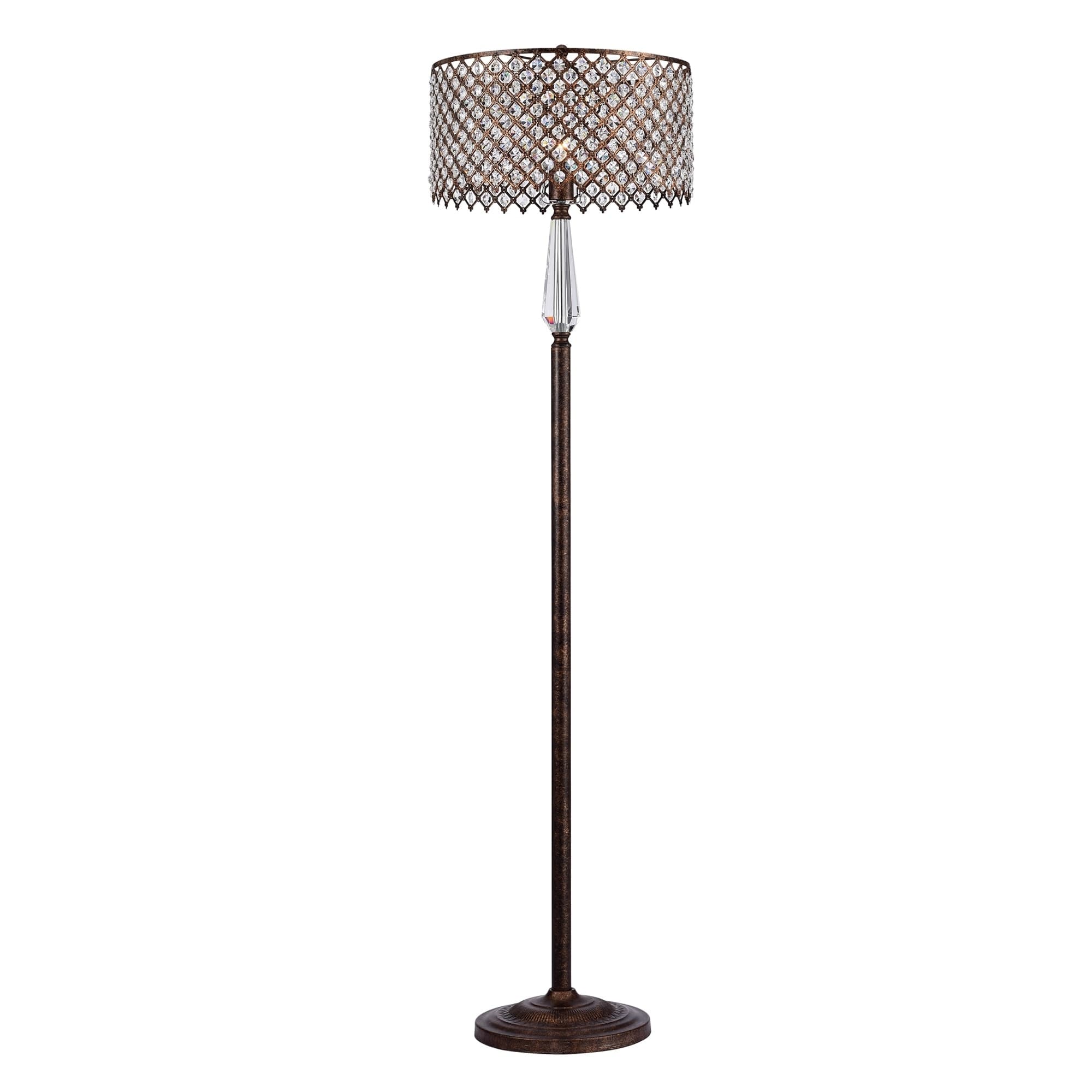 Illuminate any room with this crystal floor lamp, perfect for low-ceiling spaces. This lamp brings the grandeur of a chandelier in a convenient floor design. A crystal-embellished metal cage shade refracts light for sparkling effects, complemented by a rustic bronze finish for added warmth.