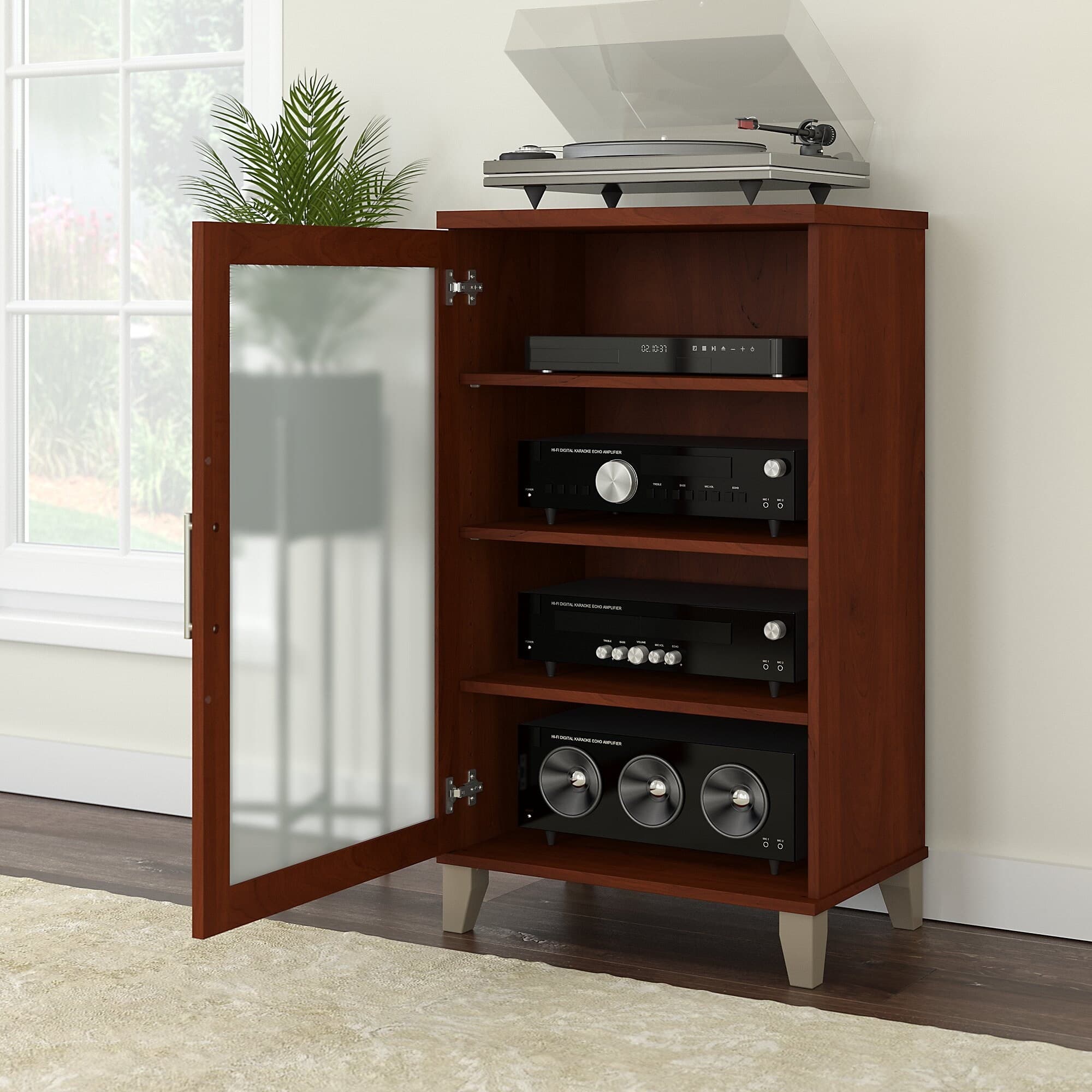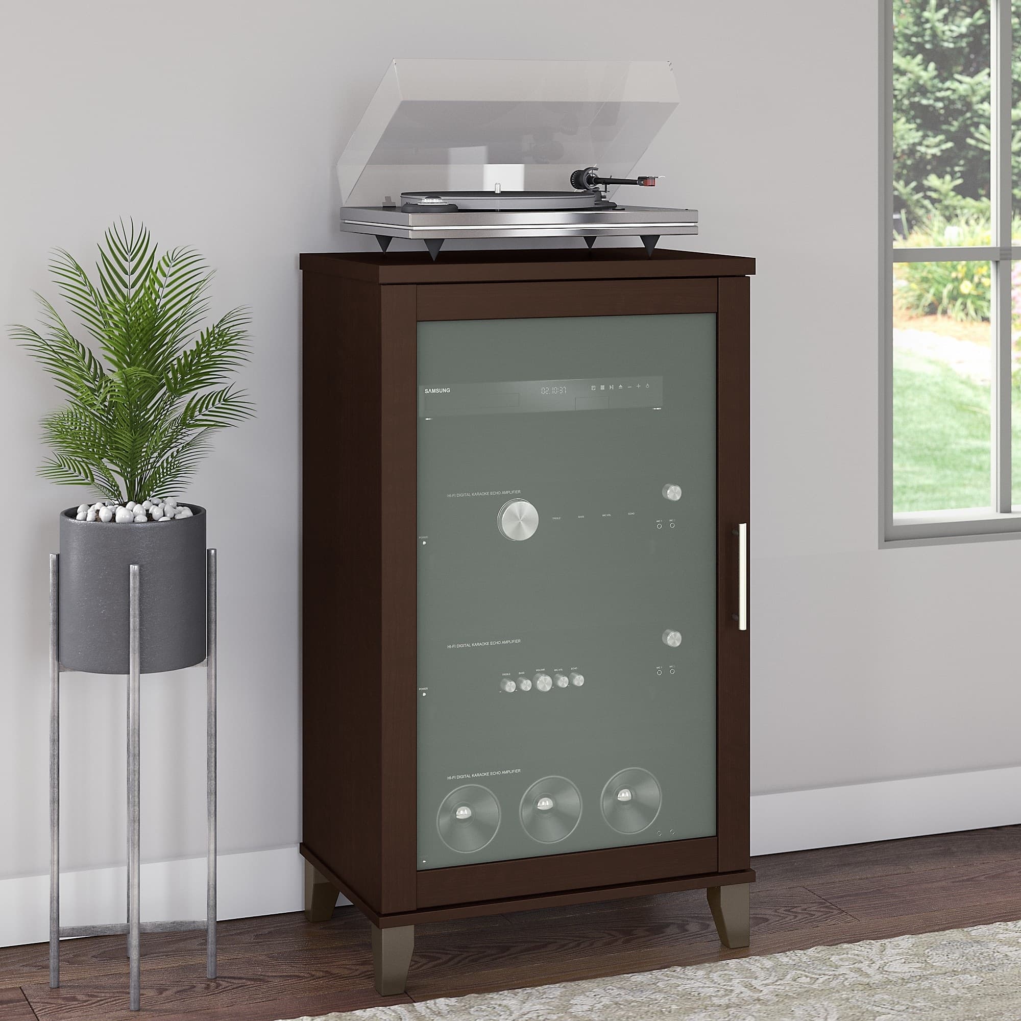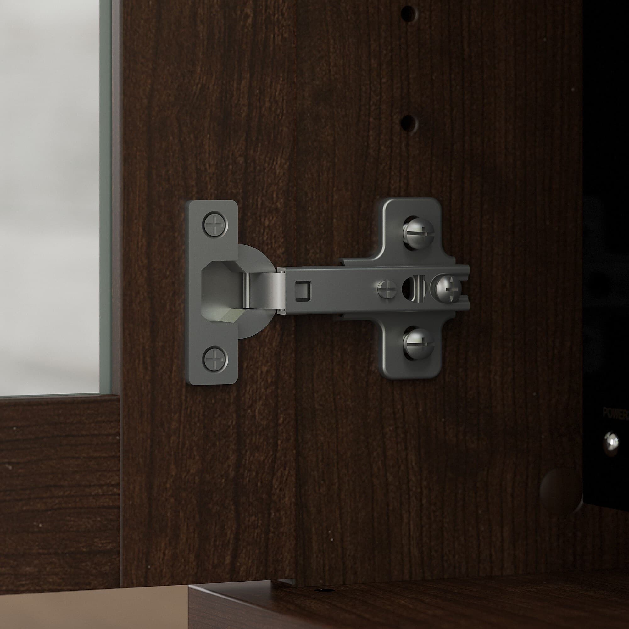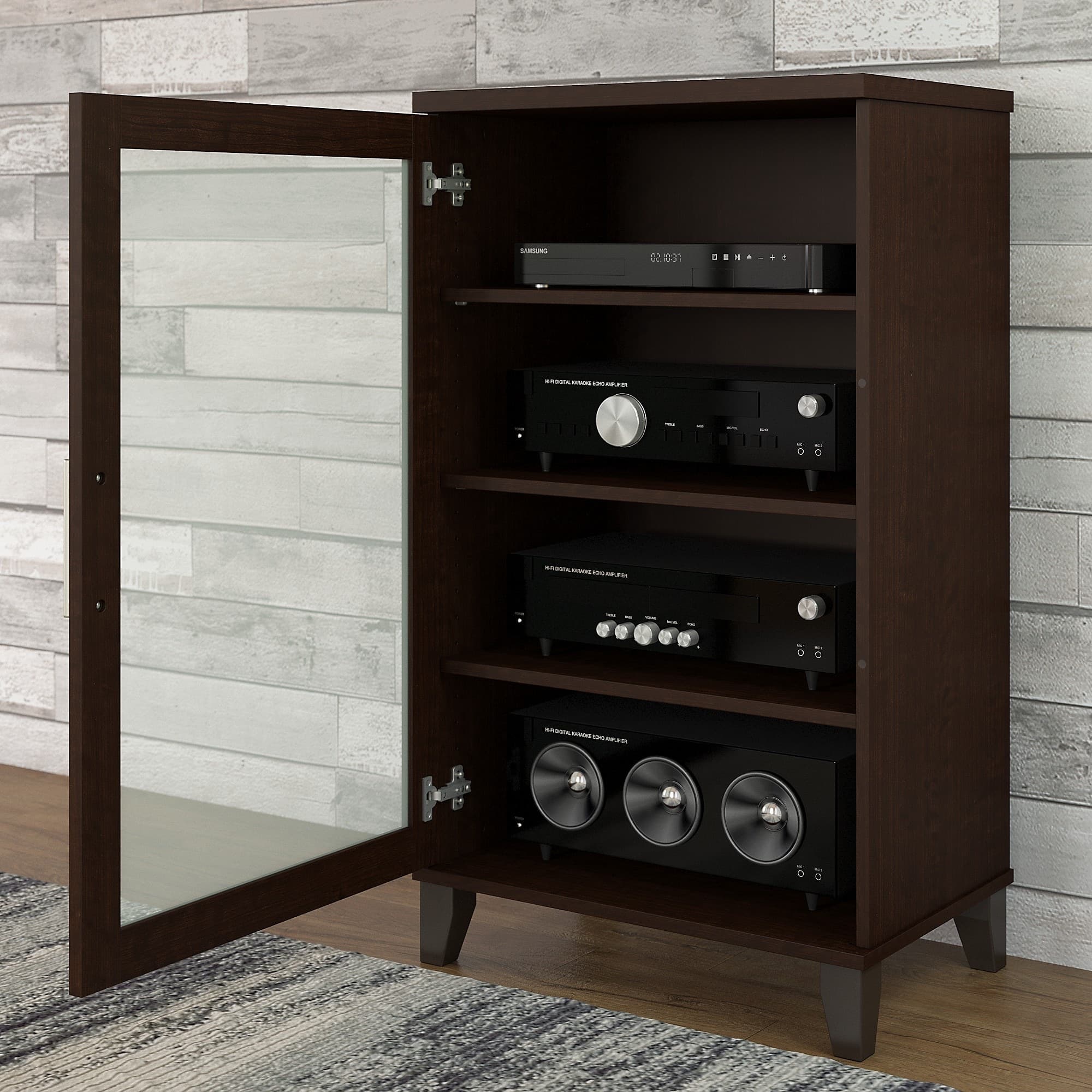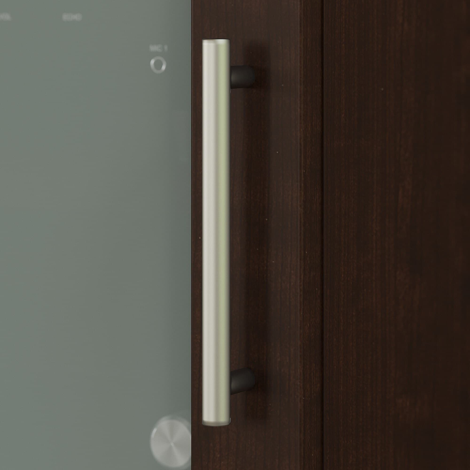 Enhance your living space with the mocha media cabinet. The frosted glass door, with its Euro-style hinges, reveals one fixed and three adjustable shelves. Each can support up to 40 pounds, making it ideal for holding a stereo, record player, DVD player, gaming console, and more. The back panel features cutouts for wire management, keeping cables organized.